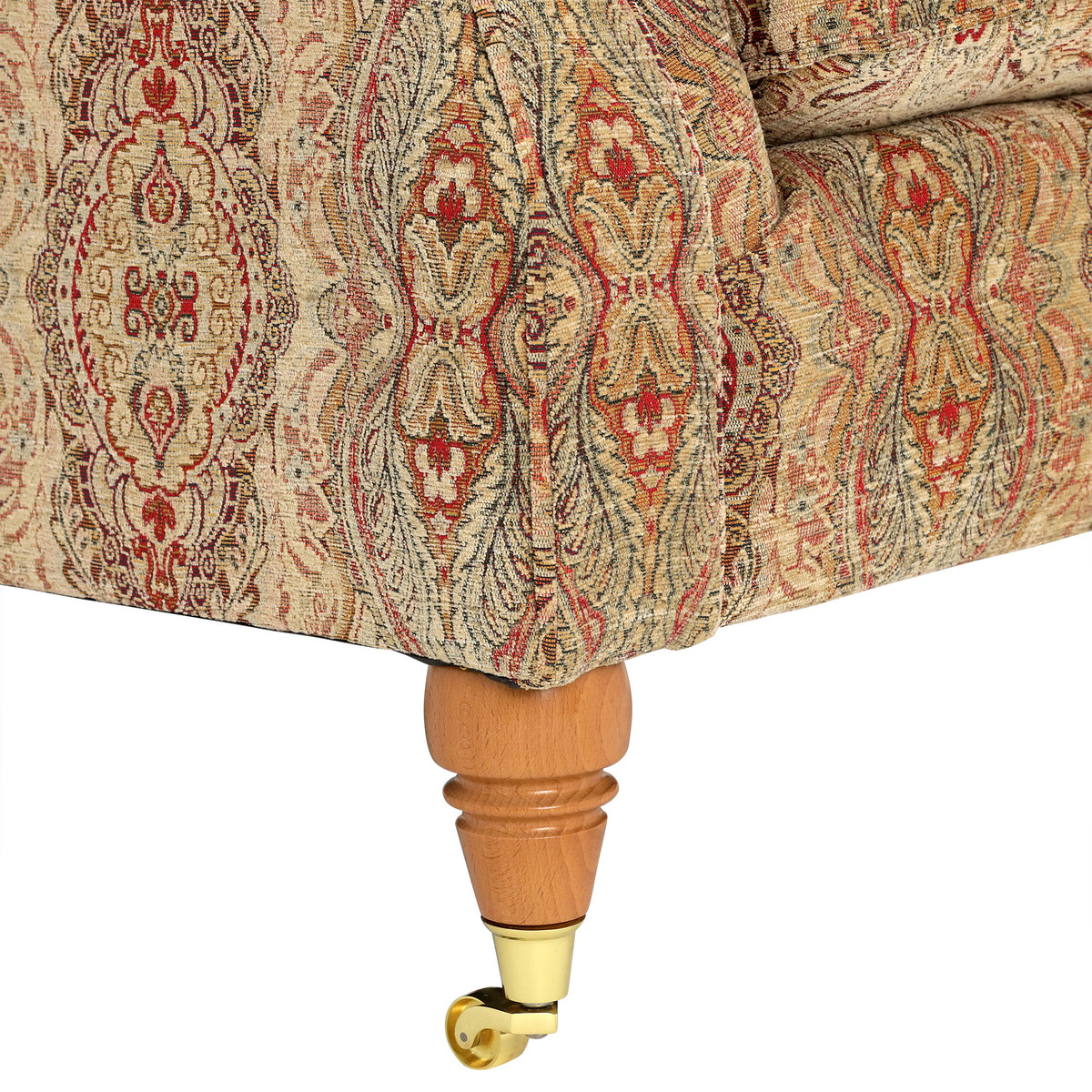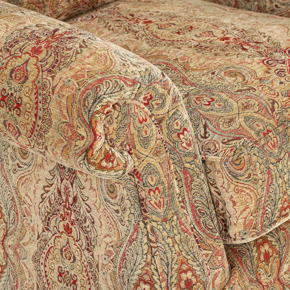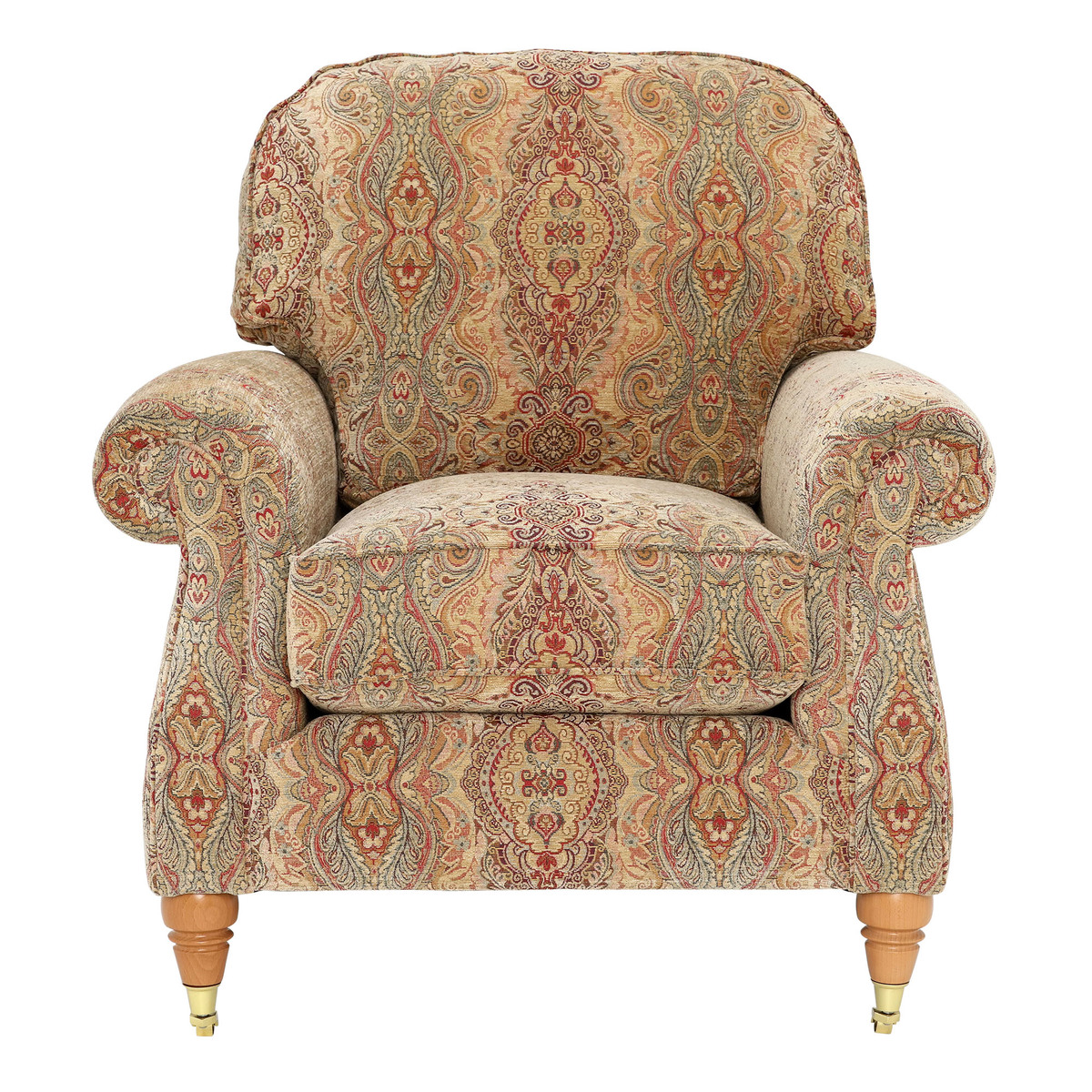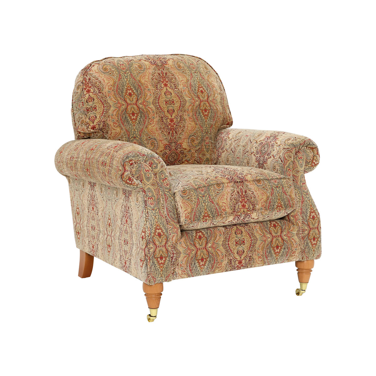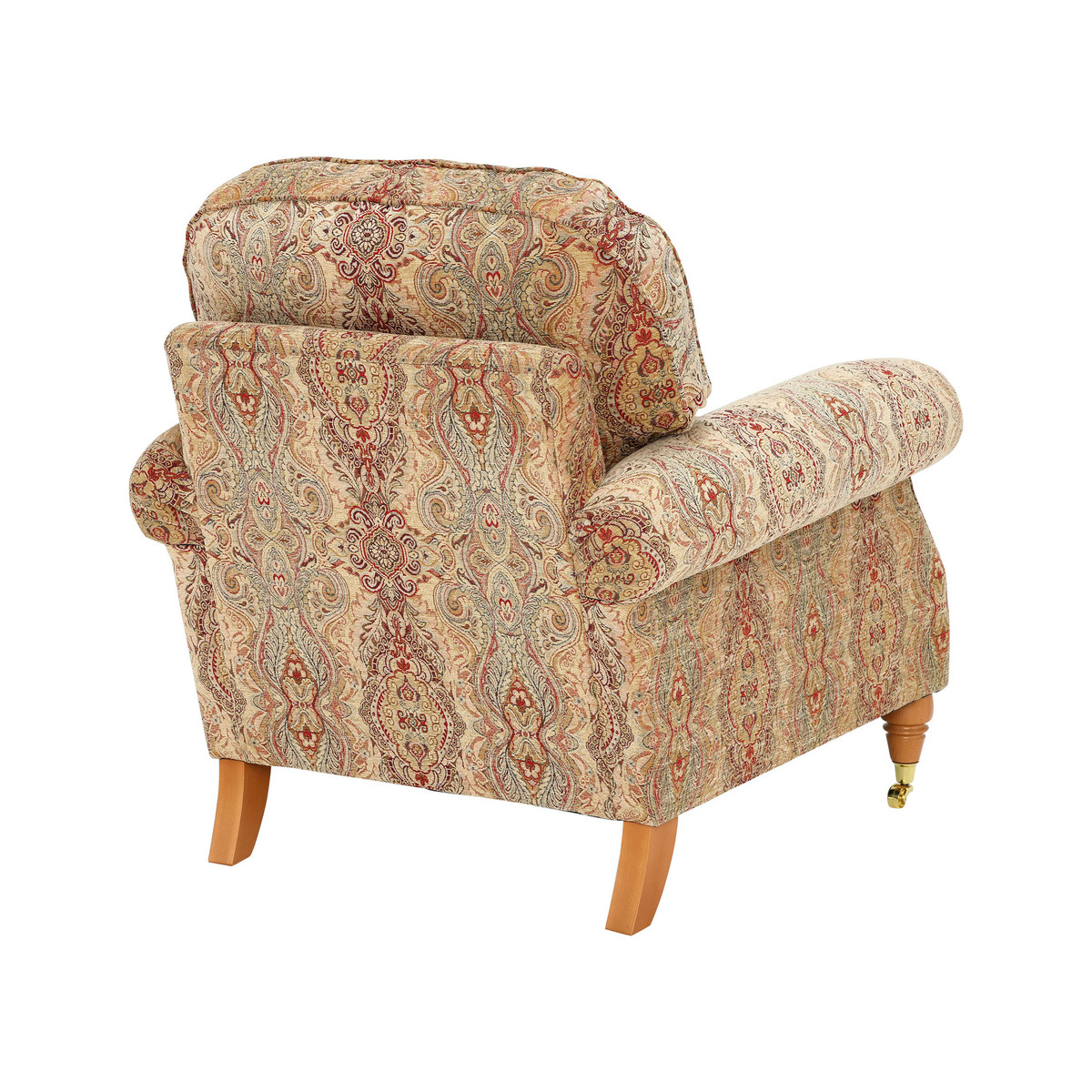 I love this armchair for its classic charm and timeless appeal, making it a versatile addition to both traditional and eclectic interiors. The patterned fabric adds visual interest without overwhelming a space, so it works well in cosy living rooms or as a statement piece in a more neutral setting. For styling, consider pairing it with layered textures like throws and cushions in complementary colours to enhance its look. It also pairs nicely with wooden and vintage furnishings, holding its own as a statement piece while remaining practical and comfortable. This chair is ideal for those seeking a piece that combines heritage character with everyday comfort.
