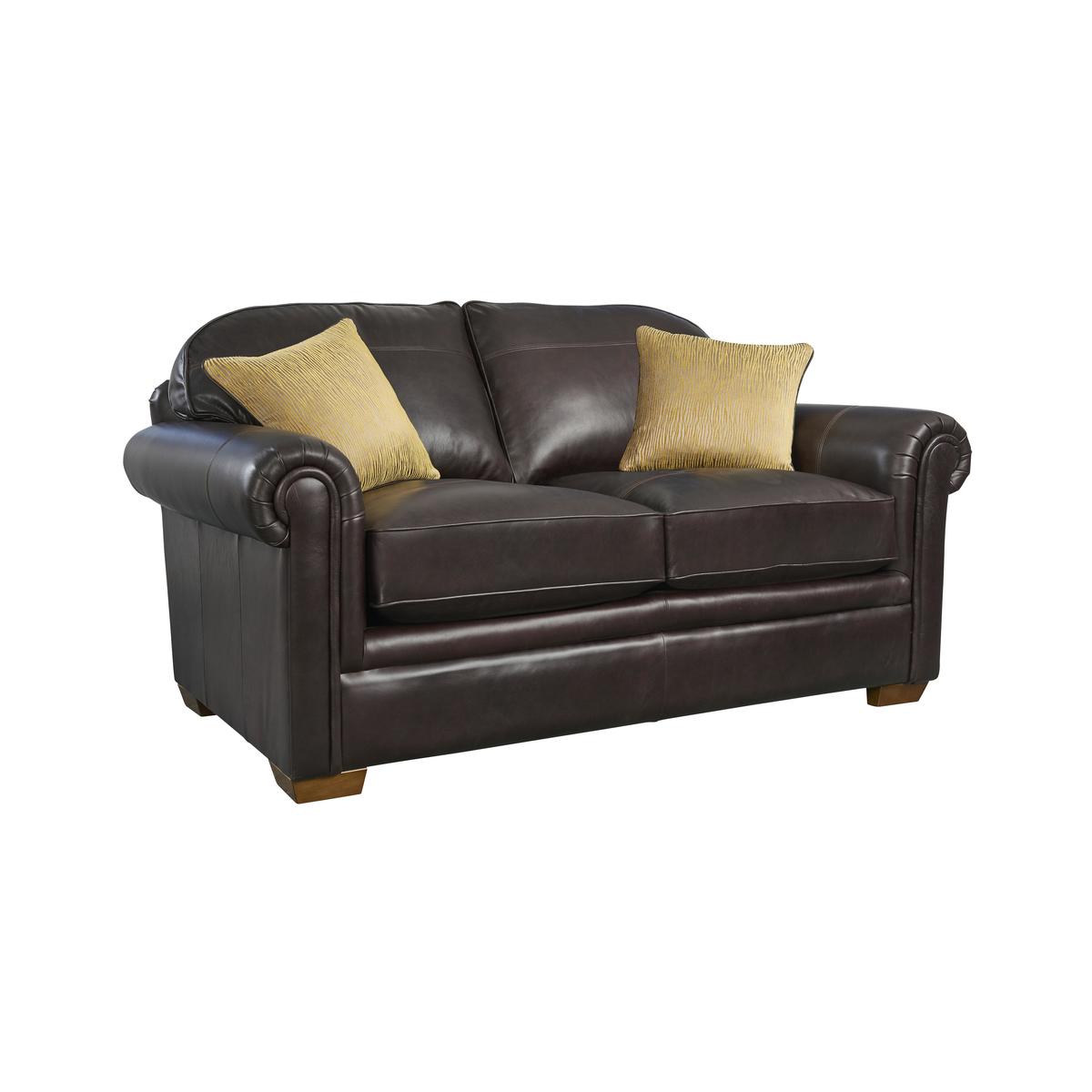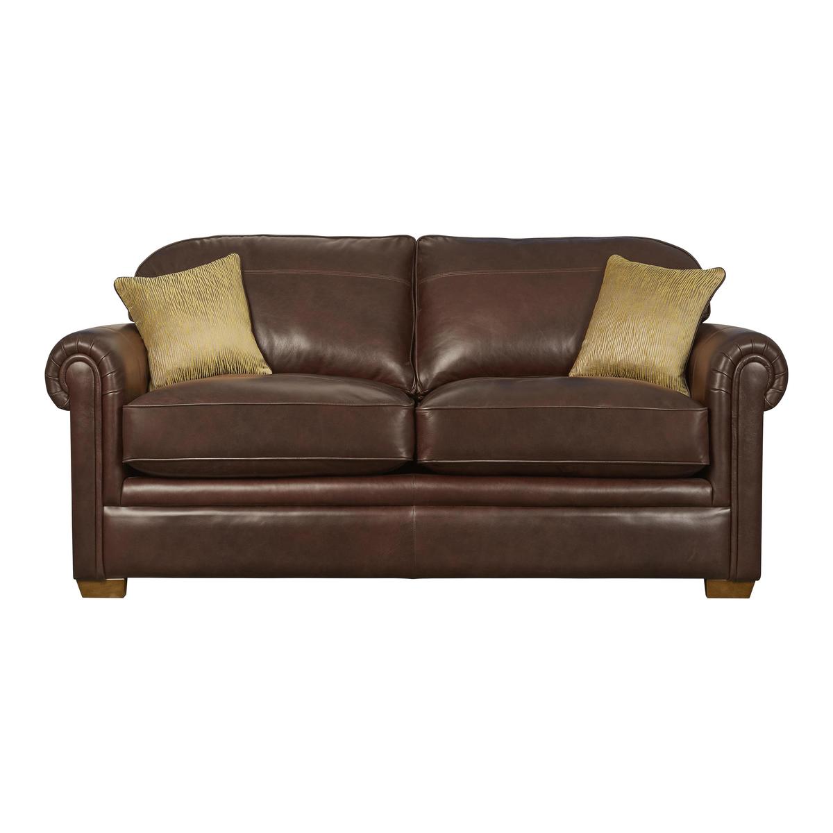 Classic meets contemporary in this 2 seater sofa from Parker Knoll. Upholstered in your choice of fine premium leathers. With signature scroll arms and deep, superbly comfortable seats. Innovatively constructed for the ultimate in ‘cradle comfort’. Luxurious fusion fibre seat cushions on sprung seats. Timeless, archetypal style suits both classic and modern homes. Wooden feet in a vintage, vintage oak or washed oak finish. With two large feather and fibre scatter cushions included