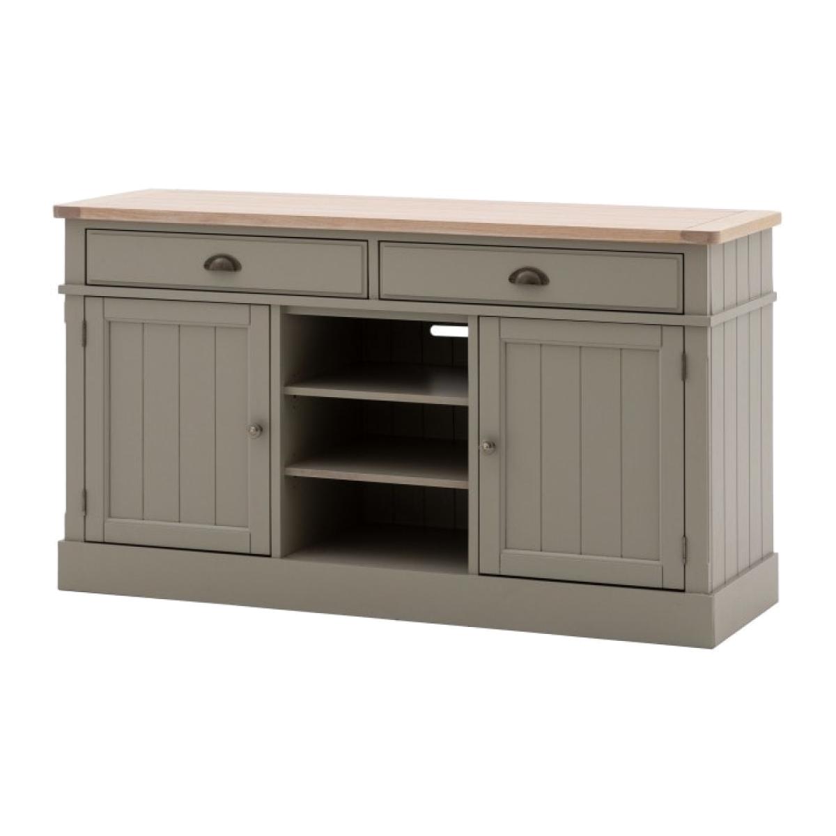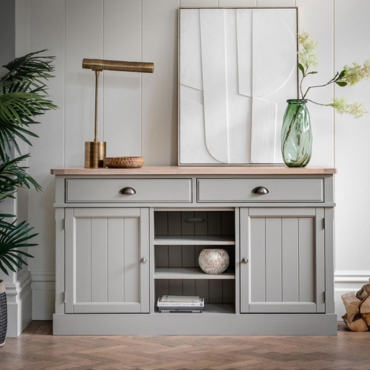 Ideal for the kitchens or dining areas, this sideboard offers practical storage with 2 drawers and 2 cupboards with adjustable shelves plus additional shelves in-between, the perfect spot for cookbooks. The hand painted subtly textured grooved doors, metal handles and grooved & planked oak top create a modern country feel perfectly suited to both rustic and contemporary interiors. Material:Oak / Pine / MDF. Colour/Finish: Prairie.