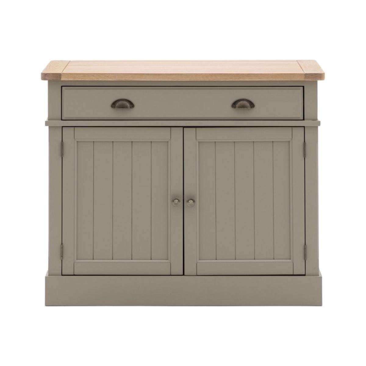 This sideboard combines traditional charm with contemporary style. Offering practical storage with a single large draw and 2 door cupboard with adjustable shelves, there’s plenty of storage space. The combination of the grooved & planked oak top with hand painted textured finish base, grooved doors and traditional style metal handles gives the sideboard a modern twist on a country classic style. Material:Oak / Pine / MDF. Colour/Finish: Prairie.