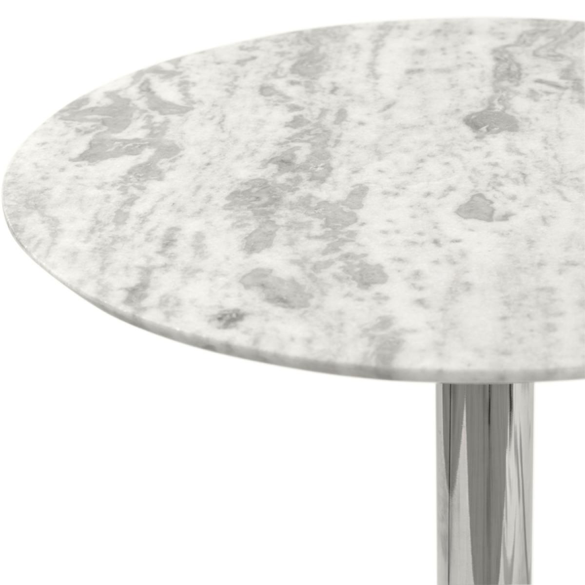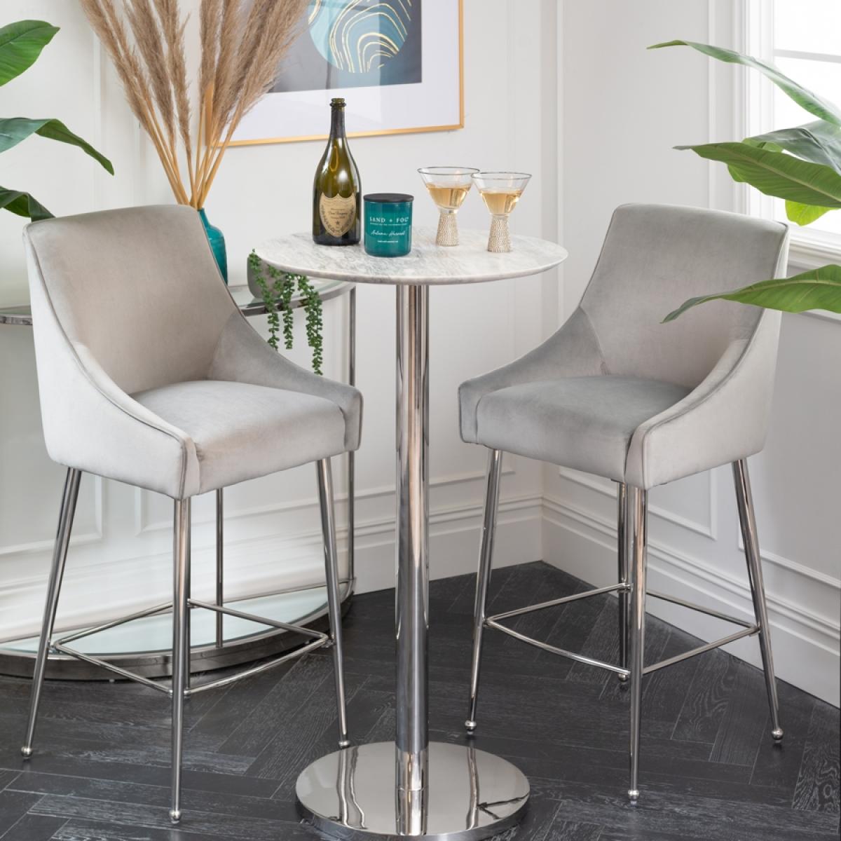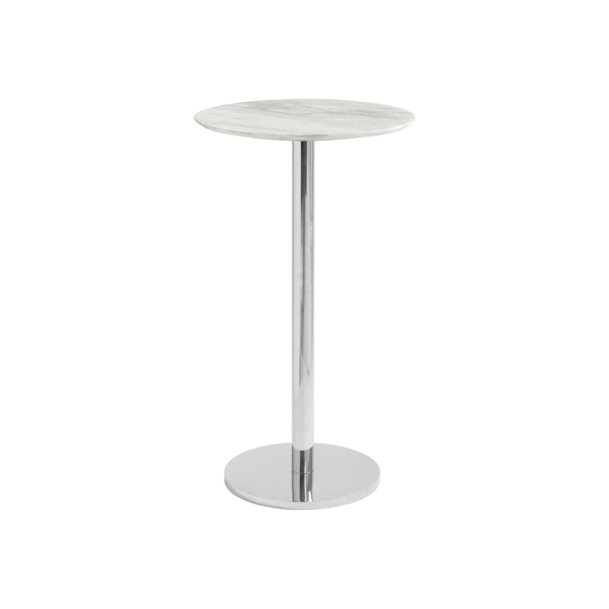 A timeless, classic bar table, height appropriate for any of our bar stools ( not counter stools). Weighted spun aluminium base with mirror polished finish. Solid marble top with painted wooden support to underside. Simple assembly required. Due to its natural formation every piece of marble is unique. There may be subtle differences in colour, tone and composition from the image shown. On occasions fissures may be present, these are natural characteristics and do not compromise the marble’s structural integrity. Wipe with a soft, dry cloth. Avoid using chemical based cleaners as these could damage the finish.