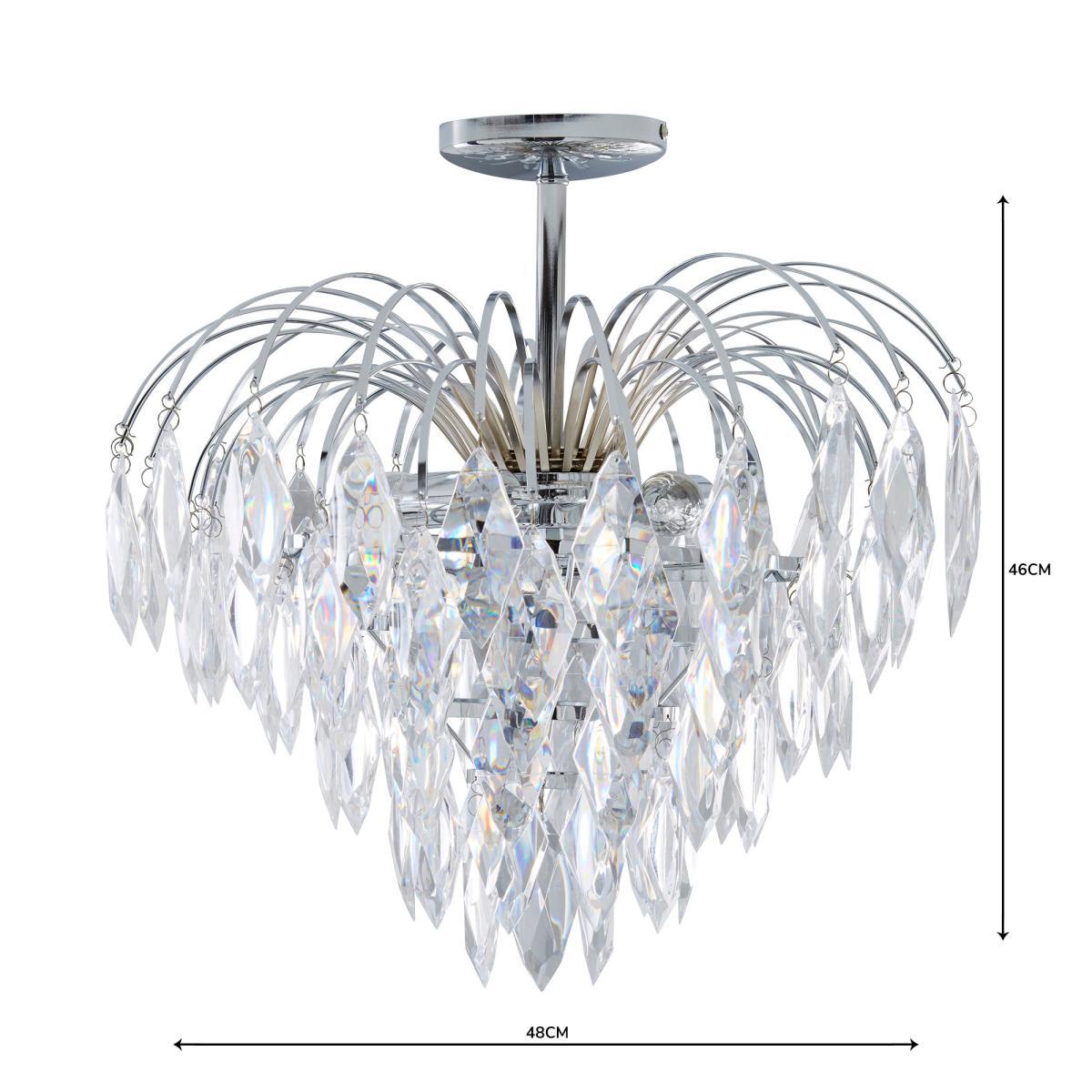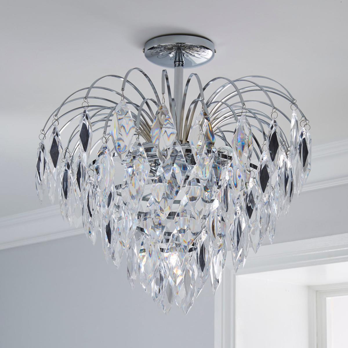 I love this piece because it combines the elegance of a chandelier with the practicality of a semi-flush fitting, making it versatile for a variety of interiors. The chrome finish adds a modern touch, while the jewel-like drops bring a subtle hint of glamour that works well in contemporary spaces or even in more traditional rooms needing a refined update. It’s best styled in rooms with high ceilings to fully showcase its design, but it can also serve as a statement piece in feature areas like a dining room or entrance hall. For a balanced look, pair it with neutral colour schemes and minimalist furniture to let the light-catching details shine, or add bold accents for a more lavish feel.