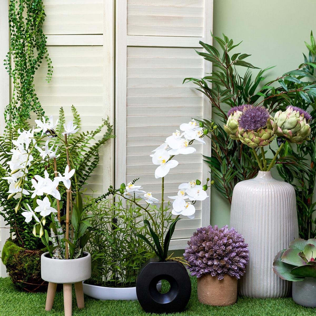 I love this little orchid because it offers a fresh, natural touch without the fuss of maintenance. It works well in modern or minimalist interiors where it can add softness and a bit of colour, or in a more contemporary setting as a subtle statement piece. Practical styling tips include placing it on a bedside table, windowsill, or grouping with other potted plants to create a decorative corner. Since it's artificial, it’s ideal for darker spaces or areas with less natural light, and it can be easily moved around to refresh your look without worrying about watering or fading. Its compact size makes it versatile for shelves, desks, or small side tables, giving your scheme a vibrant, lifelike touch effortlessly.