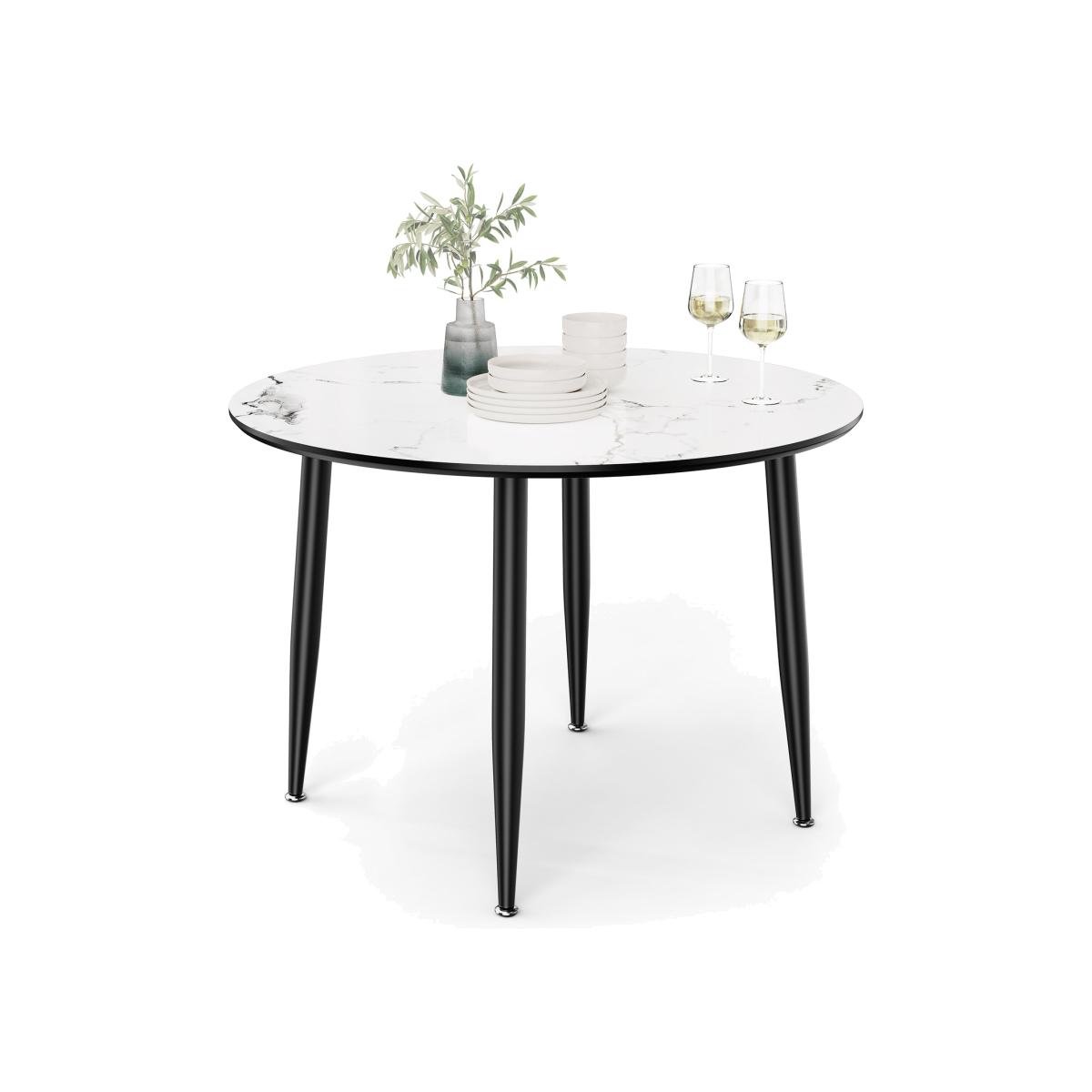 Stunning in its simplicity, the Von Haus dining table creates a chic centrepiece in any kitchen or dining room. Featuring an opulent marble effect top set on mid-century inspired tapered legs, add a high-end feel to your dining space: the perfect finishing touch to the modern home. Round Kitchen Table with Black Tapered Legs. Contemporary Dining Room Furniture. Dine in style with this monochromatic dining table, combining form and function. The powder coated metal legs are finished with adjustable rubber feet, ensuring sturdy dinner party-proof use in any home. As well as creating a contemporary style statement, the tapered legs maximise stability. What's more, the 50kg max weight capacity makes it the perfect table for dining and entertaining. Add a touch of luxe to mundane weeknight meals, large family gatherings, and lavish dinner parties.