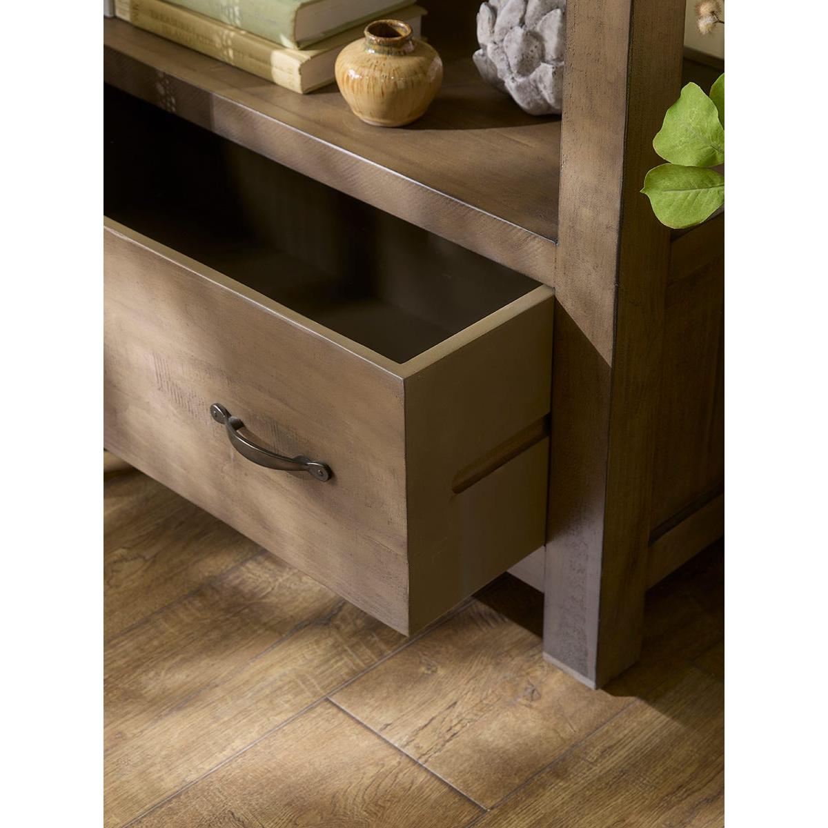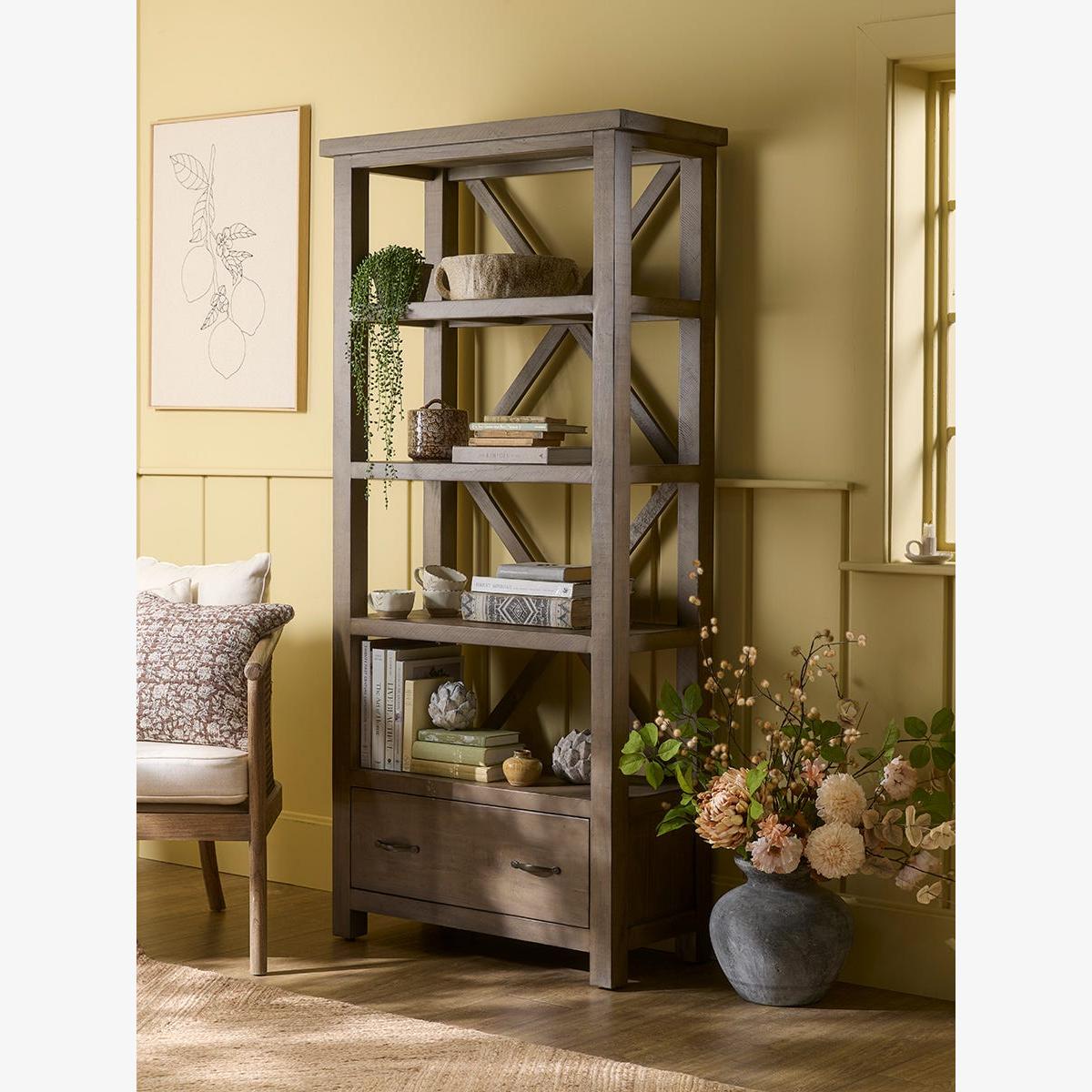 Elevated rustic charm radiates from our Parma display cabinet, as it encapsulates farmhouse style crosses and a chunky pine frame. With four shelves to display books, decorative accessories, plants, or photo frames, this shelving unit is finished with a bottom drawer, allowing you to hide away those pesky bits and bobs you don't want on show. Traditional handles sit on the drawer front, tying the shelving unit together nicely and making it the perfect fit in our English Rustic trend.