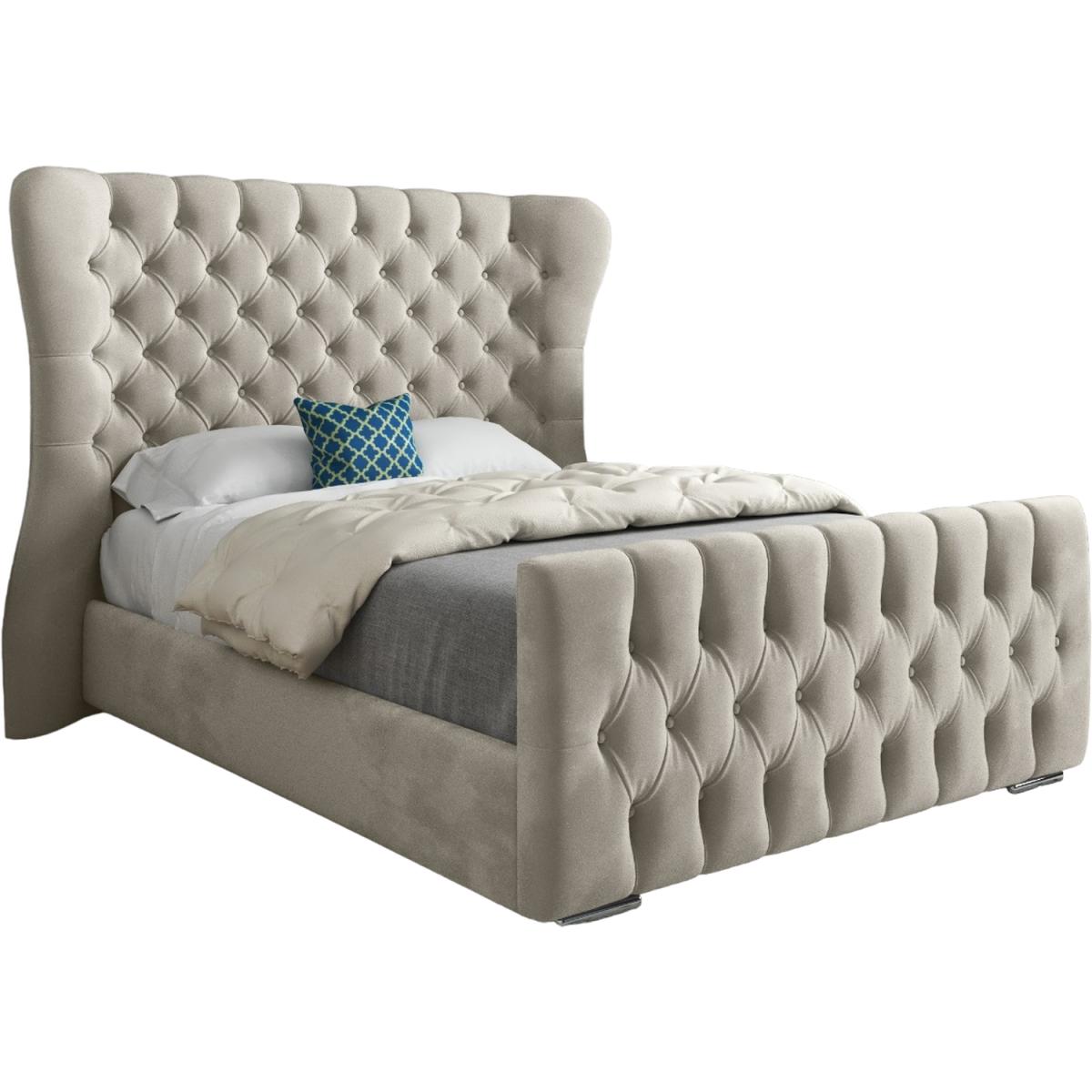The Parma buttoned bed is profiled by two articulately shaped wings flowing gracefully from the ground, creating a feeling of intimacy. The wings on the headboard of this bed create a sense of immersion, whilst the buttoning adds character and style. The bed base compromises of solid slats which add comfort to the bed. The Parma is customisable and can be upholstered in your choice of fabric to suit your style and colour scheme. The Parma has chrome feet on the footboard and you can choose from fabric buttons or diamante buttons in the detailing for a luxurious look. The headboard is generously padded and features classic chesterfield pleated upholstery aswell as on the foot.