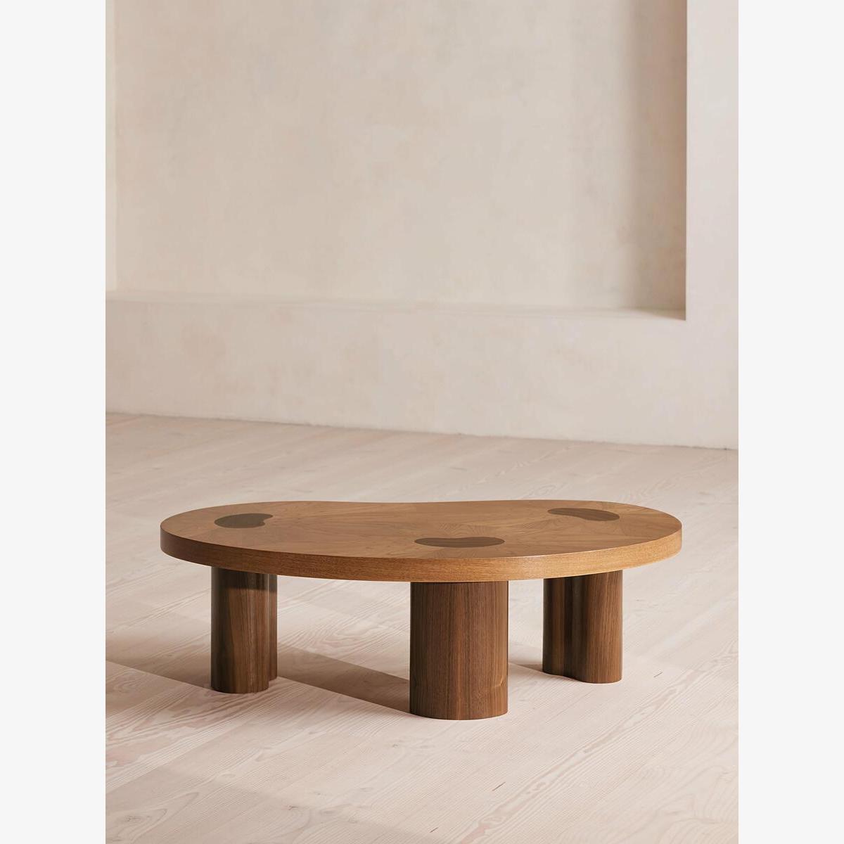 The softly curved silhouette of the Pascal coffee table is inspired by the interiors of Soho House Manchester. Made from a mid-toned, starburst oak finished with a high sheen, the top is perched on three arc-shaped legs made from walnut.