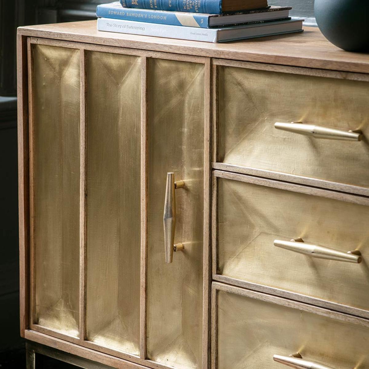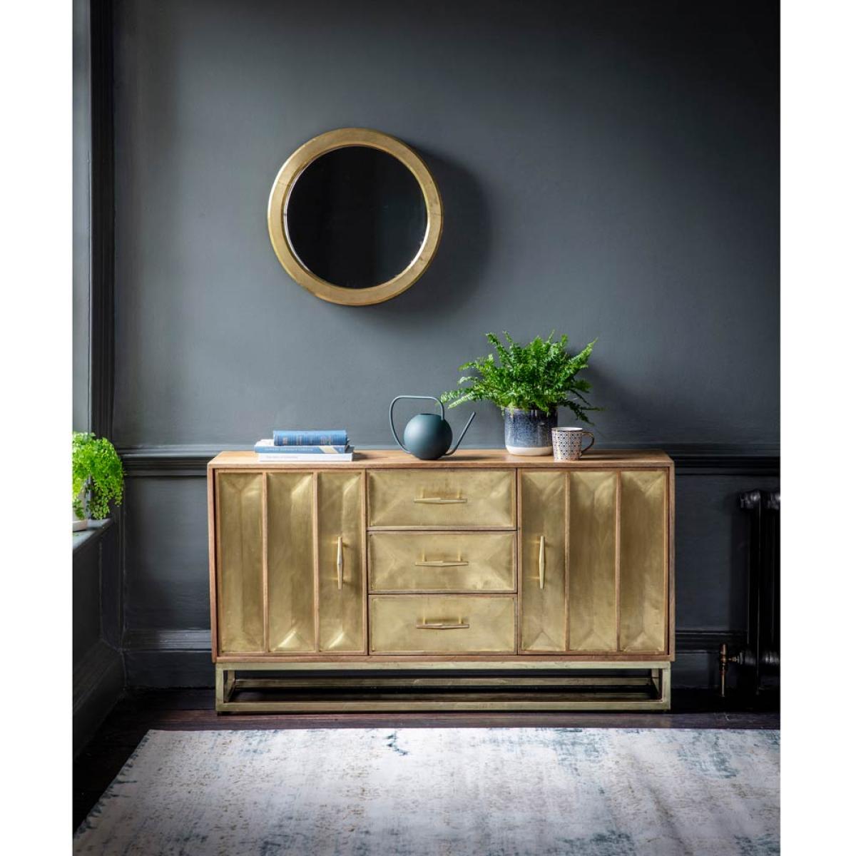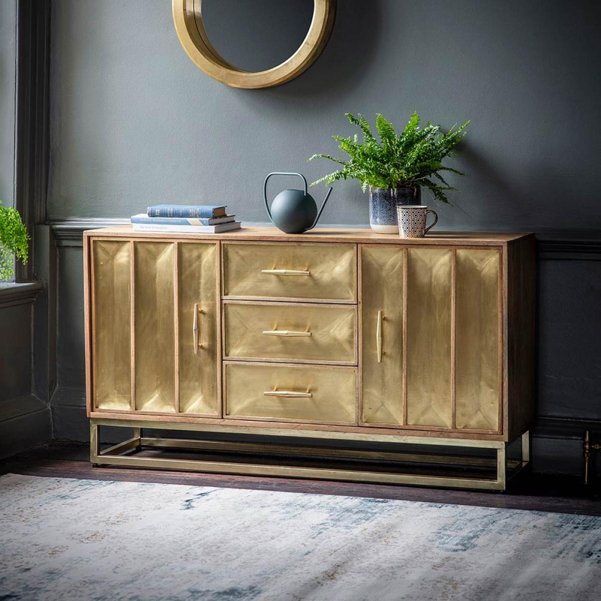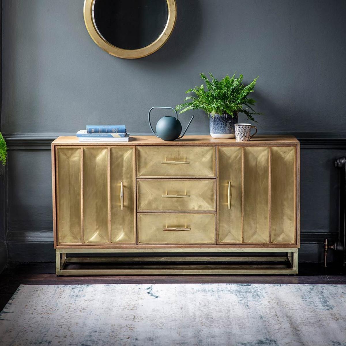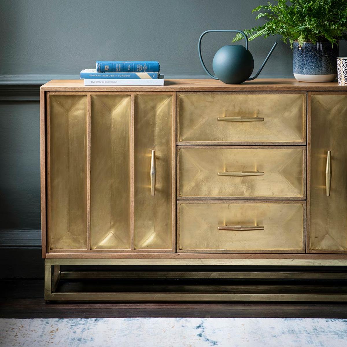 I love this piece for its bold, luxe brass finish that adds instant glamour to any room. It works particularly well in eclectic or art deco-inspired interiors, but can also serve as a standout feature in more contemporary spaces. For styling, think about balancing its shiny surface with textured textiles or matte ceramics, and consider layering with art or decorative objects in complementary metals. Practical tips include using it for both storage and display-placing a tray or few curated accessories on top without overcrowding keeps it functional yet refined. This sideboard is not only a statement piece, but versatile enough to work well in dining rooms, living spaces, or even hallways.