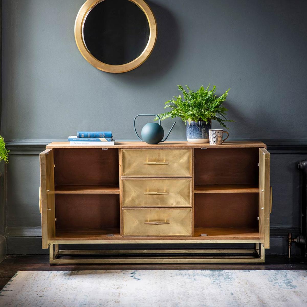 Once a distant memory of the 1970s, the humble sideboard has come back in fashion big time thanks to its generous storage space, which is ideal for open-plan layouts. Our Pascali Sideboard brings the luxe look to this functional piece of furniture with brass cladded doors, natural mango wood and brass plated frame. Use it in the living area as a media unit or as storage for books, games and paperwork.