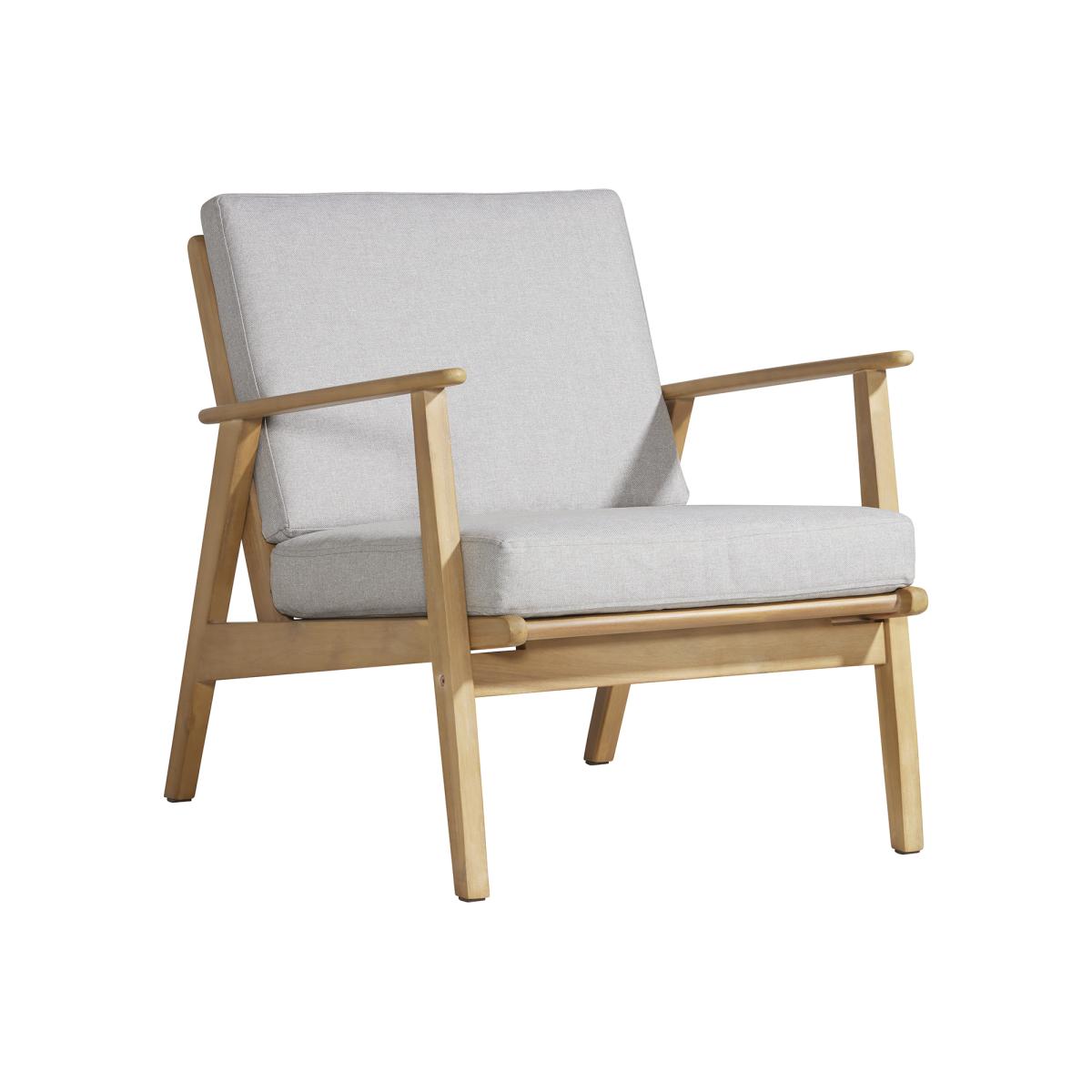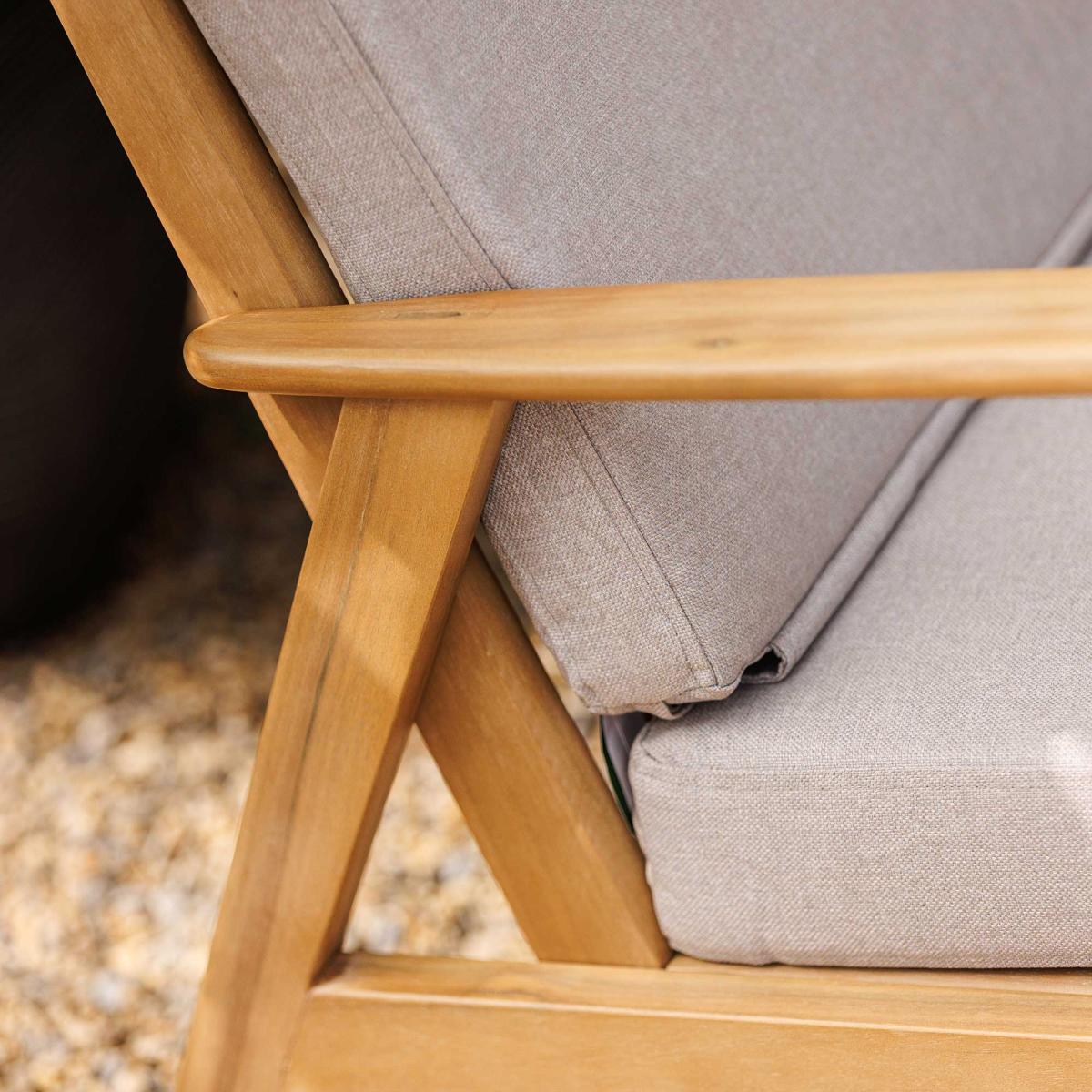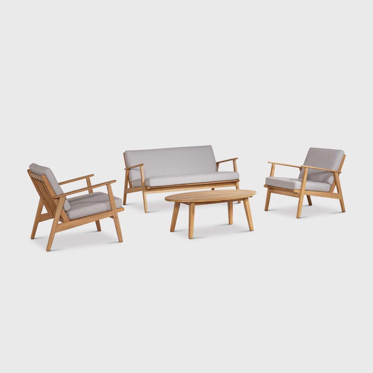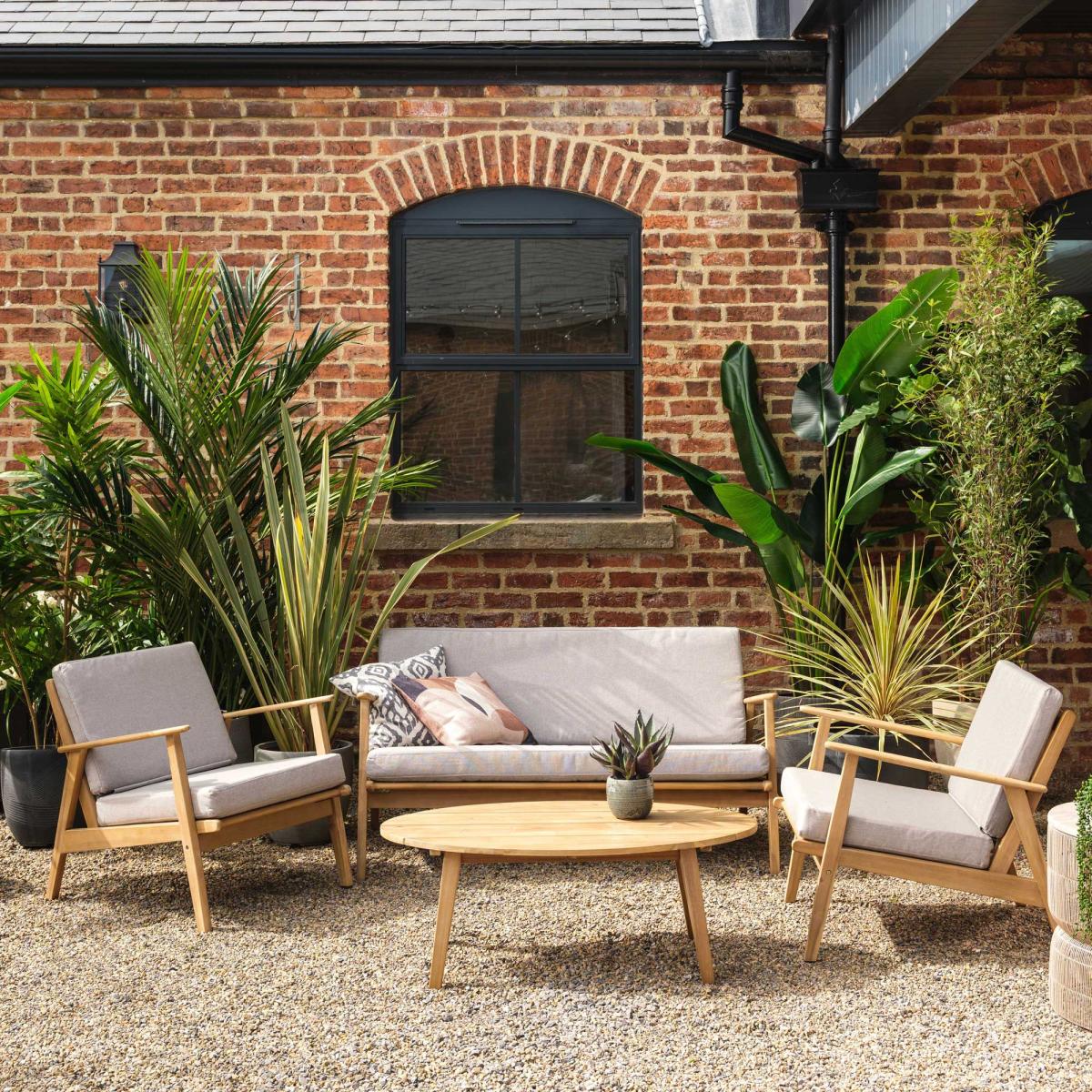 I love this set because of its versatile, minimalist design that suits a range of outdoor spaces. The grey fabric combined with the natural wood frames makes it easy to style with a variety of colours and textures, from vibrant cushions to neutral outdoor rugs. It works particularly well in contemporary or Scandinavian-inspired gardens, but can also complement traditional settings with a subtle touch of modernity. Practical styling tips include adding cosy throws for cooler evenings or pairing with statement planters and lighting to create a welcoming outdoor lounge. Overall, it’s a durable and stylish option that combines comfort with understated elegance.