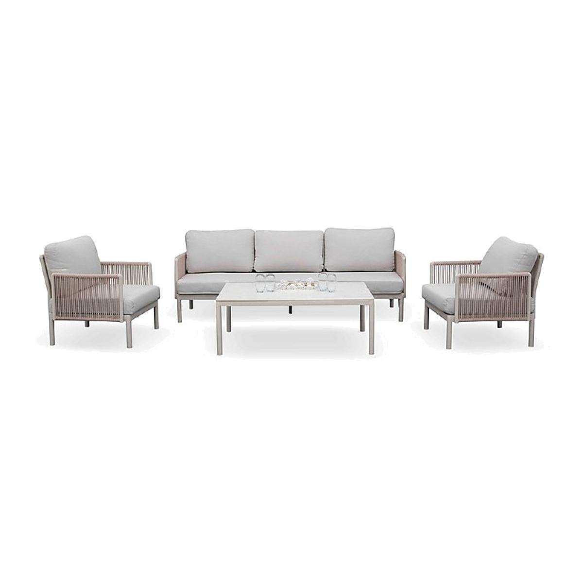 Make long summer evenings more stylish with this garden furniture set, part of our exclusive Paso range. With a sofa, two armchairs and a coffee table, it captures the look of a boutique hotel patio. Why you'll love it Enjoy boutique hotel ambience with this stunning garden furniture. Low- maintenance finish, high- end outdoor style. This outdoor dining set includes a 3- seater sofa, 2 armchairs and a rectangular coffee table. Stylish sintered stone table top is scratchproof. Rustproof aluminium table, sofa and chair frames have a white powder- coated finish. Rope detail on the sofa and chairs adds a contemporary style note. Showerproof cushion covers are machine washable at 30°. 2- year frame guarantee. This garden sofa, armchairs and coffee table set is part of the Paso range. What you need to know Made with powder- coated aluminium and sintered stone. Sintered stone is created using natural stone. Mop spills quickly and avoid abrasive cloths and cleaning materials. Cushions should be stored indoors during wet weather and when not in use. Self- assembly required.