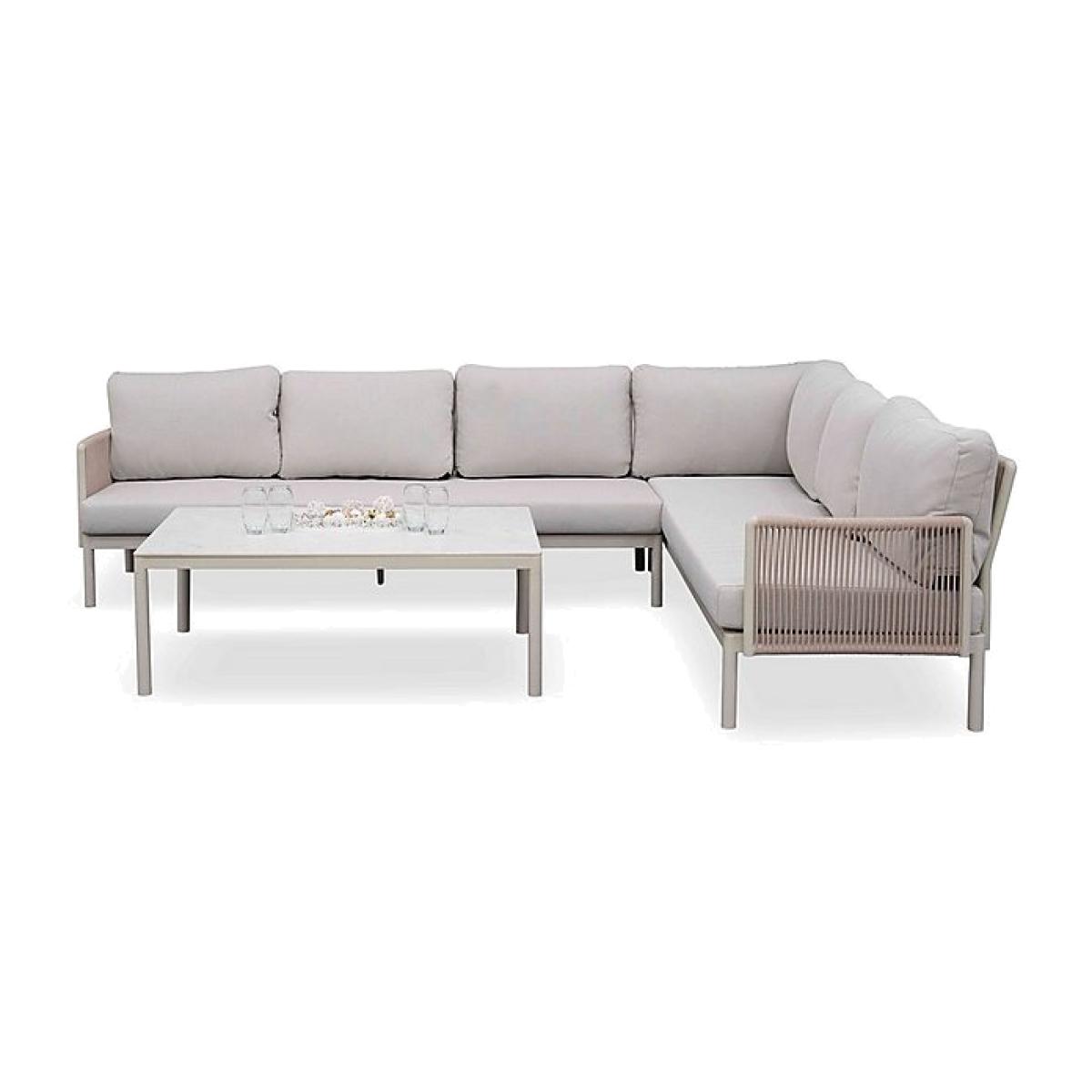You’ll feel like you’re on the patio of an elegant hotel when you bring home this garden furniture set. Comprising a corner sofa and a coffee table, this outdoor set has a stylish white finish. Why you'll love it Enjoy boutique hotel ambience with this stunning garden furniture. Low- maintenance finish, high- end outdoor style. This outdoor dining set includes a 3- seater corner sofa and a rectangular coffee table. Stylish sintered stone table top is scratchproof. Rustproof aluminium table and sofa frames have a white powder- coated finish. Rope detail on sofa adds a contemporary style note. Showerproof cushion covers are machine washable at 30°. 2- year frame guarantee. This garden corner sofa and coffee table set is part of the Paso range. What you need to know Made with powder- coated aluminium and sintered stone. Sintered stone is created using natural stone. Cushions should be stored indoors during wet weather and when not in use. Self- assembly required.
