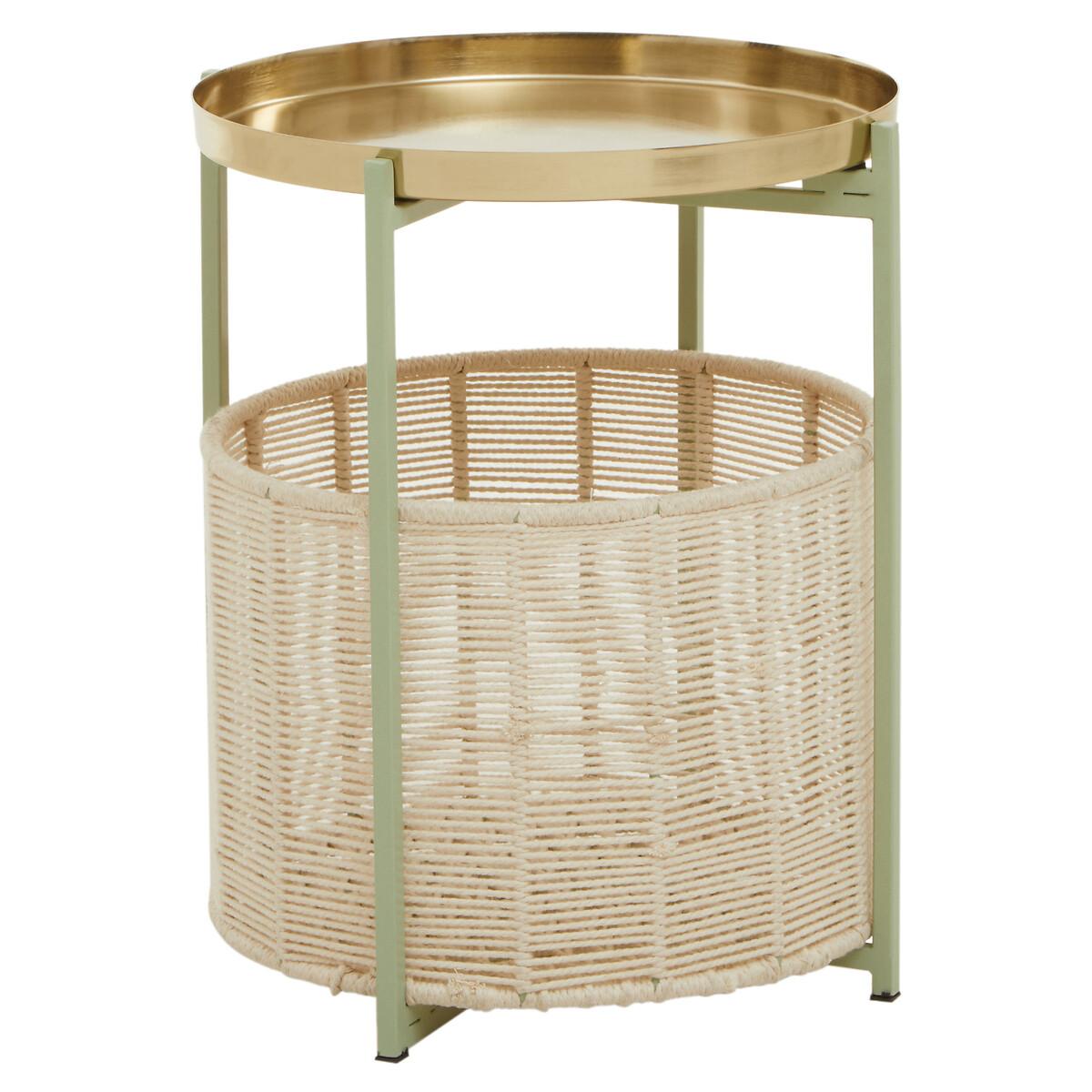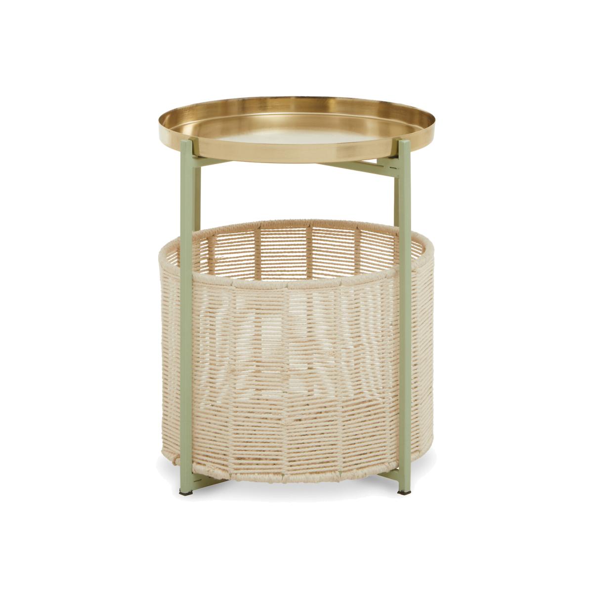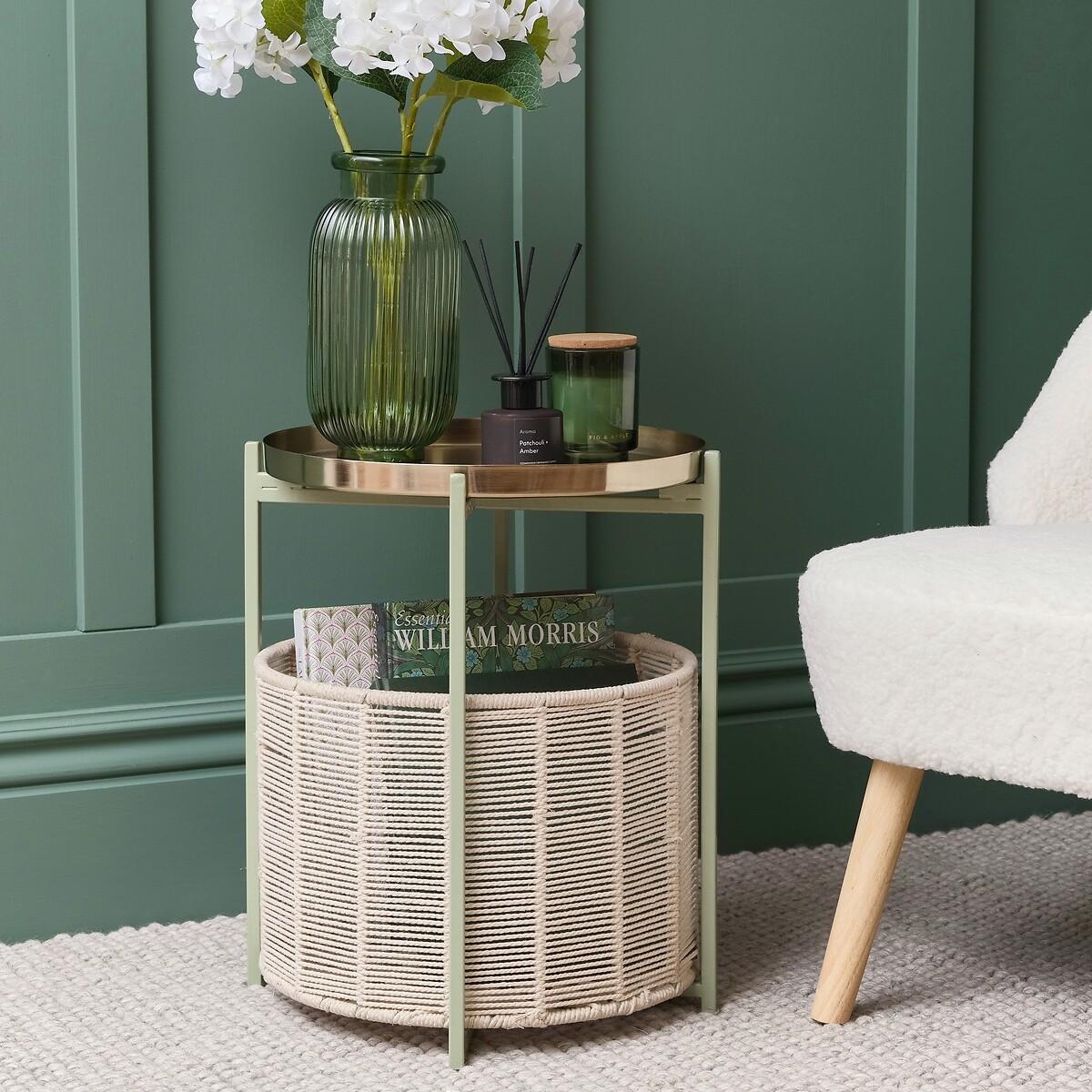 Made from metal in a two-tiered design, with a removable circular tray top and a cotton storage basket base, this is the perfect side table for city living. Ideal for small spaces, it's perfect for keep clutter clear. A luxe matte frame and polished metal tabletop ensures this piece is as stylish as it is functional. Product details Two-tier storage side table. Removable tray top Cotton storage basket base Matte metal frame Assembly required. Care instructions Clean with damp cloth only. Product Composition - Metal, Textile. Product Dimensions - 47 cm x40 cm x40 cm , Weight - 5.34 kg. Package Dimensions - 49 cm x 40 cm x 34 cm, Weight 7 kg. This product will be dispatched by one of our trusted suppliers. You’ll be contacted by their selected courier about your delivery. PREMI01