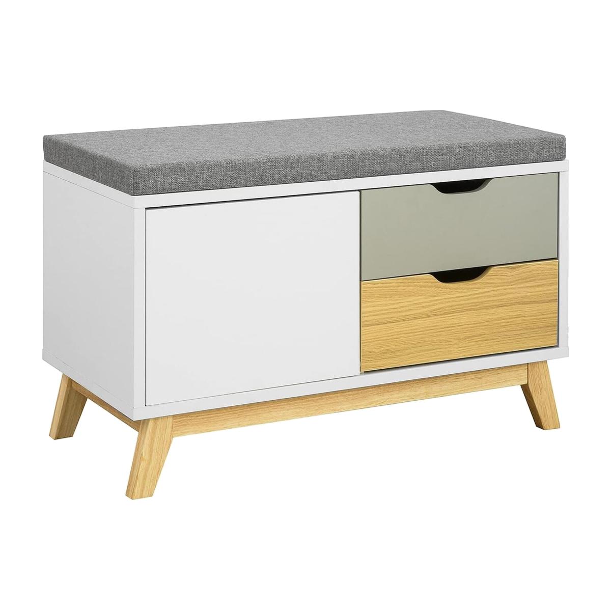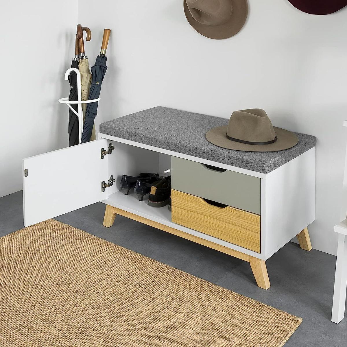 Modern design shoe cabinet shoe bench, good choice for your hallway and living room. The padded seat which is removable is ideal for comfortable sitting while putting on and taking off shoes. The cabinet provides storage space for your shoes.2 drawers are ideal for storing shoe polish and brush, keys, and other small items. It has four wooden legs made of Manchurian ash to ensure stability and strong load capacity. This shoe rack will keep your halls and entryway organized as well as distinctive. Attractive and contemporary way to create a good look for a modern room.