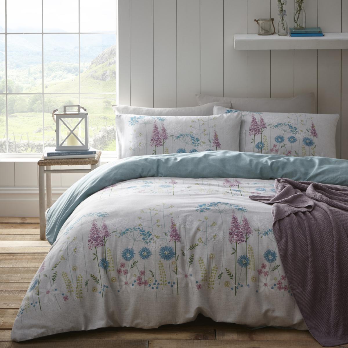 Bringing the beautiful English countryside to life indoors, Pasture offers a medley of flowers in horizontal bands on a hessian textured background. Available in 2 stunning colourways, each delicately coloured with pops of brightly coloured flora creating a heart-warming nature inspired bedroom.