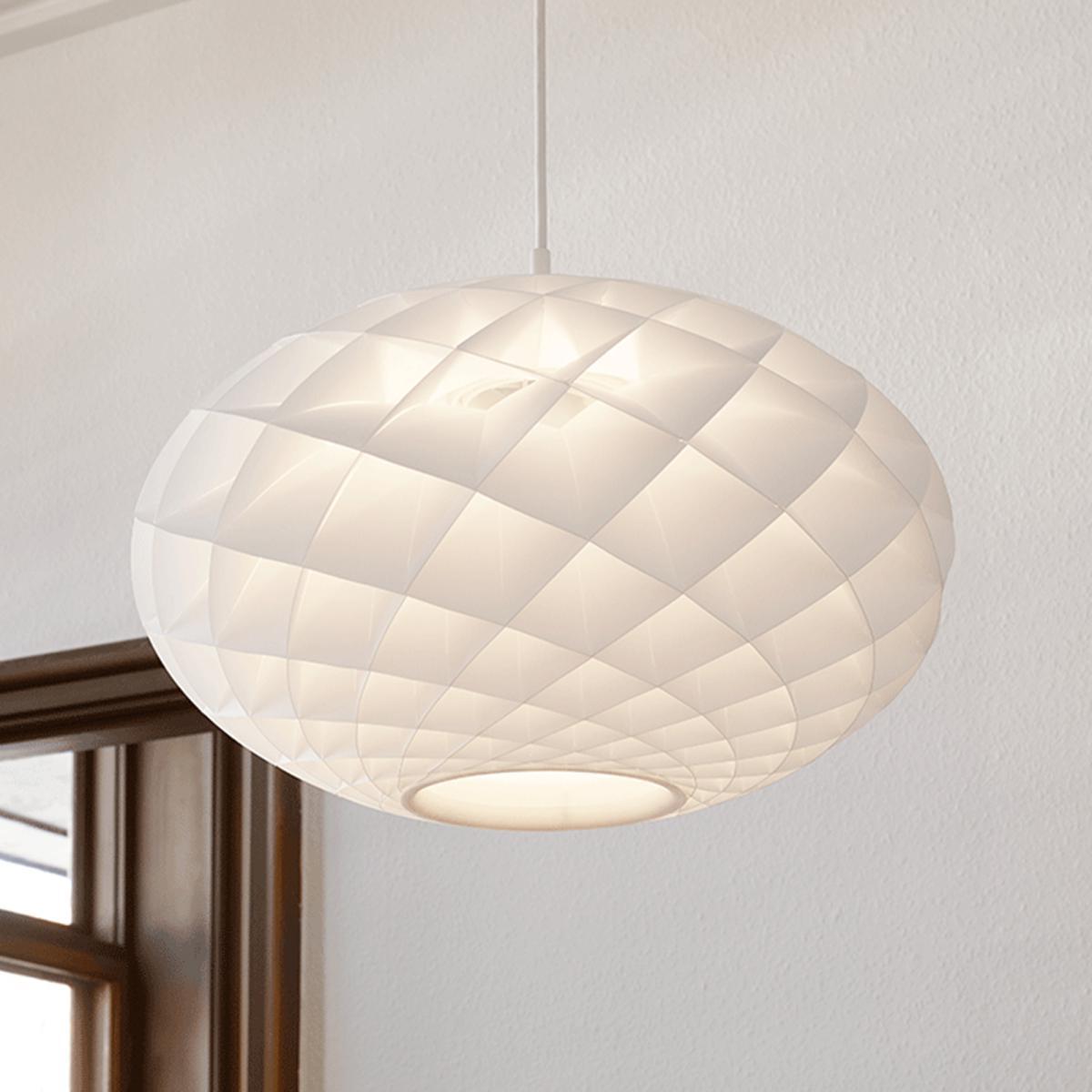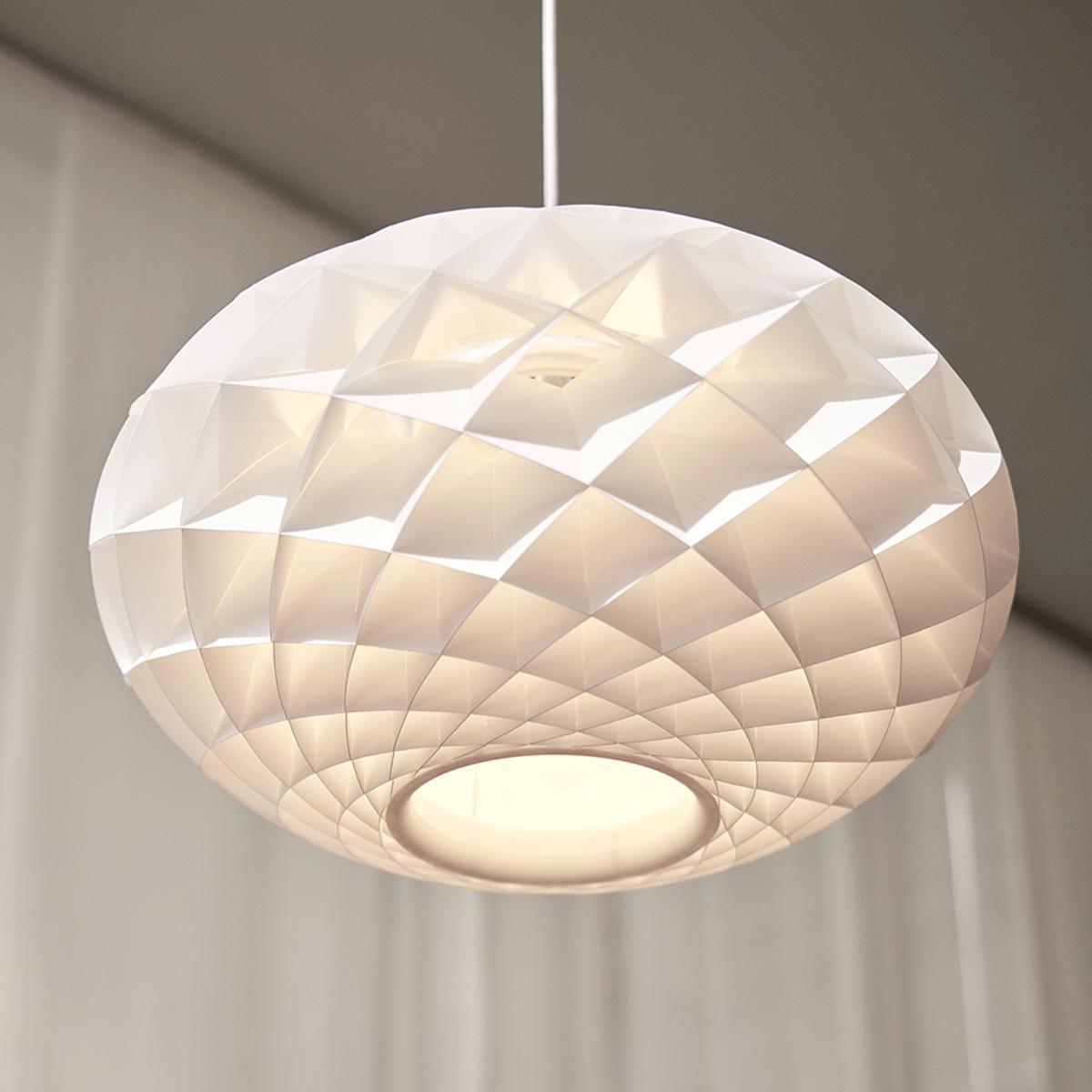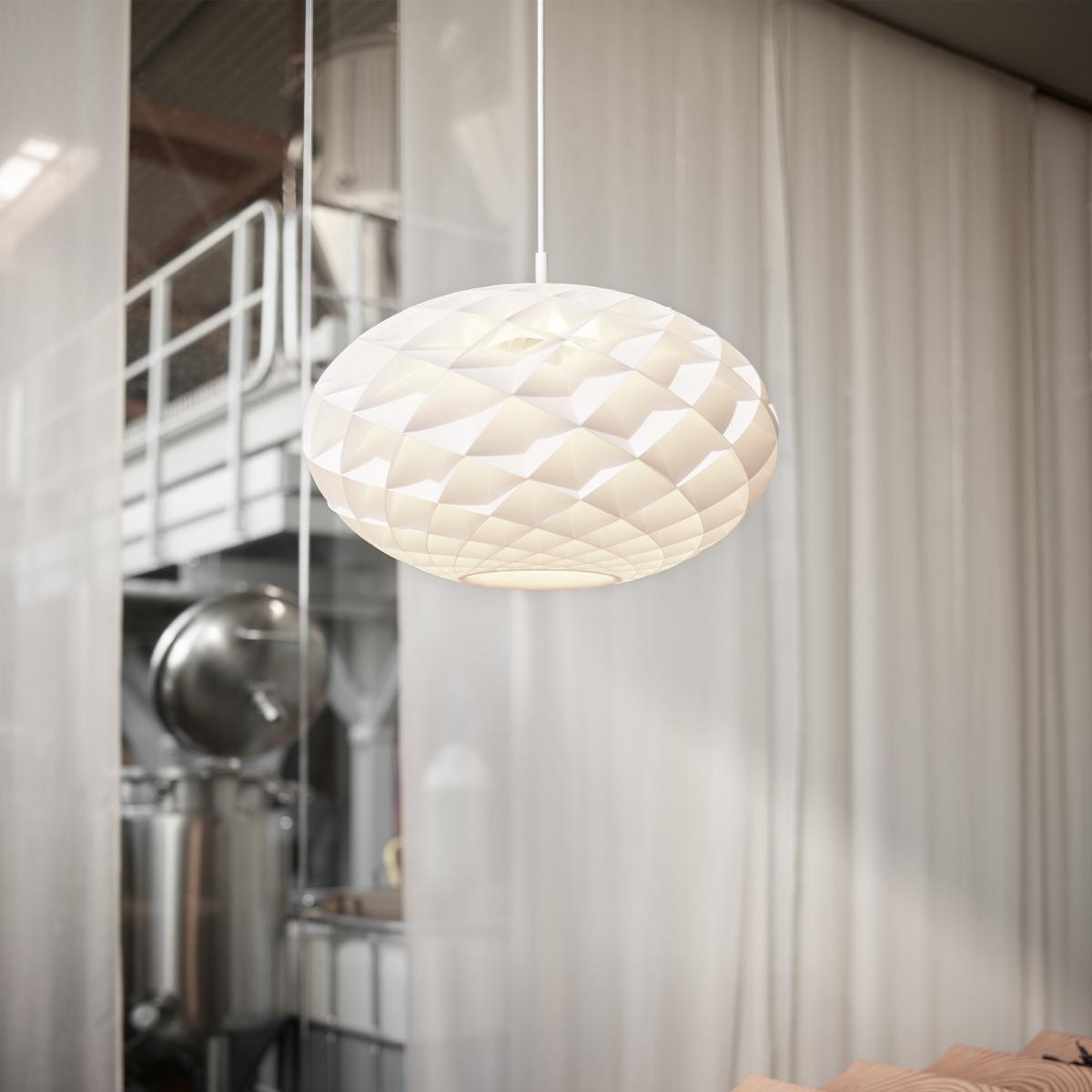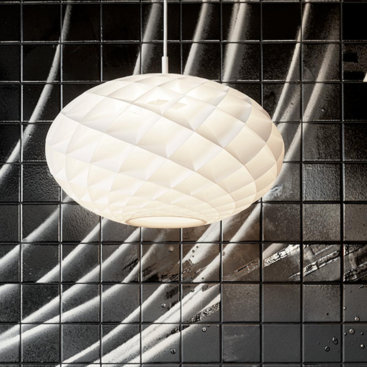 Designed by Øivind Slaatto for Louis Poulsen, the mesmerising, oval-shaped Patera Pendant Light was inspired by the Fibonacci sequence, a pattern that appears in nature as a spiral. Presented as a glowing sphere formed of diamond-shaped cells arranged in a pattern reminiscent of sunflowers and pinecones, the pendant casts a subtle, diffused light through the glowing shapes. Crafted from matt white plastic, the pendant also features chromed-brass accents for a considered finish. Renowned for his simple and poetic solutions to design, Øivind Slaatto's creations are each infused with a unique sense of harmony that stems from his love of music. Driven by the belief that 'practice makes perfect,' Slaatto meticulously perfects each of his designs to achieve optimal beauty and usability.
