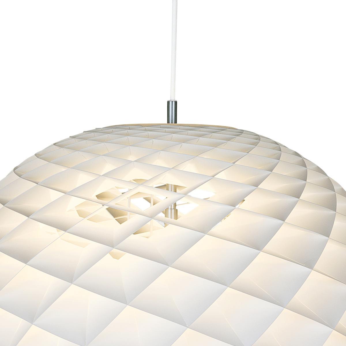 Designed by Øivind Slaatto for Louis Poulsen, the medium Patera Pendant Light in a white finish was inspired by the Fibonacci sequence, a pattern that appears in nature as a spiral. Presented as a glowing sphere formed from small diamond-shaped cells arranged in a pattern reminiscent of sunflowers and pinecones, the pendant casts a subtle, diffused light through the glowing shapes. Crafted from matte white plastic, the pendant also features matte chromed-brass accents for a refined finish. A show-stopping design, the sculptural pendant looks particularly striking when hung in a cluster from a high ceiling as a contemporary take on a chandelier. Renowned for his simple and poetic solutions to design, Øivind Slaatto's creations are each infused with a unique sense of harmony that stems from his love of music. Driven by the belief that 'practice makes perfect', Slaatto meticulously perfects each of his designs to achieve optimal beauty and usability. Requires: 1 x Max 60W E27 bulb (not included)