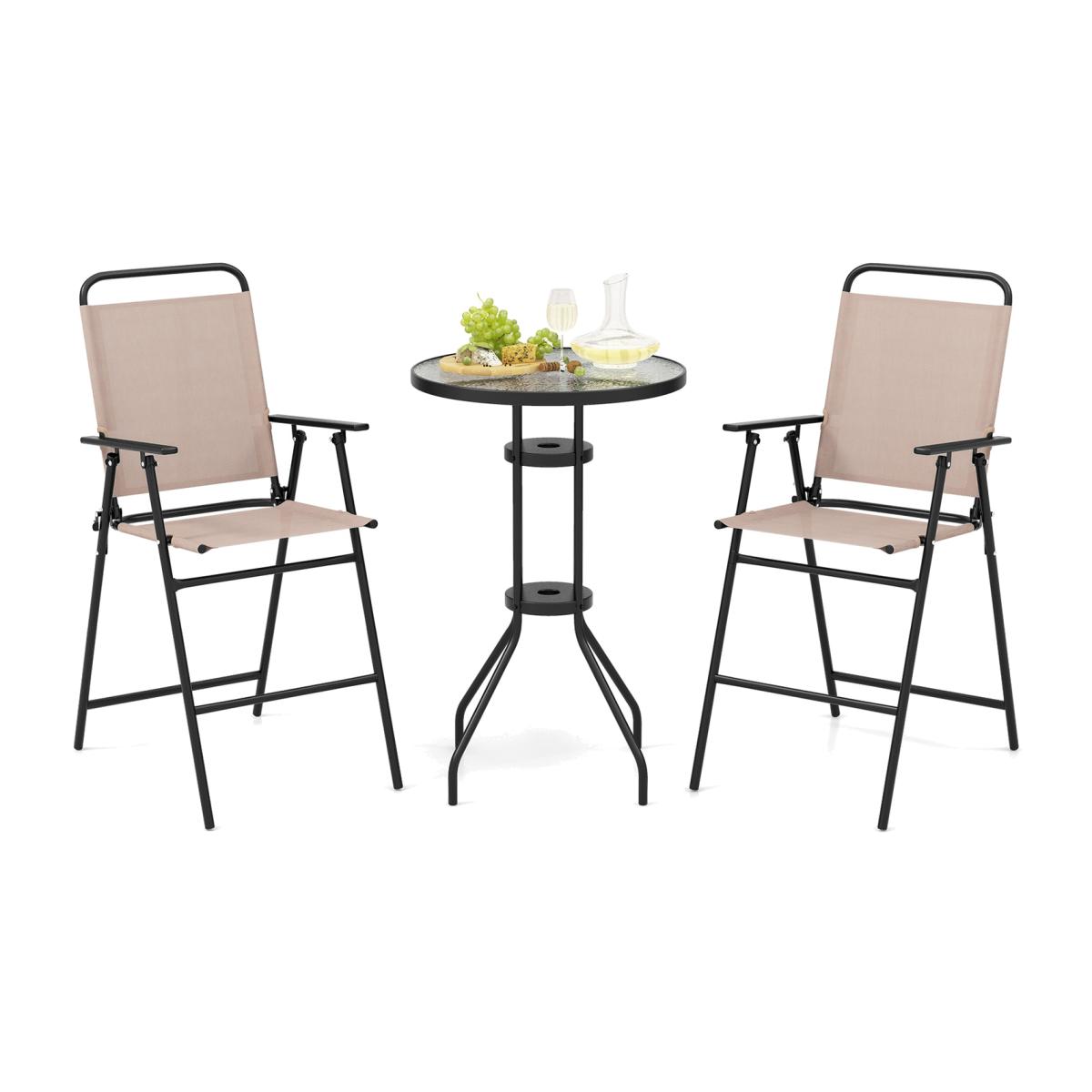 Upgrade your outdoor oasis with our luxurious bar table set! Designed for your outdoor sunshade, the outdoor bar table is equipped with an umbrella hole and fixing brackets. With a space-saving folding design, the 2 chairs save you time and effort in storage. Made from all-weather fabric, this chair will stay in a condition for the years to come. Patio Bar Table with 2 Folding Chairs - Brown