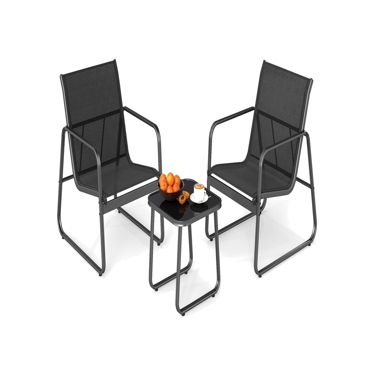 Enhance your outdoor space with this stylish and durable 3 piece patio bistro set. Designed with a sturdy metal frame and breathable fabric, the chairs offer superior comfort and support up to 150 kg. The tempered glass table provides a sleek surface for drinks and snacks. Perfect for balconies, gardens, and poolside relaxation. Easy to assemble and weather resistant, this set ensures long lasting outdoor enjoyment. Patio Bistro Set with Glass Table and Chairs - Black