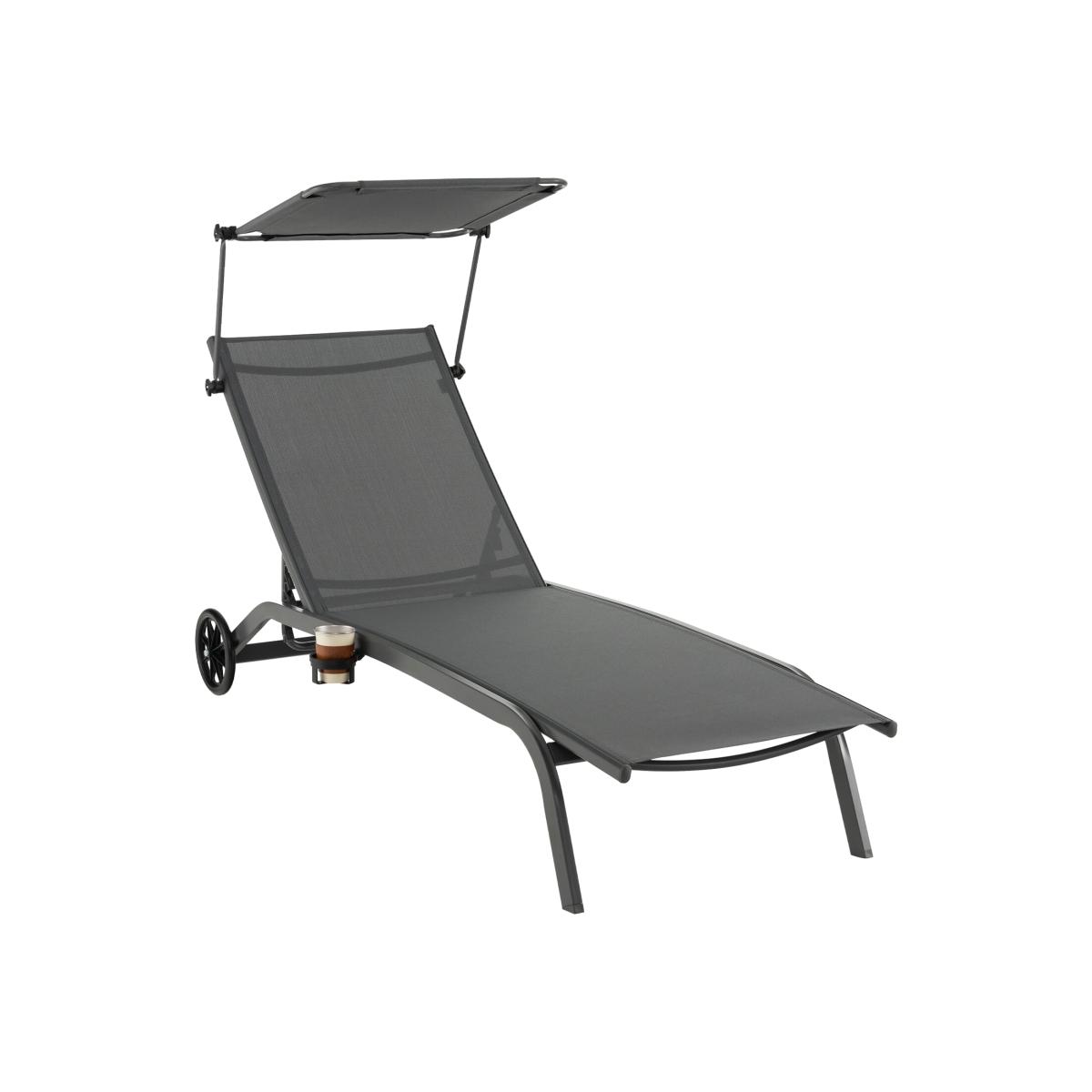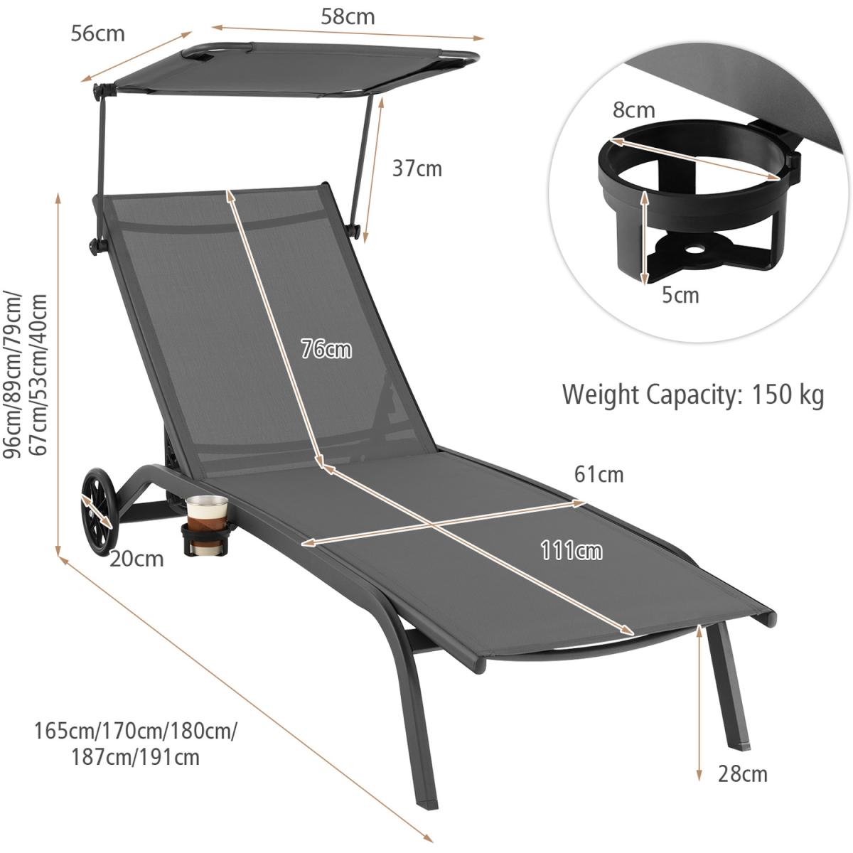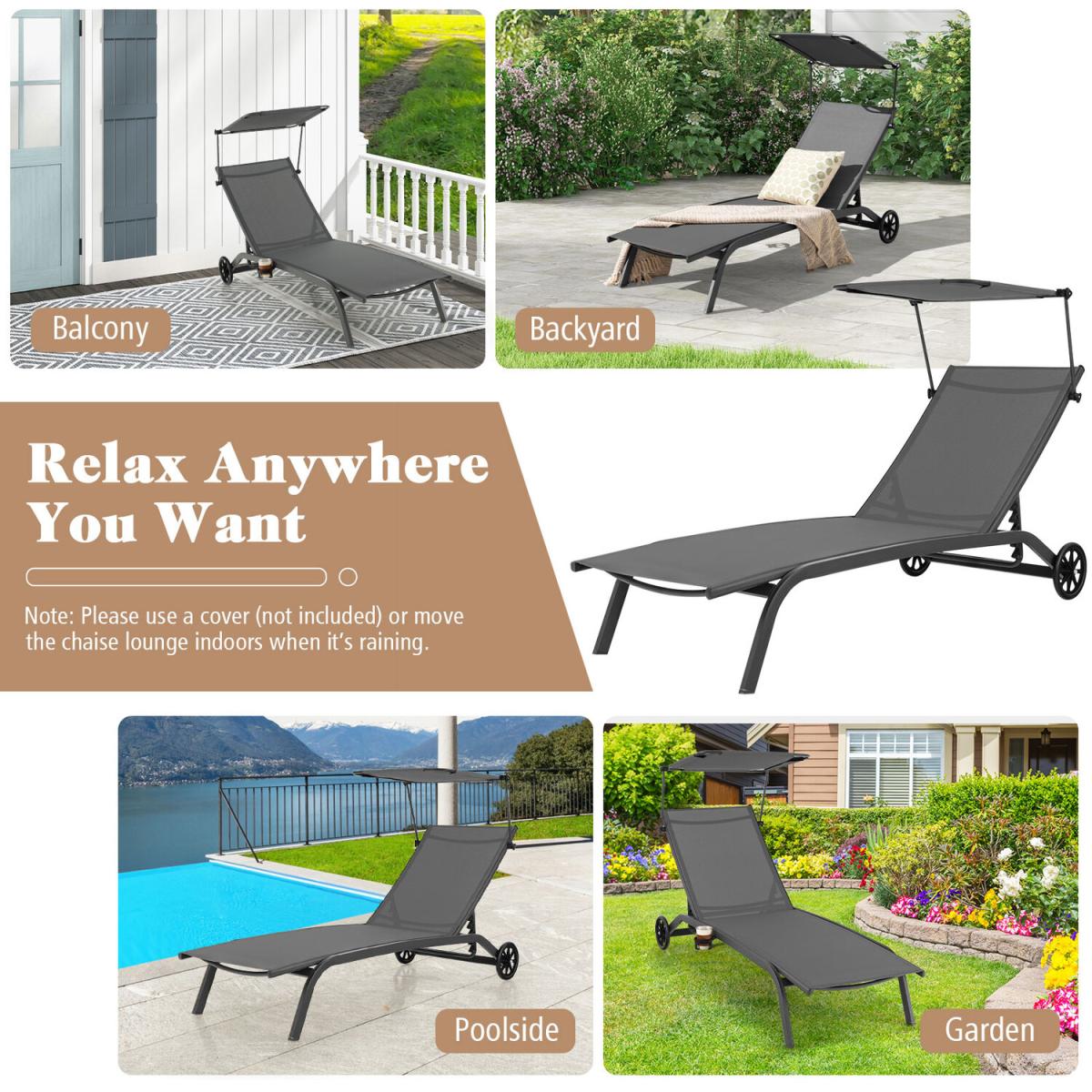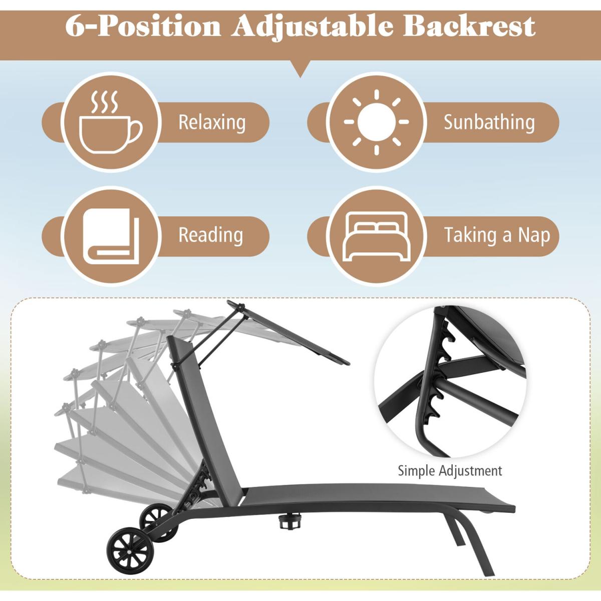 This patio chaise lounge chair with canopy will be a perfect option for you to relax outdoors. Different from other normal chaise lounge, ours is designed with sunshade. With the convenient adjusting knob, you can easily lift up or put down the canopy, and freely adjust its angle. Moreover, the 6-position backrest will meet more of your relaxing demands. The seat fabric is breathable to offer you more comfort. And the reinforced metal frame ensures high stability. Apart from that, when not in use, you can easily move the chaise lounge chair in or out with the functional wheels. And the hidden cupholder brings you more convenience to take drinks.