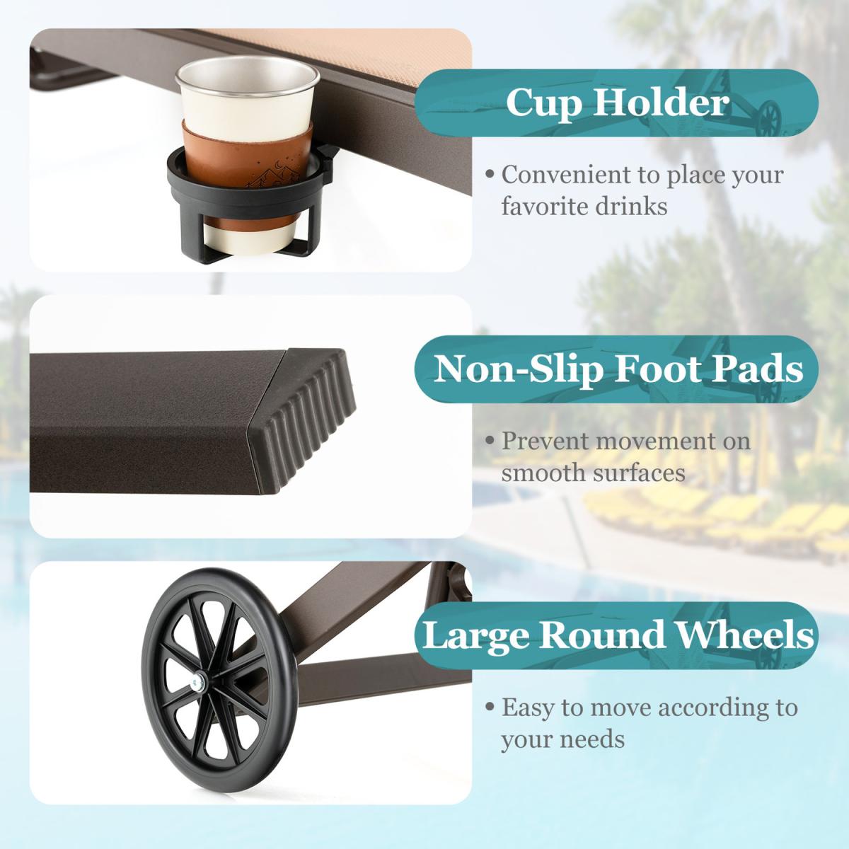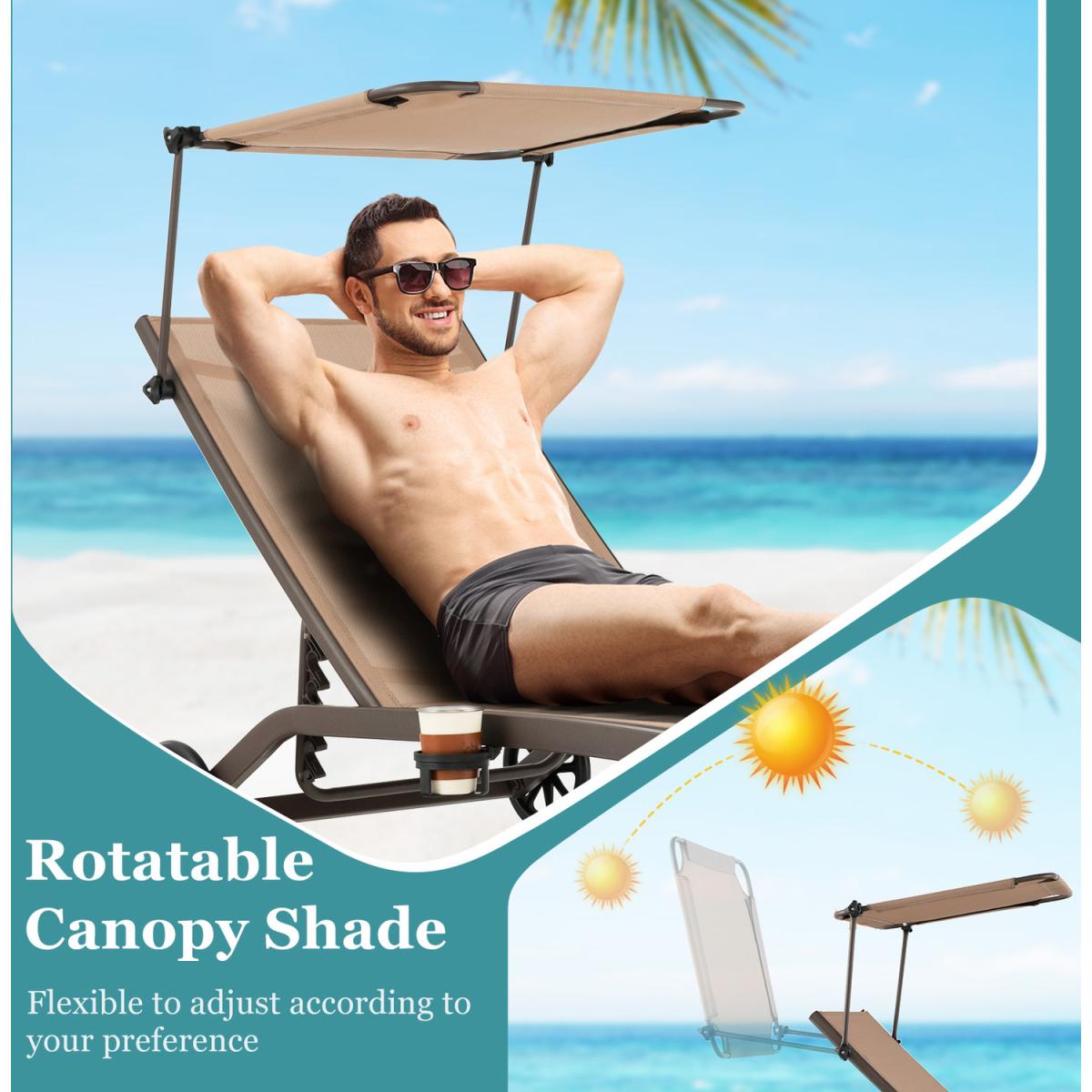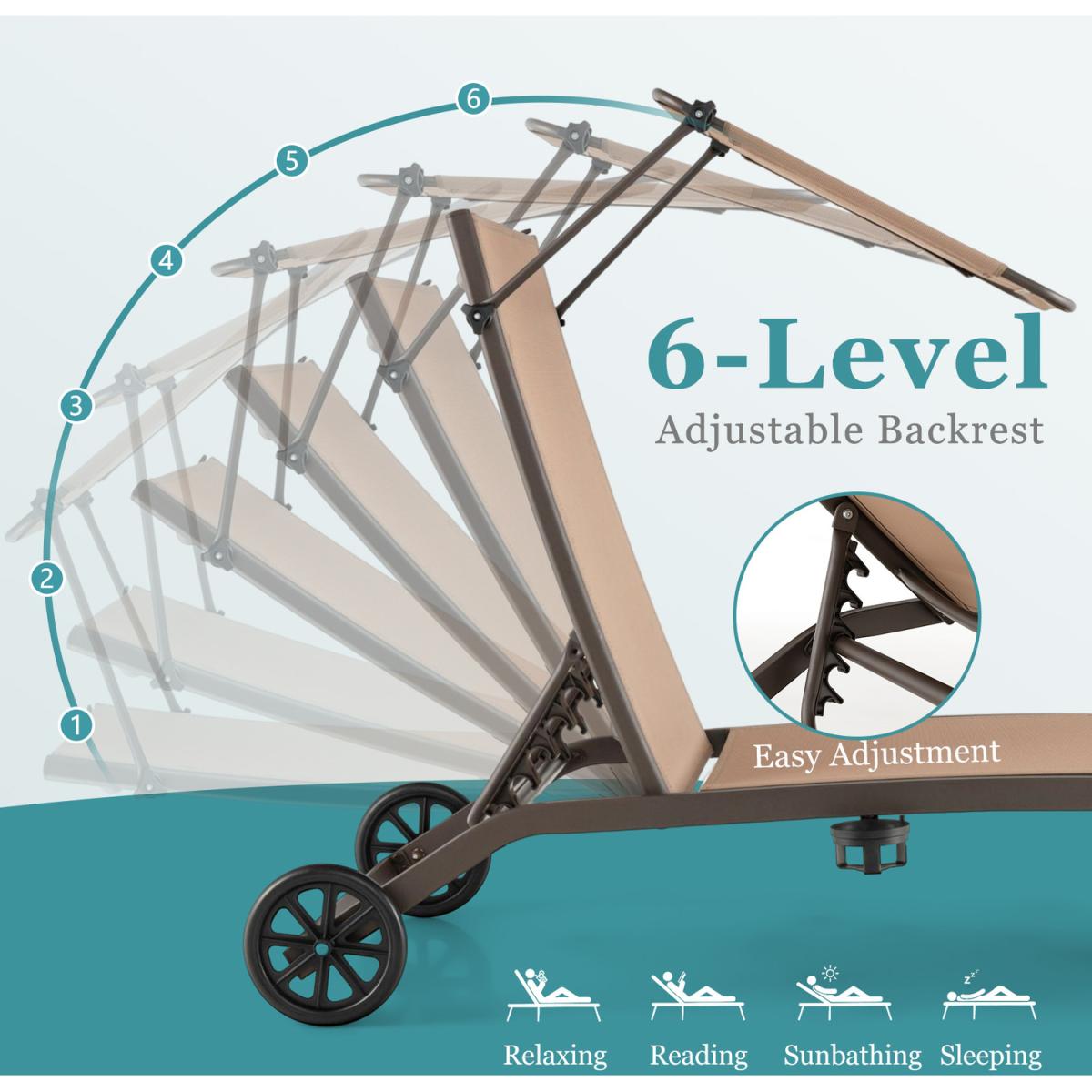 This patio chaise lounge chair with canopy will be a perfect option for you to relax outdoors. Different from other normal chaise lounge, ours is designed with sunshade. With the convenient adjusting knob, you can easily lift up or put down the canopy, and freely adjust its angle. Moreover, the 6-position backrest will meet more of your relaxing demands. The seat fabric is breathable to offer you more comfort. And the reinforced metal frame ensures high stability. Apart from that, when not in use, you can easily move the chaise lounge chair in or out with the functional wheels. And the hidden cupholder brings you more convenience to take drinks.
