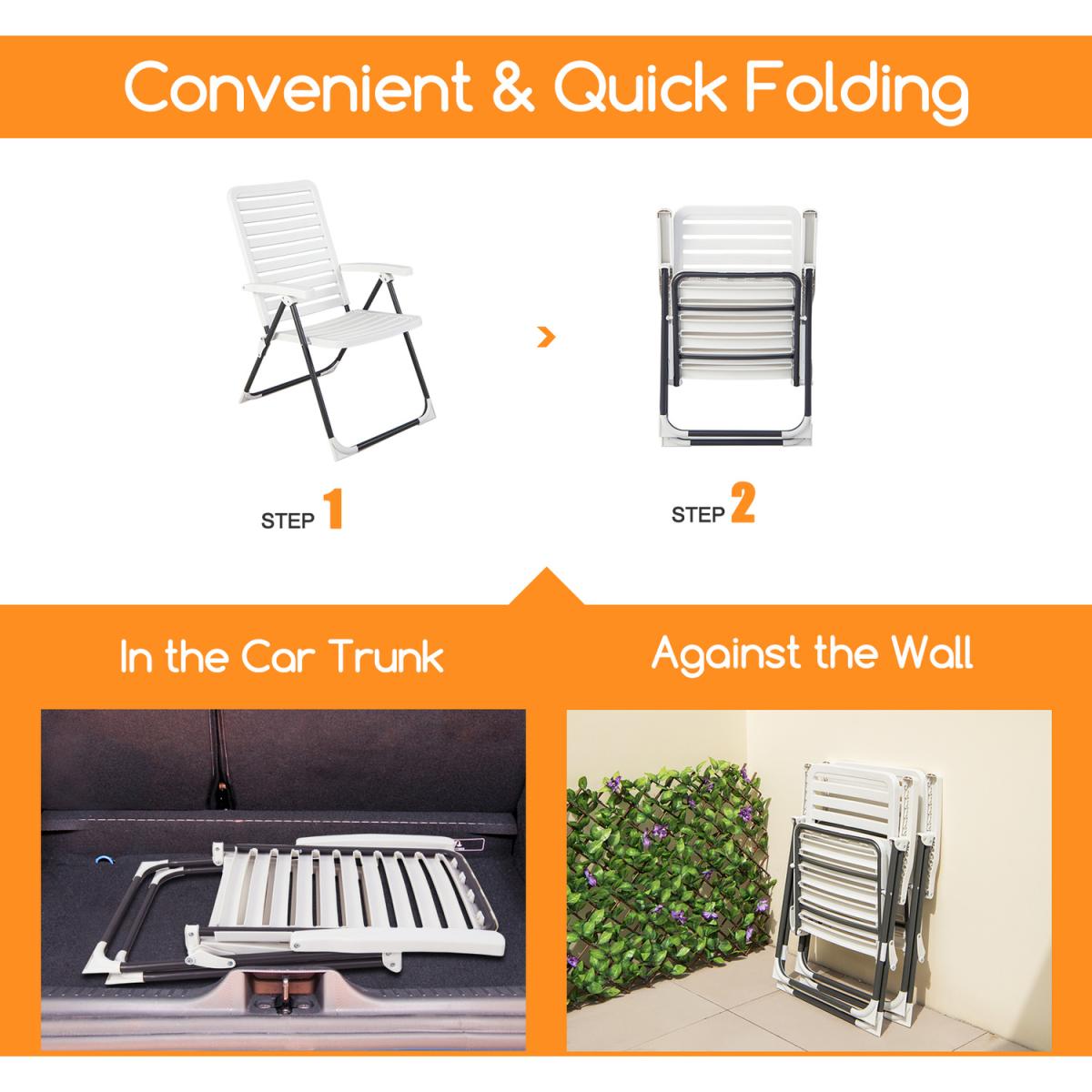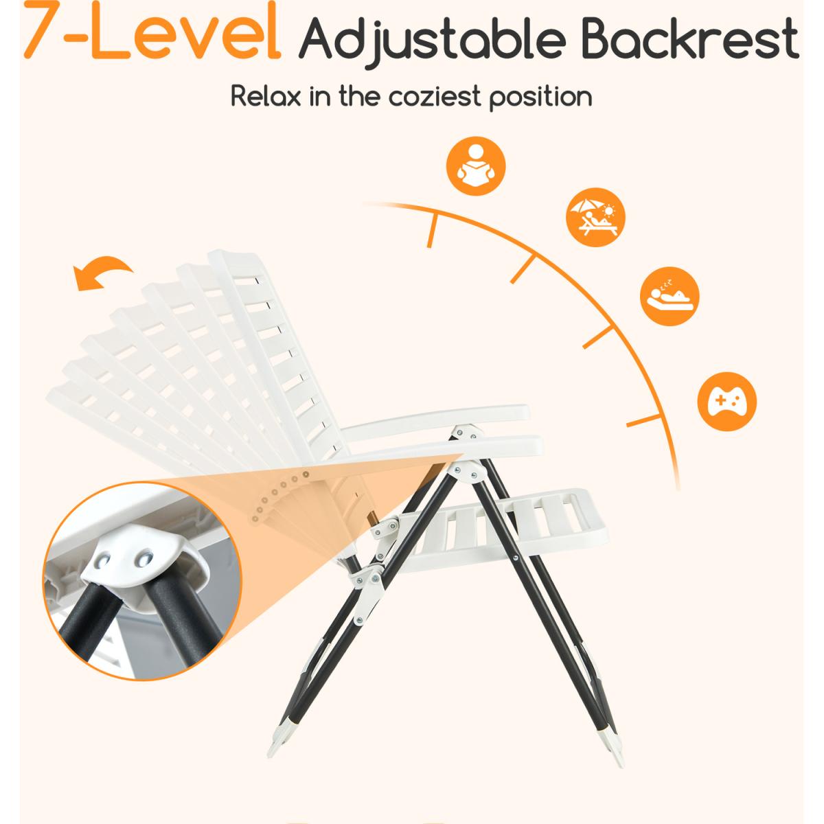 This folding reclining chair offers you a perfect place to relax outdoors. The backrest of the chair can be adjusted into 7 different positions, satisfying your different demands for relaxation. And the high-backrest design provides you with more coziness. What's more, this patio chair can withstand long-time outdoor use with weatherproof PP and rustproof metal frame. When not in use, the chair can be quickly folded for easy carrying and space-saving storage. All in all, this outdoor folding chair will make you more relaxed in various outdoor activities.