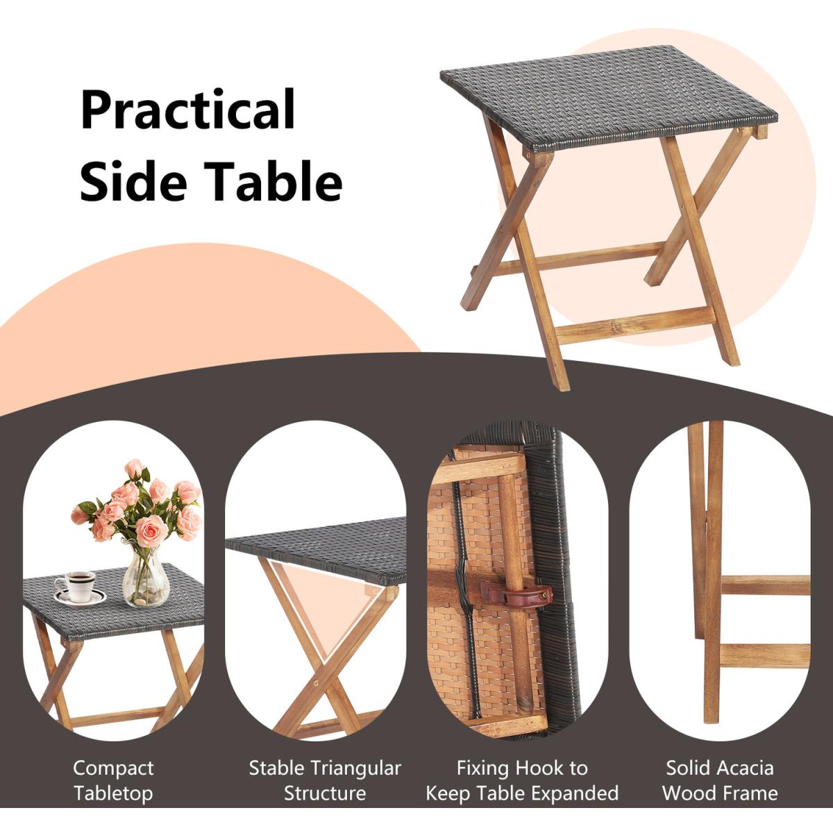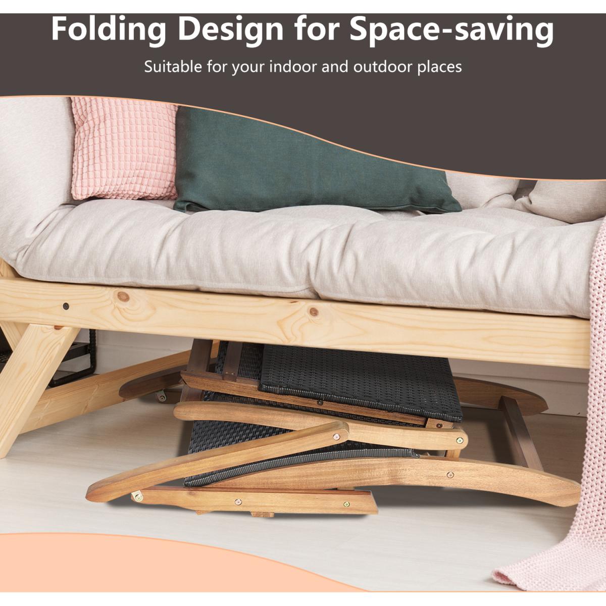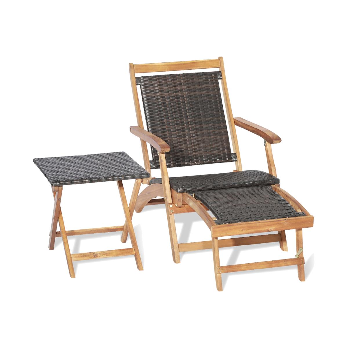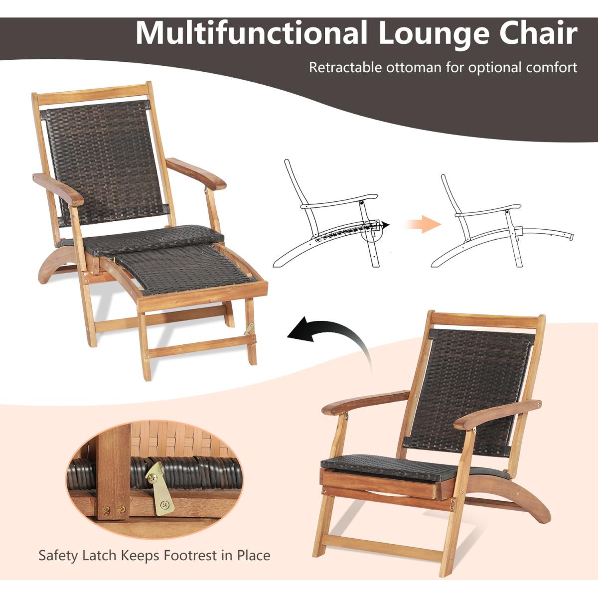 This patio chair and table set will create a comfortable relaxing space for you! Designed with high backrest and retractable ottoman, the deck chair is comfortable to sit, offering different sitting choices for you. Besides, both the chair and table are made of sturdy acacia wood frame and weather-resistant mix brown PE rattan, which ensures strong support and longer outdoor use. With folding design, you can fold the table and chair into a compact size to take up less space. If you are looking for a patio set for outdoor relaxation.