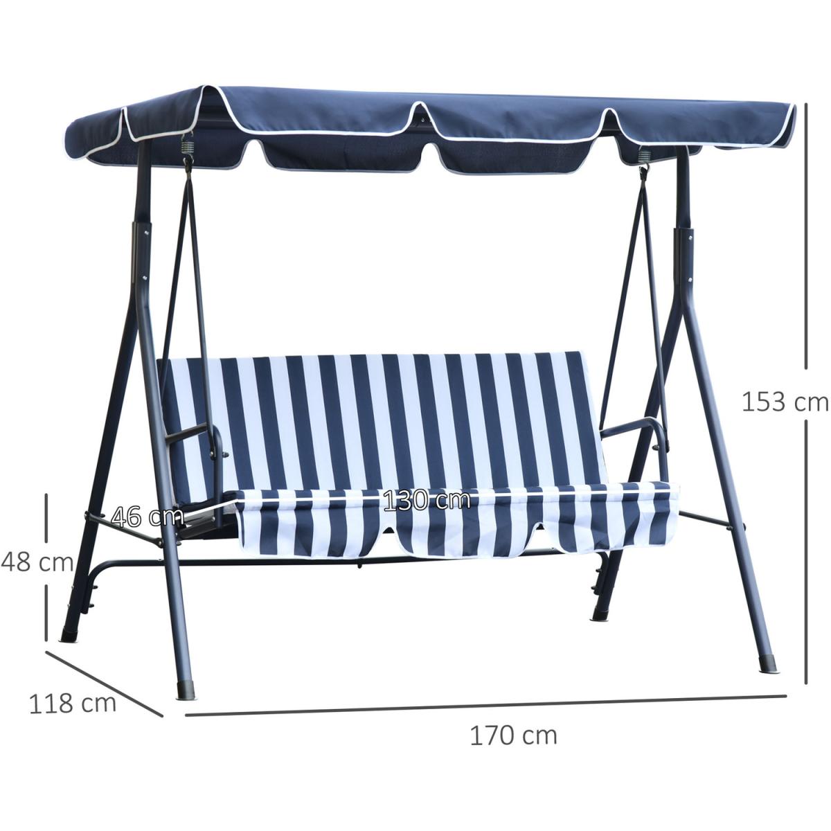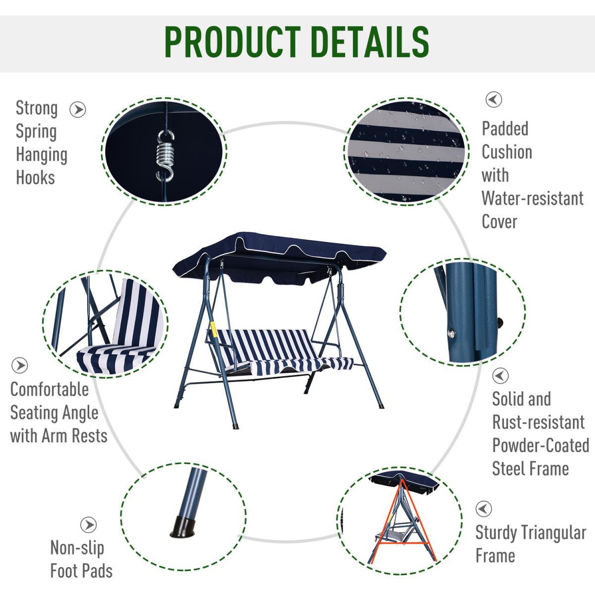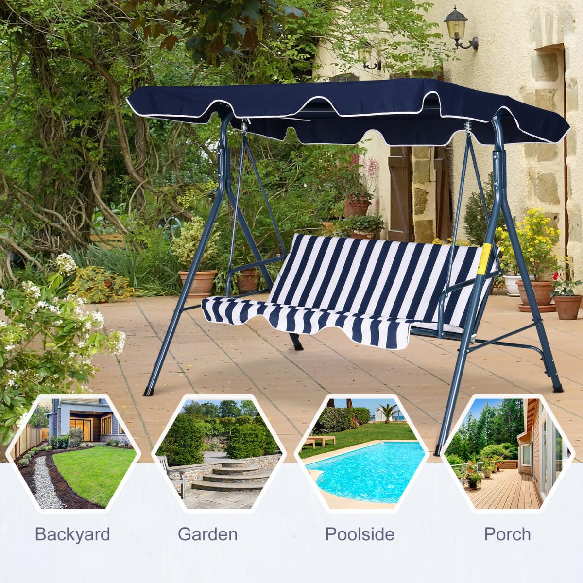 Relax in style and comfort - do it with this Outsunny garden swing chair. Seats up to three people plenty of room to relax with friends or grab extra room for yourself. The adjustable angle shields you from mild weather above at different positions. With a padded seat and high back, you'll be relaxing comfortably and with support. Sport stripes for style, this season and beyond!