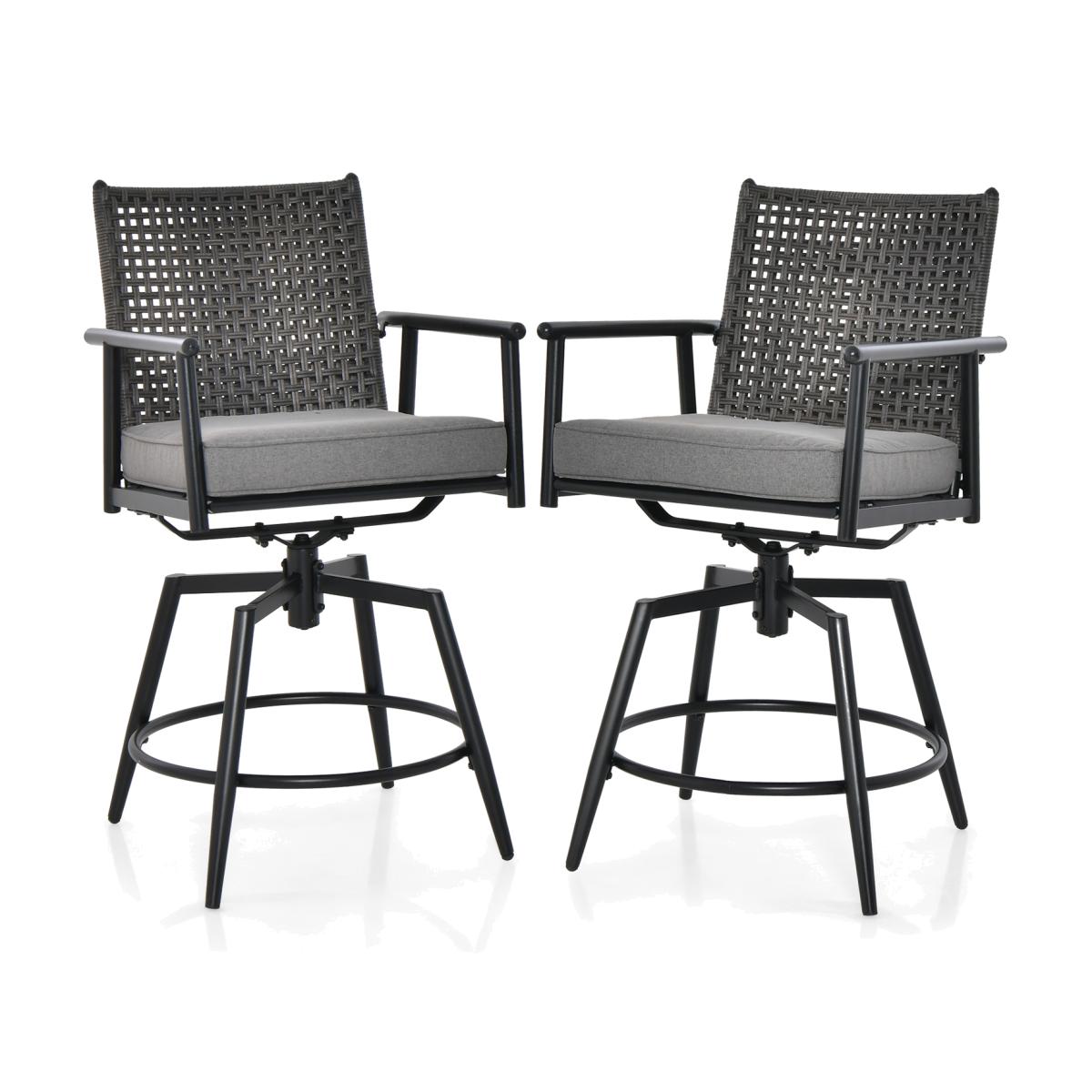 Revive your outdoor area with our exquisite set of 2 patio bar stools. The swivel seats allow you to effortlessly turn in any direction, perfect for engaging in face-to-face conversations. Crafted with durable PE rattan and a sturdy metal frame, these bar stools are designed to withstand the test of time. The seat cushion, filled with high-density sponge, ensures optimal comfort during extended sitting. When necessary, you can easily remove the cushion for convenient storage or cleaning. Whether placed by the poolside, in the backyard, or on the porch, these swivel bar stools will be the ideal companion for your outdoor space.