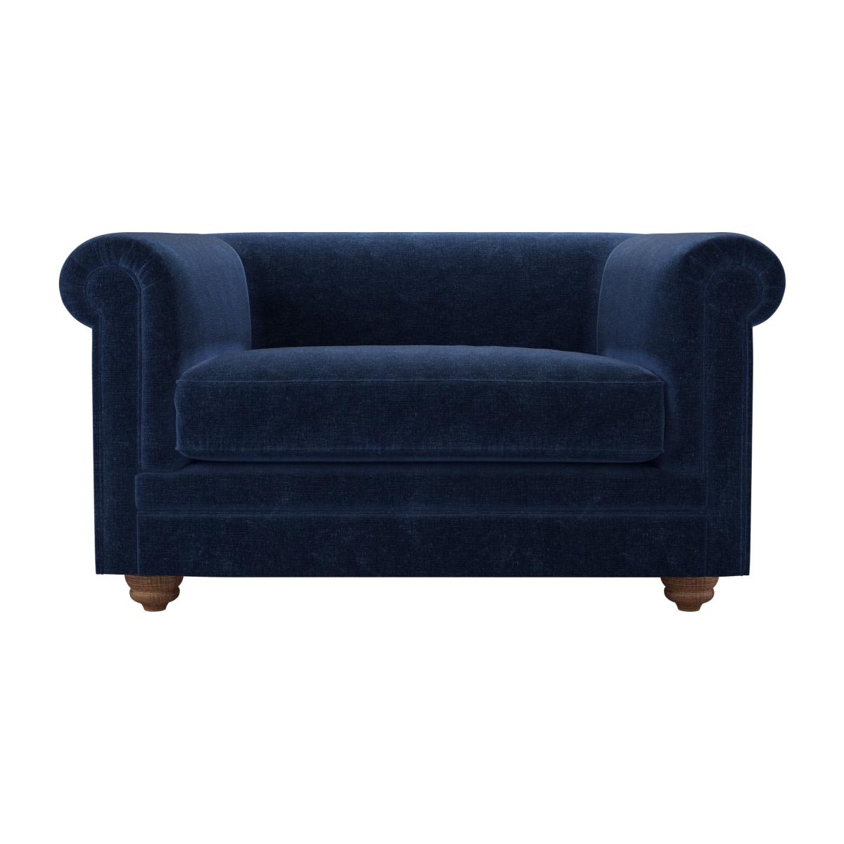 I love this loveseat for its classic shape combined with that rich Port Royal Aquaclean fabric, which adds a luxurious feel without sacrificing practicality. It works particularly well in traditional or eclectic interiors, but can also add a sophisticated touch to modern spaces when styled with contrasting accessories. Practical tips include pairing it with neutral or patterned cushions to soften the look, and placing it against a patterned wallpaper or textured wall to highlight its deep blue hue. Its compact size makes it great for smaller living rooms or cosy corners, and the Aquaclean fabric ensures easy maintenance, making it perfect for households with active lifestyles.