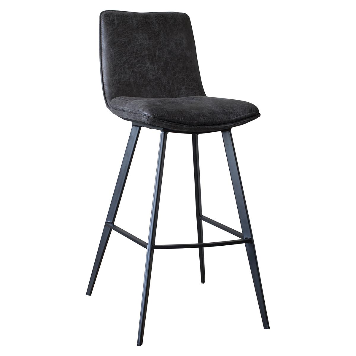 A contemporary design with a rustic twist, this stylish ebony faux leather bar stool is perfect for casual dining areas, featuring stitched seam detailing and sleek angled black metal legs.