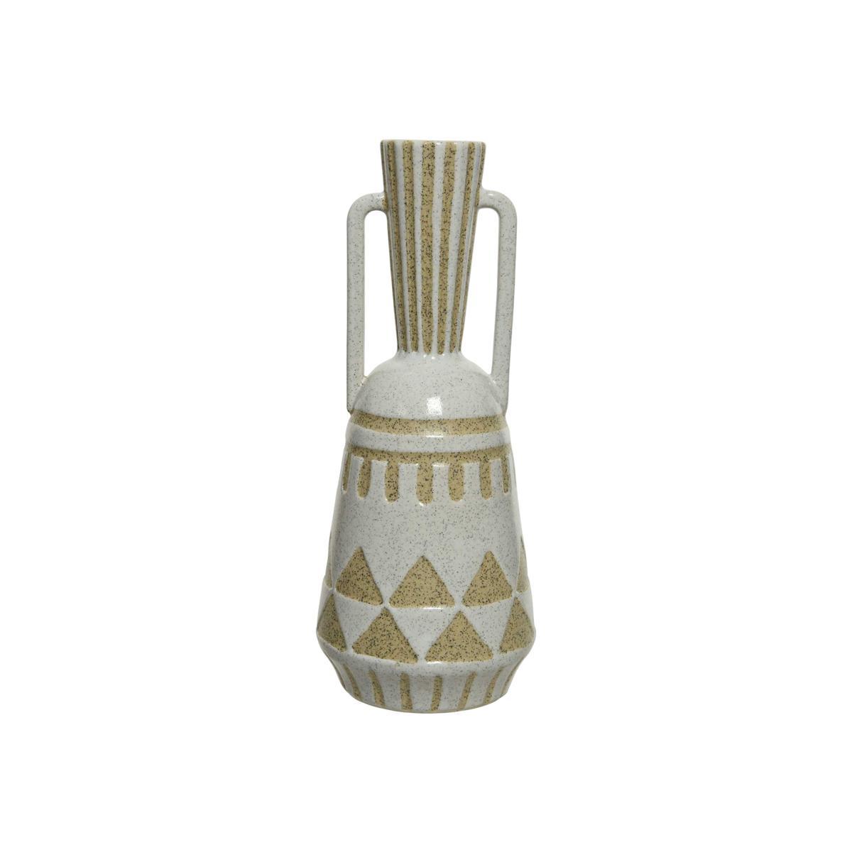 I really like this patterned ceramic vase for its versatility and understated charm. Its neutral tones and geometric design make it an easy addition to both modern and eclectic interiors, adding just the right touch of texture without overpowering other elements. It works particularly well on mantels, side tables, or open shelving, where it can be styled alone or with a few dried or fresh flowers for a simple focal point. My tip would be to keep the floral arrangement minimal to highlight the pattern; perhaps a single statement stem or branch will allow the vase's design to shine while maintaining a balanced look.