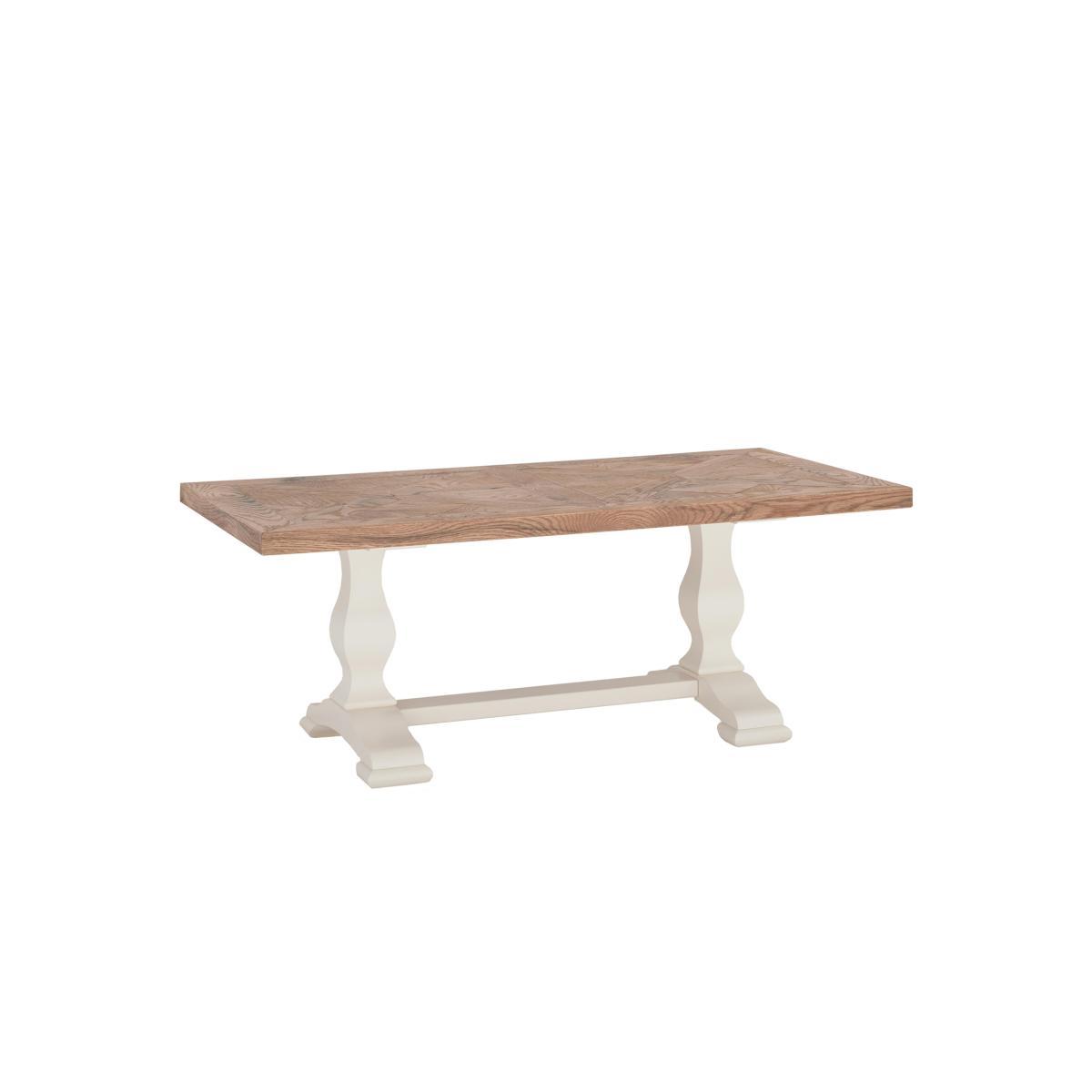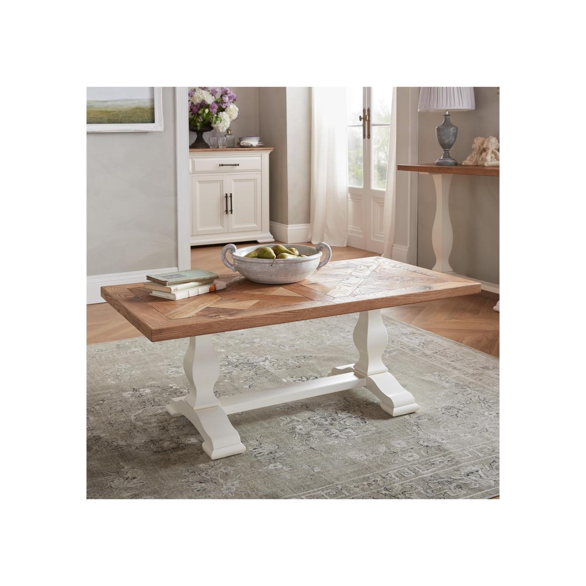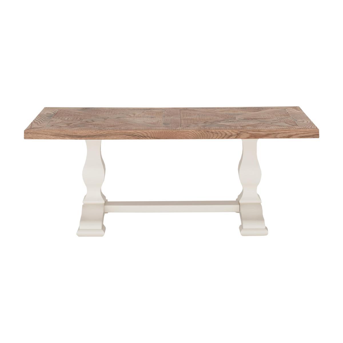 Blending gently rustic charm with beautiful marquetry patterning and traditional craftsmanship, the gorgeous Pattern collection of dining room furniture and living room storage pieces brings classic style to any home. This collection includes a large extending dining table – an elegant reinterpretation of traditional farmhouse style – along with sideboards, cabinets, occasional tables and a media unit, all of which feature wonderfully deep veneer tops with elaborate marquetry patterns. Storage piece frames are painted a soft ivory and have an abundance of well-crafted details like Blum soft-close drawers, dovetail joints and stylish bespoke antique brass handles. Choose from two styles of comfortable faux leather dining chair with decorative antique brass studding. Often the most simple designs are the best, and the Pattern coffee table is a case in point. Beautifully crafted and wonderfully functional, this coffee table provides a deep, wide surface for everything that you might want in a living room – a tray of drinks, a board game in progress, books and magazines, or even a vase of flowers. Its lovely rustic oak veneer top is finished with elaborate marquetry patterning in geometric shapes. The base is reminiscent of a classic farmhouse table and is turned and shaped most elegantly. Made with beech wood, the base is painted a soft ivory colour that provides a stylish and on trend contrast with the top’s rich oiled finish. The Pattern coffee table is part of the Pattern range of elegant two-tone dining room and living room furniture. Other occasional tables in the range include the Pattern console table and the Pattern lamp table. Top tip: This coffee table’s top uses rustic American white oak solid timber and veneers and may show natural colour variation, knots, mineral streaks, pinholes and sapwood, as well as hand planing and saw marks. Did you know? The tops feature deep veneers with elaborate marquetry patterns. Each one is unique to that individual piece.