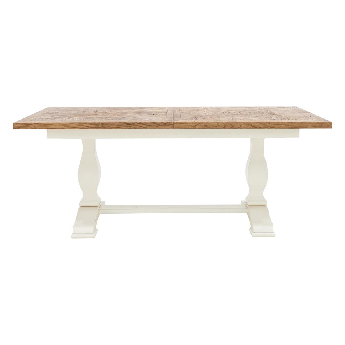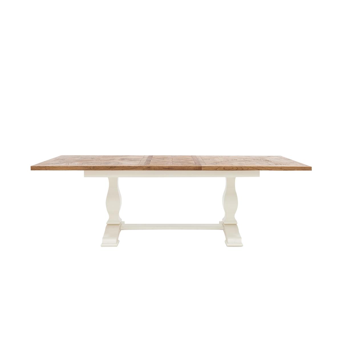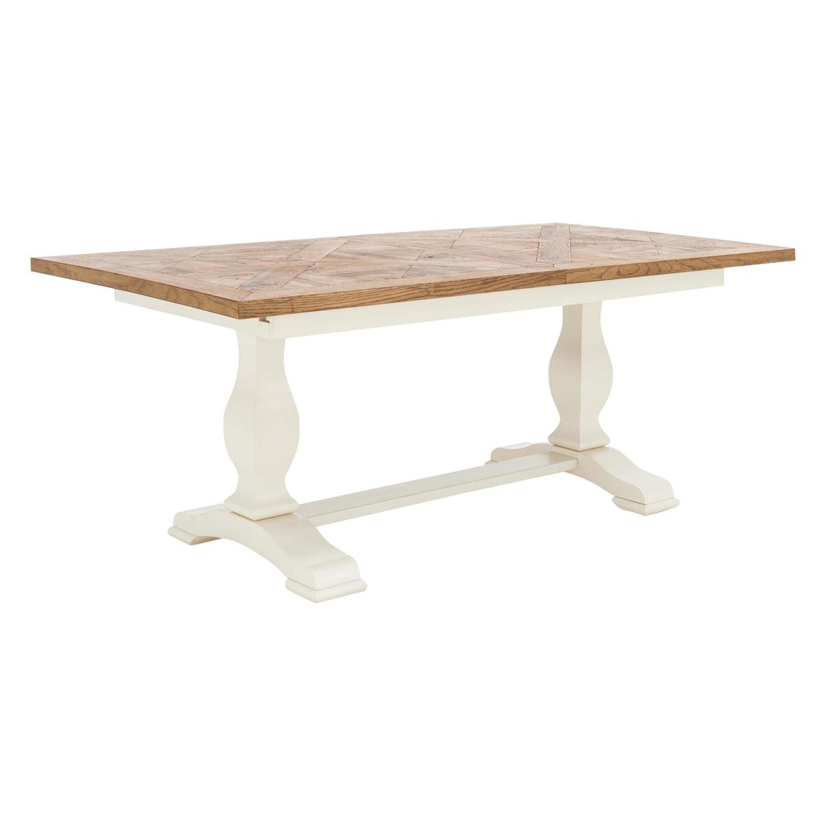 Relaxed country style meets an entirely elegant finish in the Pattern extending dining table. This large table has a traditional farmhouse table base, beautifully turned and shaped, made of solid beech and painted a soft ivory. Its beautiful rustic oak veneer top is unusually thick and features a gorgeous geometric marquetry patterning sealed with a rich oiled finish. The reciprocal extension mechanism means that this table extends easily to seat eight; the extra leaf stores neatly within the table. Part of the extensive Pattern collection of dining and living room furniture, the Pattern extending dining table pairs perfectly with either the Pattern pair of dining chairs or the Pattern pair of oversized scoop dining chairs. Top tip:This dining tables top uses rustic American white oak solid timber and veneers and may show natural colour variation, knots, mineral streaks, pinholes and sapwood, as well as hand planing and saw marks. Did you know?:The tops feature deep veneers with elaborate marquetry patterns. Each one is unique to that individual piece.