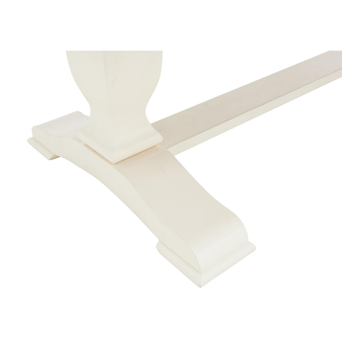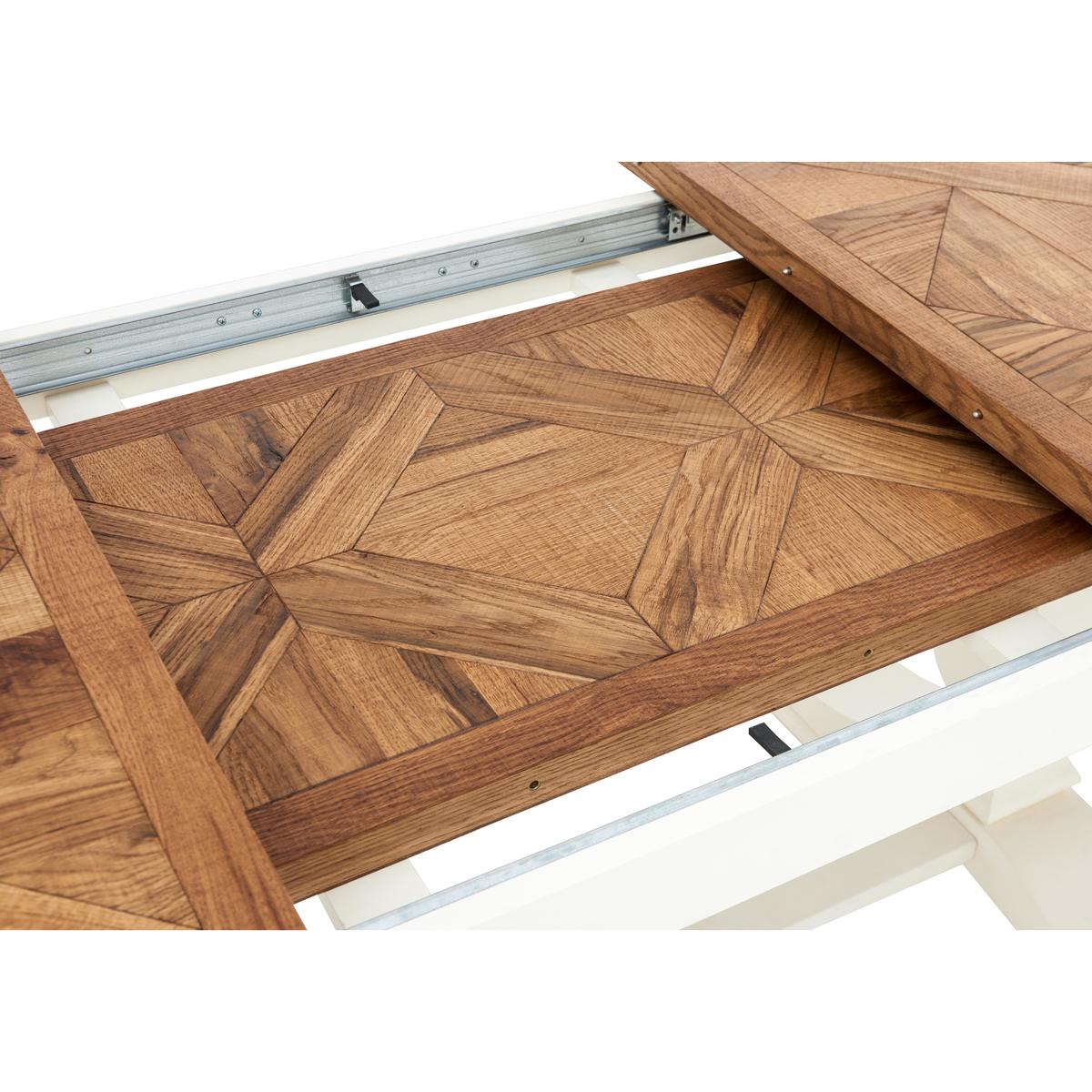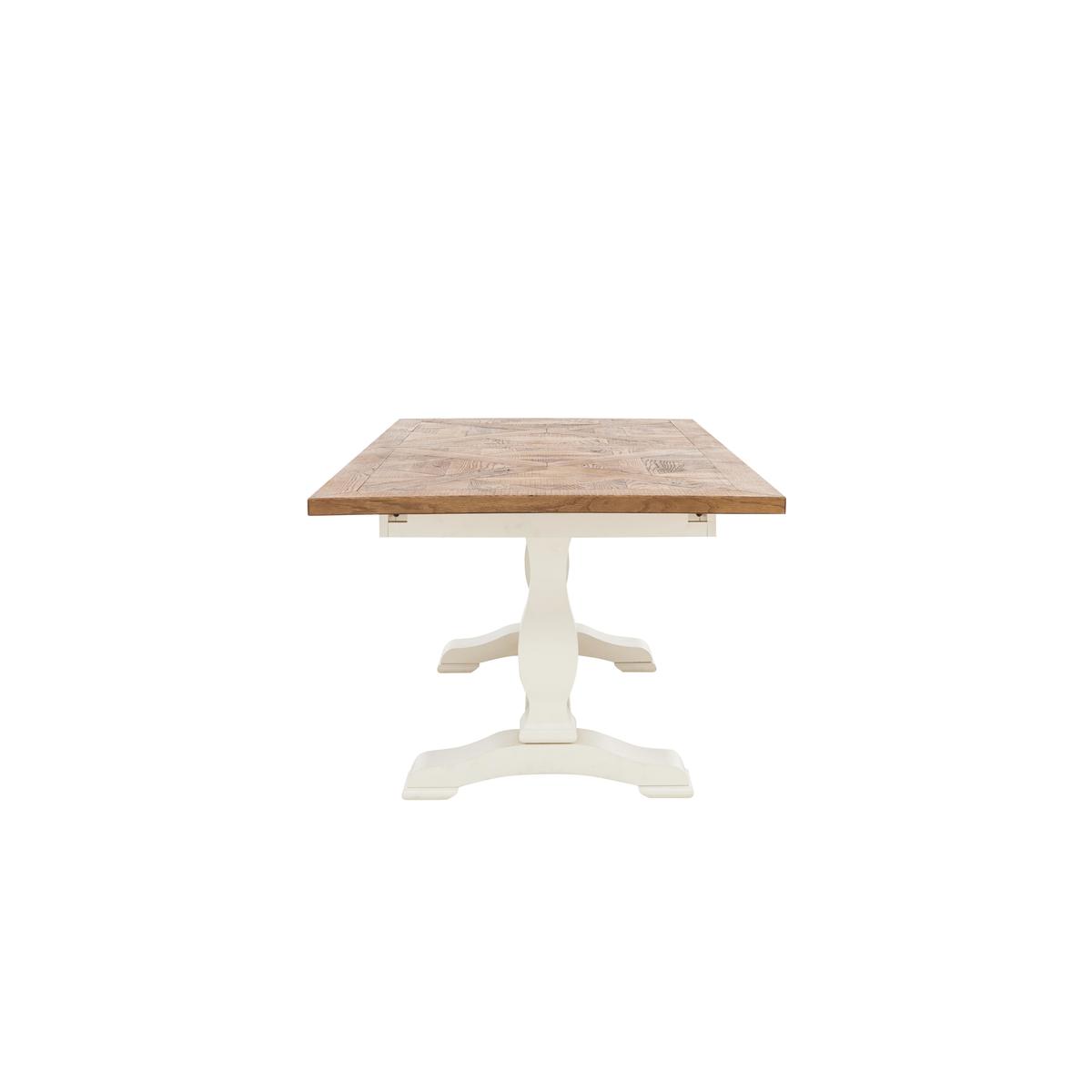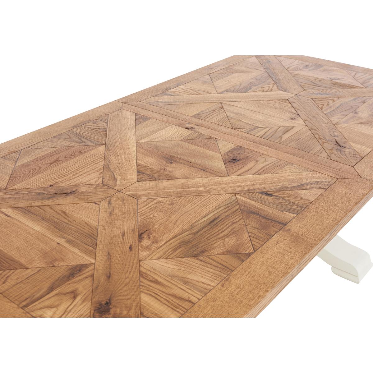 Relaxed country style meets an entirely elegant finish in the Pattern extending dining table. This large table has a traditional farmhouse table base, beautifully turned and shaped, made of solid beech and painted a soft ivory. Its beautiful rustic oak veneer top is unusually thick and features a gorgeous geometric marquetry patterning sealed with a rich oiled finish. The reciprocal extension mechanism means that this table extends easily to seat eight; the extra leaf stores neatly within the table. Part of the extensive Pattern collection of dining and living room furniture, the Pattern extending dining table pairs perfectly with either the Pattern pair of dining chairs or the Pattern pair of oversized scoop dining chairs. Top tip:This dining tables top uses rustic American white oak solid timber and veneers and may show natural colour variation, knots, mineral streaks, pinholes and sapwood, as well as hand planing and saw marks. Did you know?:The tops feature deep veneers with elaborate marquetry patterns. Each one is unique to that individual piece.