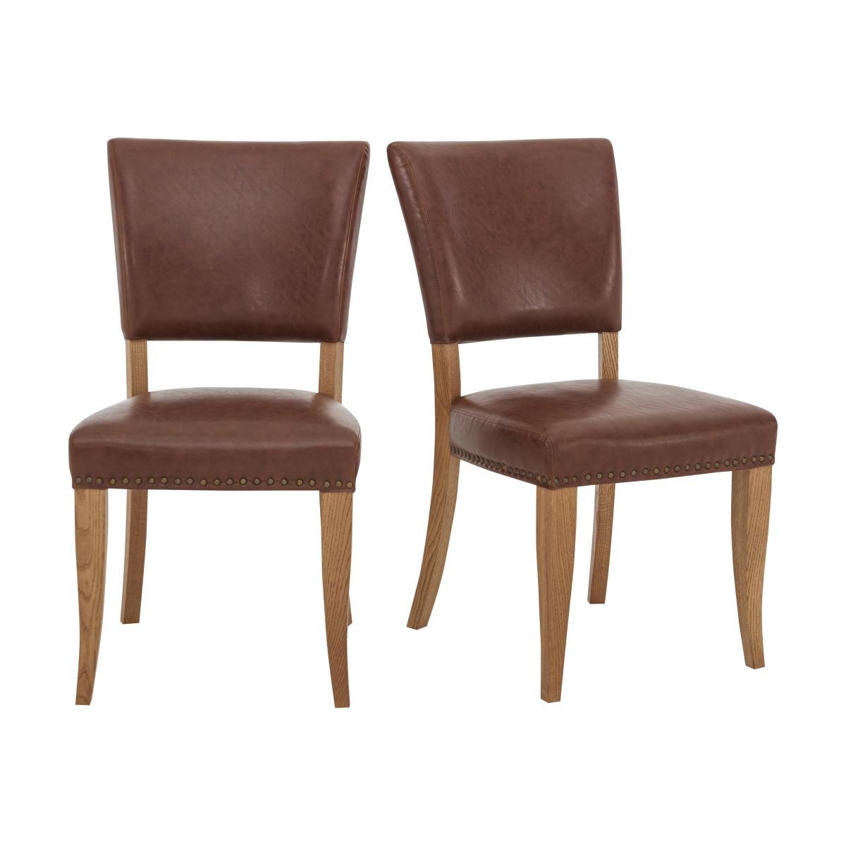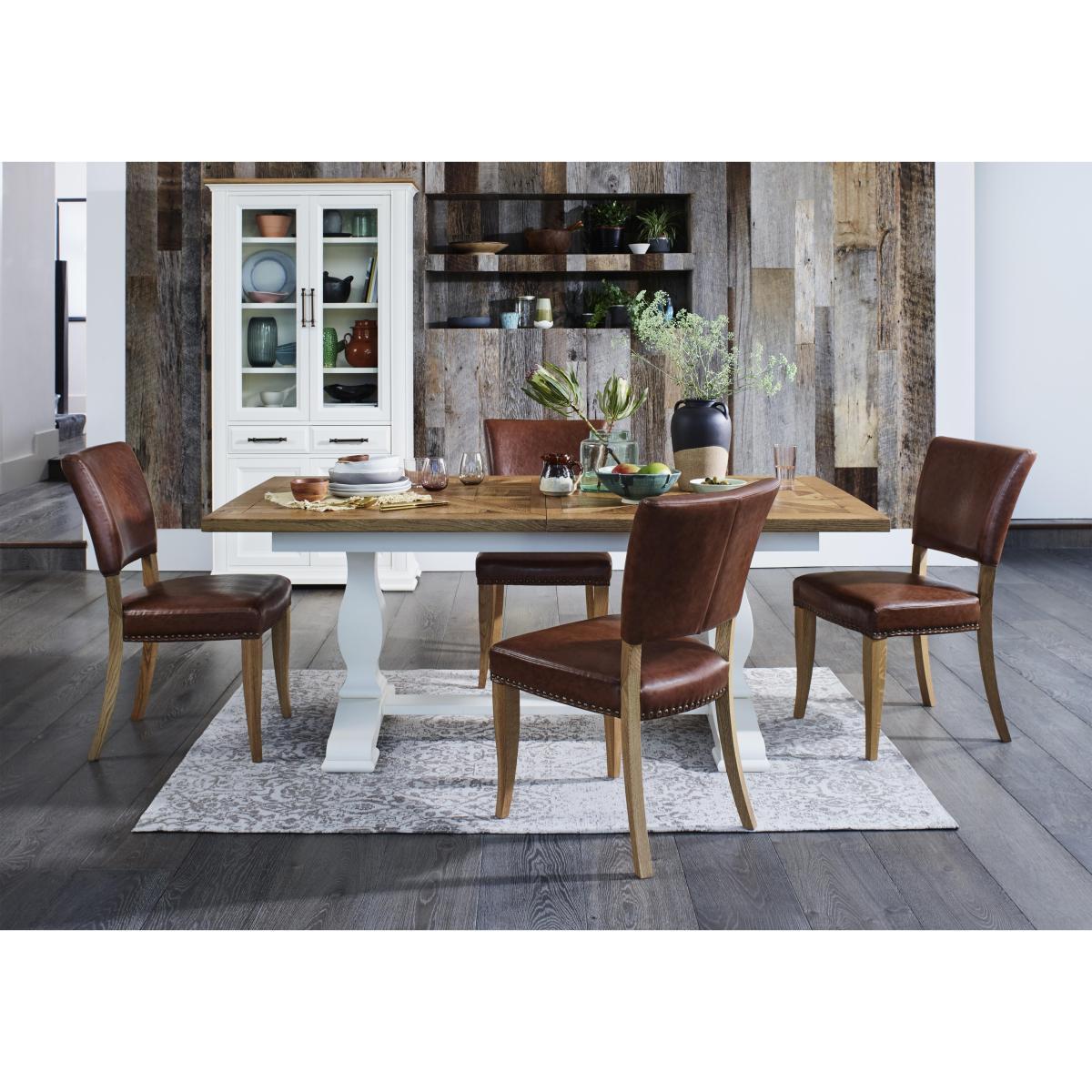 Blending gently rustic charm with beautiful marquetry patterning and traditional craftsmanship, the gorgeous Pattern collection of dining room furniture and living room storage pieces brings classic style to any home. This collection includes a large extending dining table – an elegant reinterpretation of traditional farmhouse style – along with sideboards, cabinets, occasional tables and a media unit, all of which feature wonderfully deep veneer tops with elaborate marquetry patterns. Storage piece frames are painted a soft ivory and have an abundance of well-crafted details like Blum soft-close drawers, dovetail joints and stylish bespoke antique brass handles. Choose from two styles of comfortable faux leather dining chair with decorative antique brass studding. The Pattern pair of dining chairs combines traditional craftsmanship and detailing with casual modern style. They’re so comfortable too – seats are sprung, backs are supportive, and the easy-care faux leather upholstery is super soft. Chairs have solid beech frames and are available with your choice of white-painted or oak legs with tan or espresso upholstery. All colourways feature a decorative antique brass studding detail along the seat front edge, a traditional touch and a nice contrast to the more modern open-back style. The Pattern pair of dining chairs is part of the wide range of Pattern dining room furniture and living room storage pieces, and perfectly complements the Pattern extending dining table with ivory painted base and gorgeous marquetry veneer top. A scoop-back style dining chair is also available.