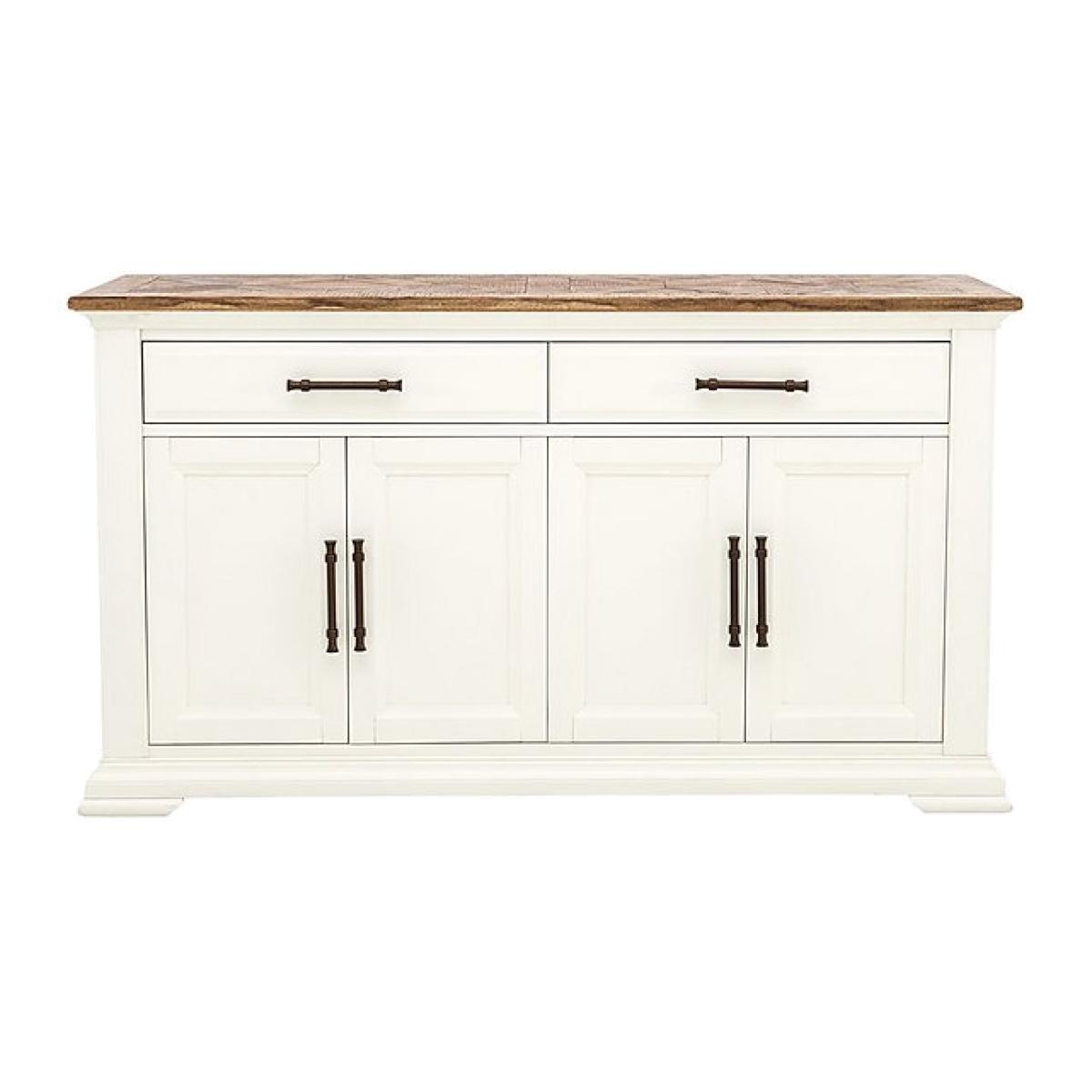 Stock code: 9180IL4230. 4 Please note: this clearance item has limited stock and is subject to availability. With it elegant profile and fabulous marquetry patterned top, the Pattern wide sideboard offers the most stylish storage. This lovely piece is made with solid beech wood painted a soft ivory colour. The top has deep, rustic oak veneers with a gorgeous geometric pattern and a rich oiled finish. Two double- door cupboards each have a shelf for dining ware and glasses. The two roomy drawers have well- crafted dovetailed joints and Blum soft close runners. Doors and drawers have statement antique brass- finished linear handles. The Pattern wide sideboard is part of the beautifully- made Pattern range of living and dining room furniture. In the dining room, this pairs beautifully with the Pattern display cabinet. Top tip:This sideboards top features rustic American white oak solid timber and veneers and may show natural colour variation, knots, mineral streaks, pinholes and sapwood, as well as hand planing and saw marks. WARNING! Furniture can tip over unexpectedly and cause injury. This item must be fixed to a wall using the anti- tip kit provided. Be sure to use the correct wall fixings suitable for the walls in your home. Furniture Village is not able to fix anti- tip devices for you. Seek professional advice if you are unsure.