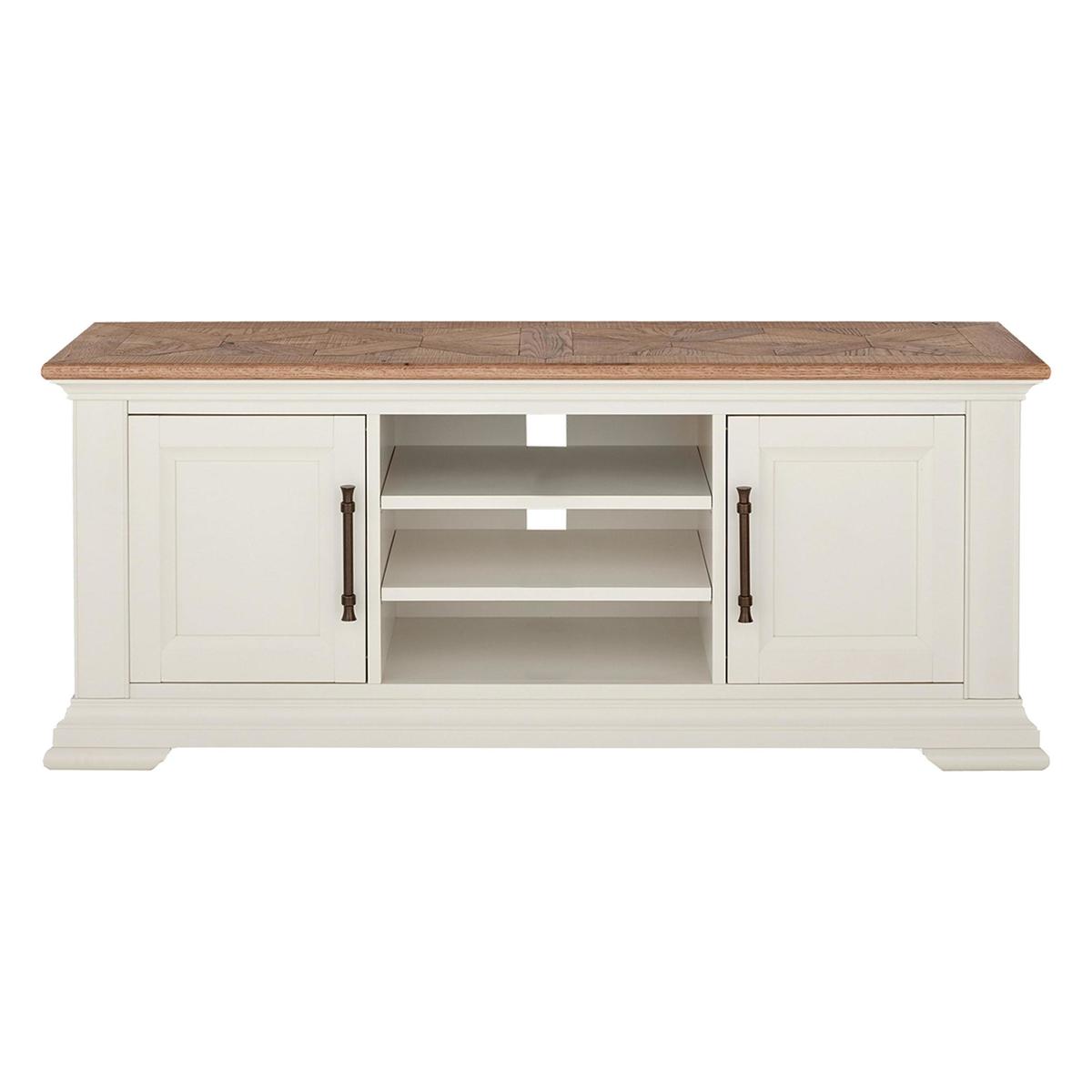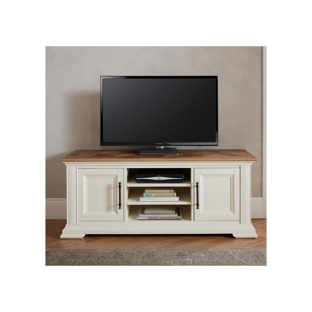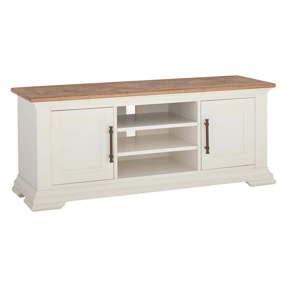 Blending gently rustic charm with beautiful marquetry patterning and traditional craftsmanship, the gorgeous Pattern collection of dining room furniture and living room storage pieces brings classic style to any home. This collection includes a large extending dining table – an elegant reinterpretation of traditional farmhouse style – along with sideboards, cabinets, occasional tables and a media unit, all of which feature wonderfully deep veneer tops with elaborate marquetry patterns. Storage piece frames are painted a soft ivory and have an abundance of well-crafted details like Blum soft-close drawers, dovetail joints and stylish bespoke antique brass handles. Choose from two styles of comfortable faux leather dining chair with decorative antique brass studding. In the Pattern wide TV unit, a living room essential becomes a beautiful piece of furniture. Stylish and elegant, this TV cabinet combines superb craftsmanship and lovely details with great storage capabilities. With two cupboards and an open area with three shelves, there’s plenty of room for all your media components either tucked away or on display. And cable holes at the rear keep leads neat and tidy, too. And alongside incredible functionality, this piece also looks wonderful. The rustic oak veneer top, deep and slight overhanging, has wonderful geometric marquetry patterning. The frame is made with solid beech wood painted a soft and elegant ivory colour, and the panelled doors are finished with antique brass-effect handles. Part of the Pattern collection of living and dining room pieces, the Pattern wide sideboard is one of several storage pieces. The range also includes two sizes of sideboard and a display cabinet. Top tip. This TV unit’s top uses rustic American white oak solid timber and veneers and may show natural colour variation, knots, mineral streaks, pinholes and sapwood, as well as hand planing and saw marks. Did you know? The tops feature deep veneers with elaborate marquetry patterns. Each one is unique to that individual piece.