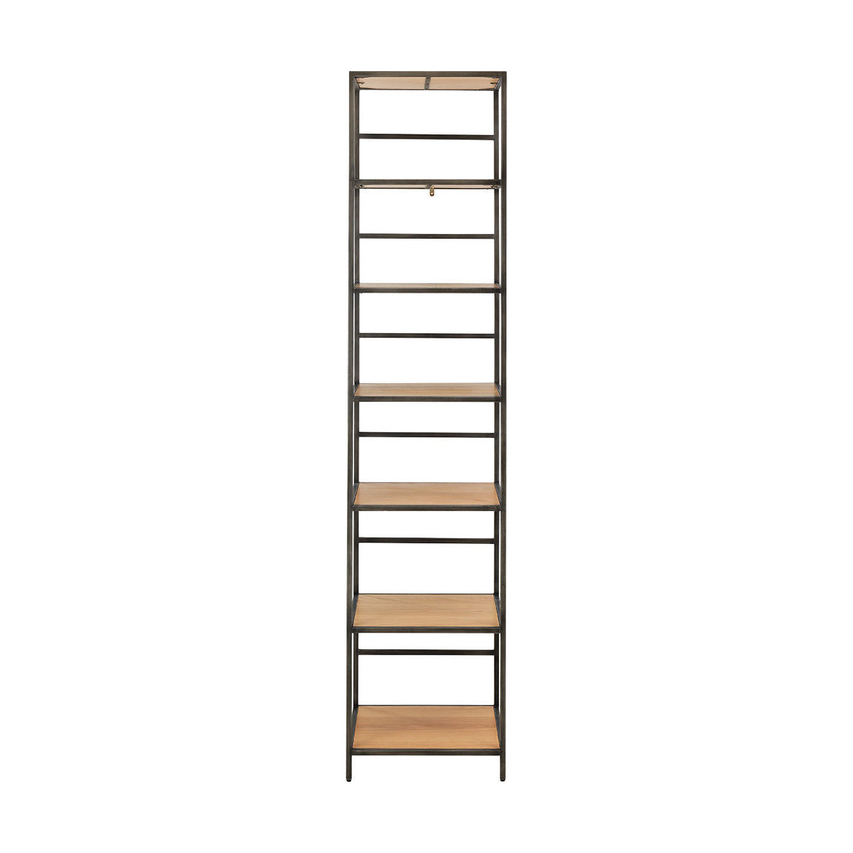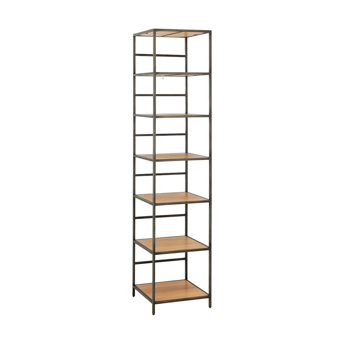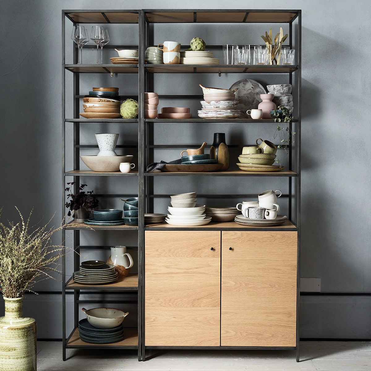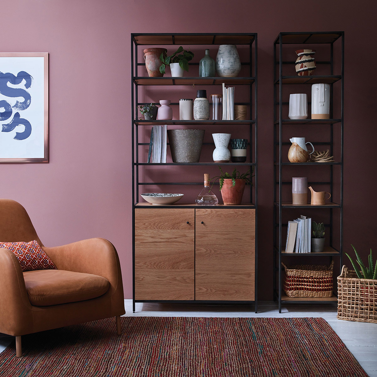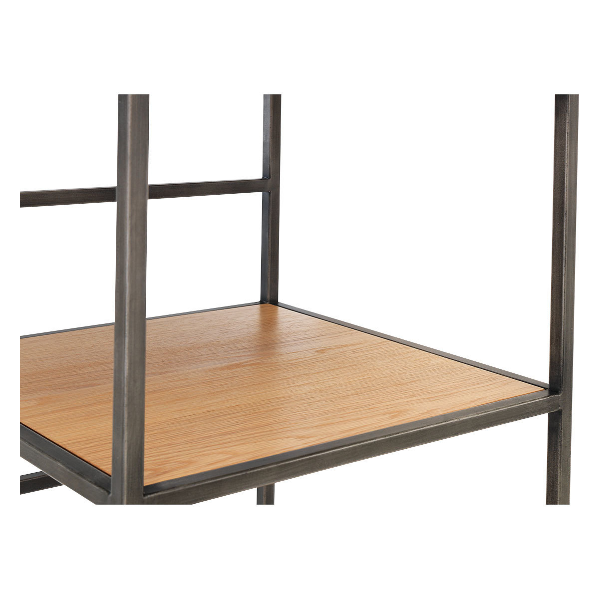 The Patton oak and metal bookcase with 5 shelves is a contemporary design with an industrial feel and contrasting textures.;The unit's wild grain oak veneer provides a strong textural contrast with the black steel frame. It's 5 shelves can be used to display a variety of objects from books and photos to tableware and glasses.;Supplied fully assembled, the unit can be used as standalone piece or combined with other designs in the Patton range to create a wall of storage in a living room, home office or kitchen.