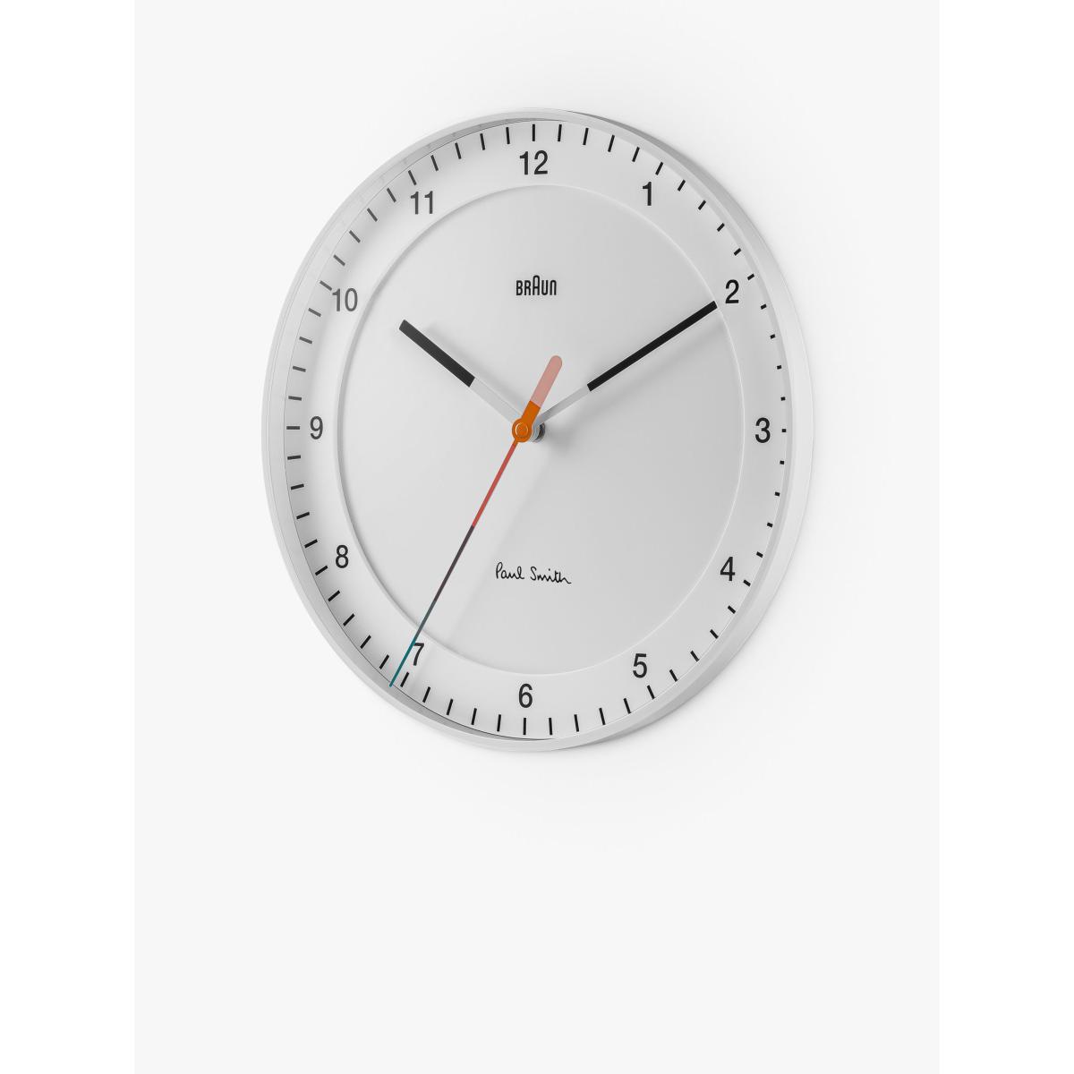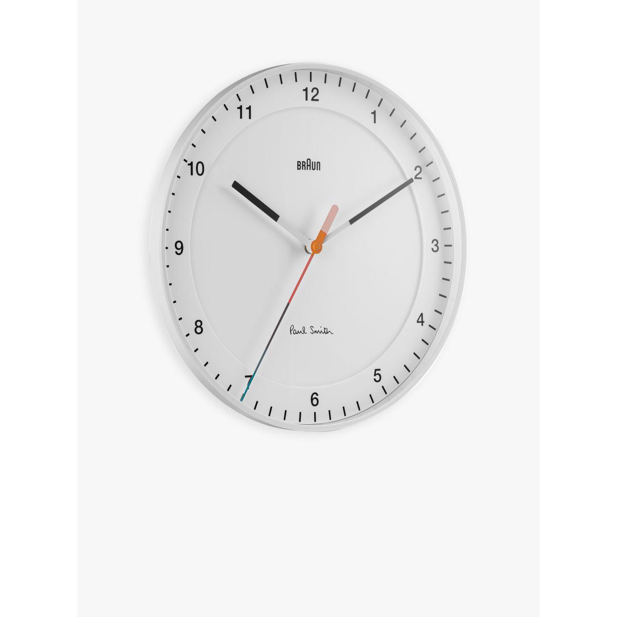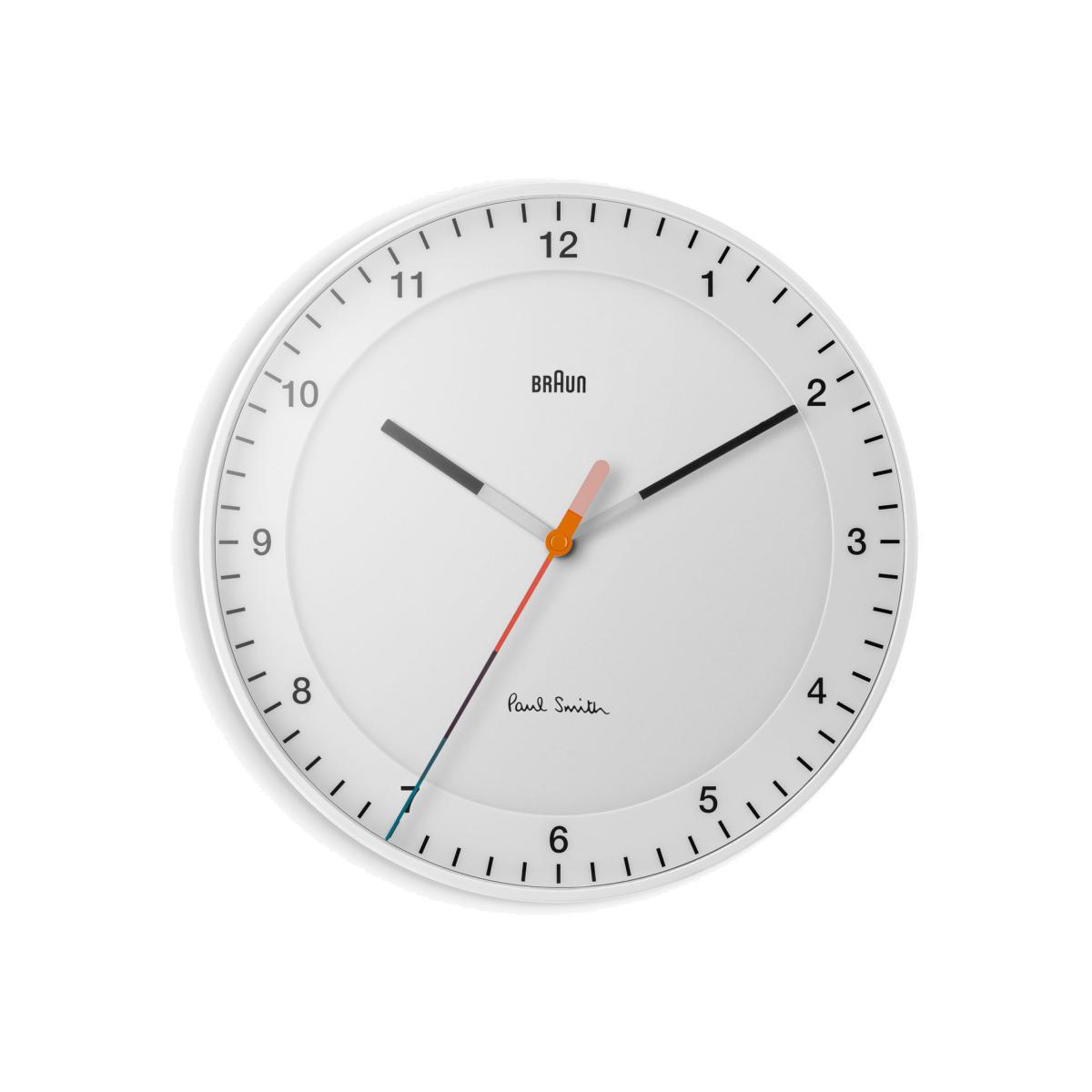 Braun innovation meets Paul Smith design with this round wall clock. This clock has an easy-to-read round analogue clock face with Paul Smith branding and his signature multi-colour Artist Stripe on the second hand. The silent-sweep movement eliminates the usual ticking noise, making this clock quieter than most.