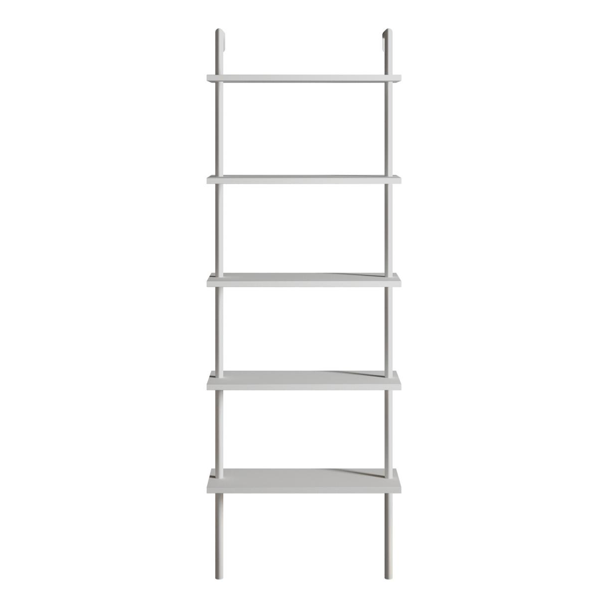 Paulina 68 inches tall metal wood ladder bookcase will add a combination of classic-modern style to your study room with its unique design. Wall-mounted interconnected cylinder shape metal frame pieces make it sturdy, elegant, and durable. 5-tier shelves will enable you to display your books just like you want. Thanks to its special design, you may place it in any corner and adjust its position. It can easily be mounted to the wall (wall-mounting hardware included). Shelves are made of 18mm thick quality melamine coated particle board and banded with first-class PVC edge banding tape. The bookcase frame is constructed from industrial metal. The metal frame is coated with scratch and impact-resistant industrial static paint. Overall, it is manufactured using eco-friendly and health-friendly materials.