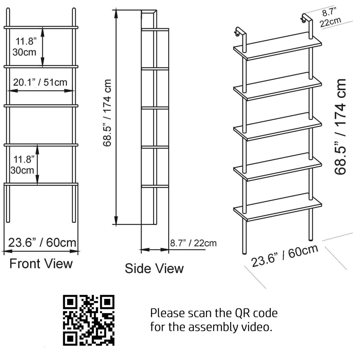 Paulina 68 inches tall metal wood ladder bookcase will add a combination of classic-modern style to your study room with its unique design. Wall-mounted interconnected cylinder shape metal frame pieces make it sturdy, elegant, and durable. 5-tier shelves will enable you to display your books just like you want. Thanks to its special design, you may place it in any corner and adjust its position. It can easily be mounted to the wall (wall-mounting hardware included). Shelves are made of 18mm thick quality melamine coated particle board and banded with first-class PVC edge banding tape. The bookcase frame is constructed from industrial metal. The metal frame is coated with scratch and impact-resistant industrial static paint. Overall, it is manufactured using eco-friendly and health-friendly materials.