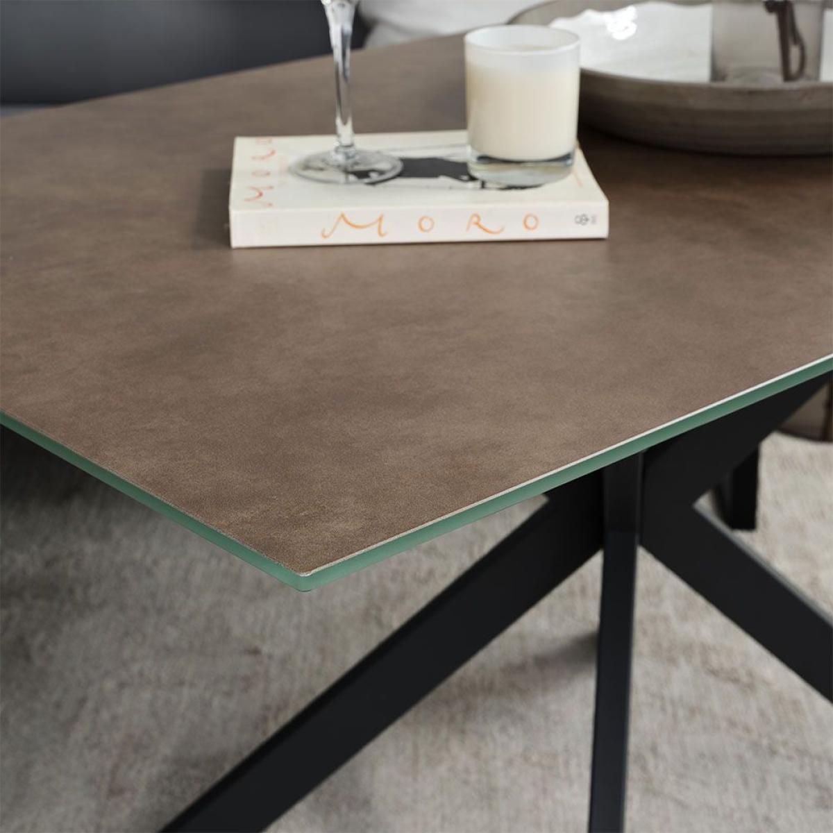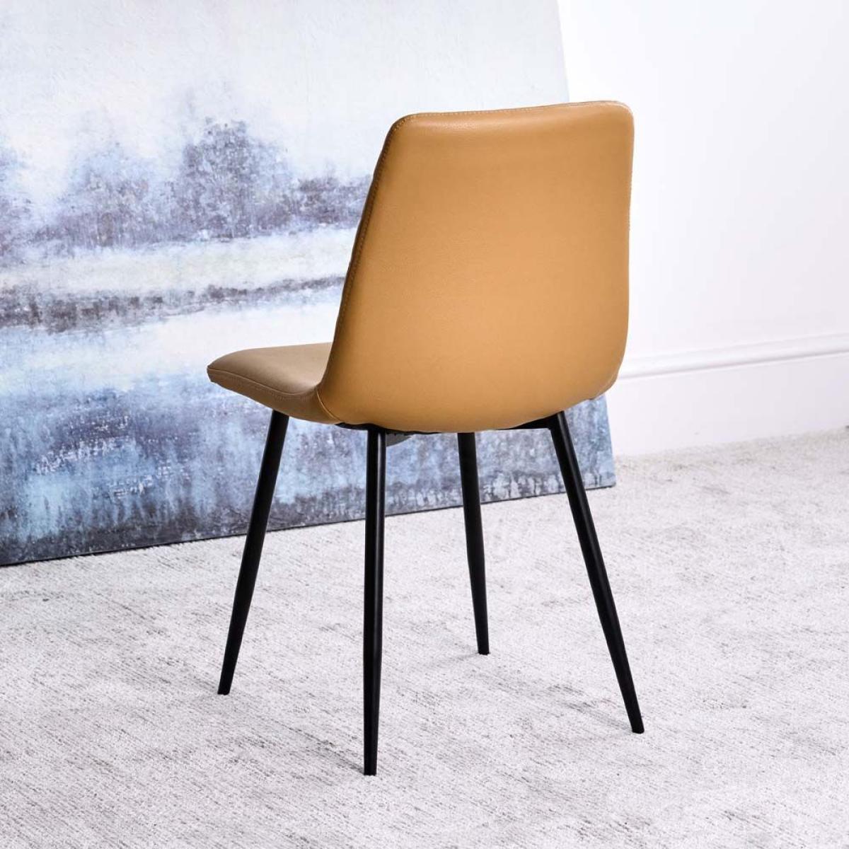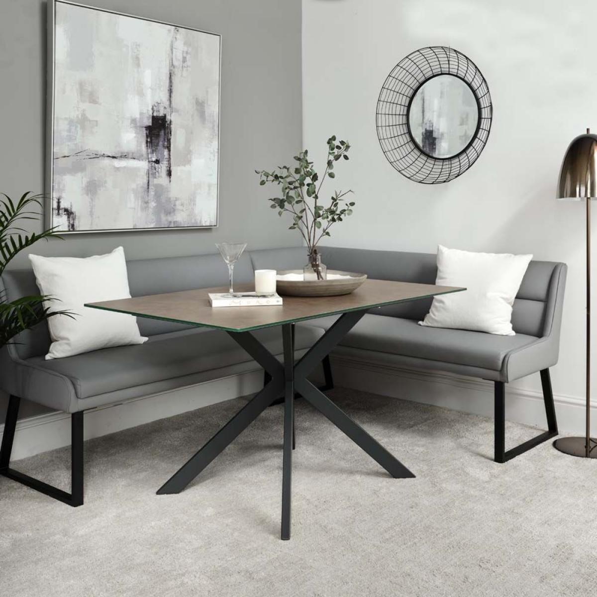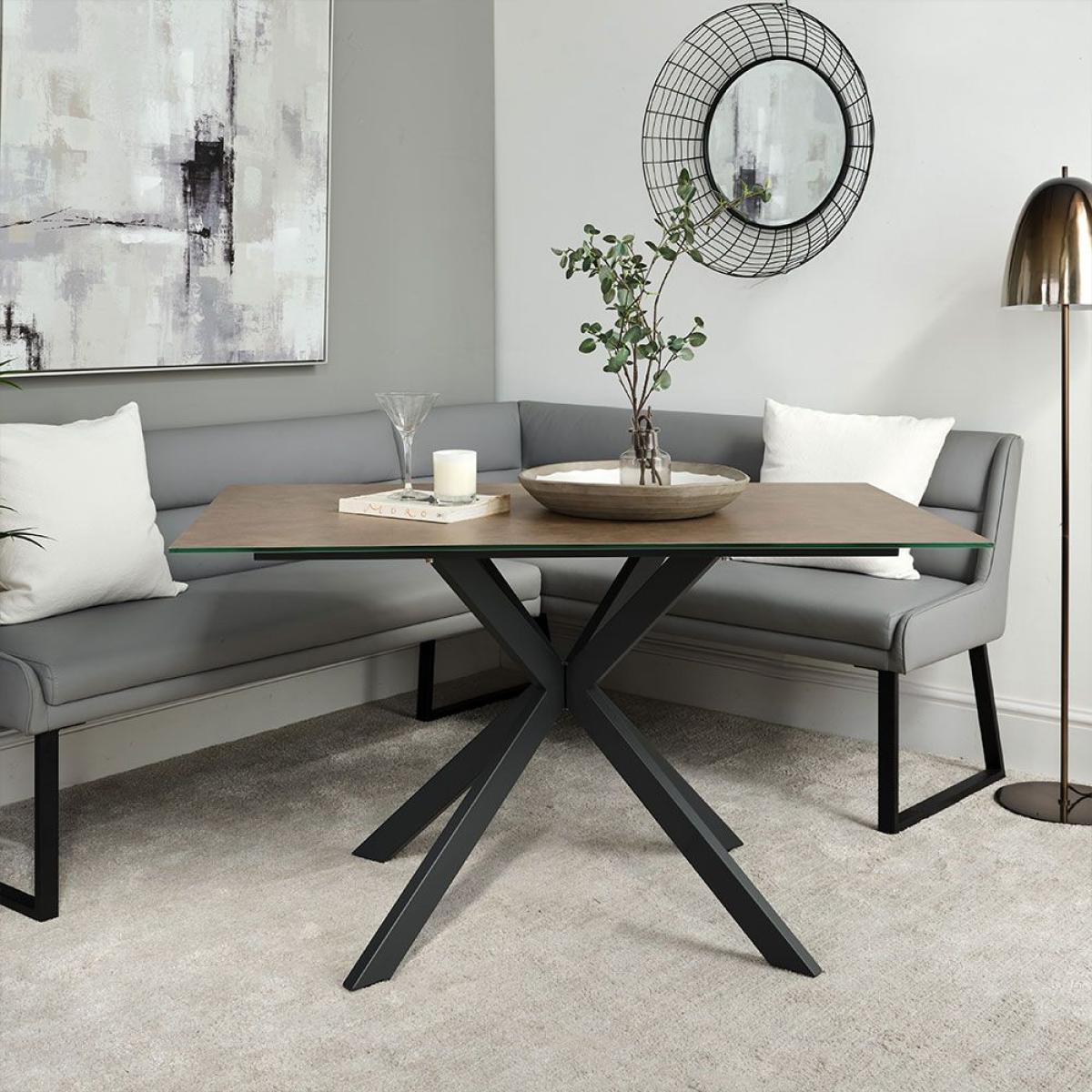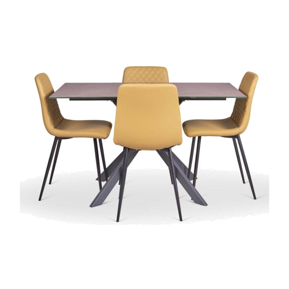 Enjoy sleek modern lines with this perfect combination bundle of our Paulo Dining Table and four Ripley Dining Chairs in Mustard. The table features a durable coated glass top with a concrete effect finish and is supported by a stunning star formation black metal leg. The popular Ripley chairs are upholstered in a faux leather fabric with diamond quilted back detail and sits on top of trendy black metal legs. The set together would be perfect for any modern kitchen/diner.