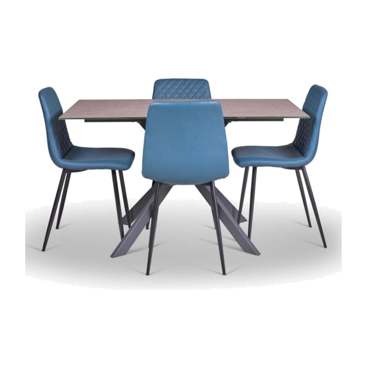 Enjoy sleek modern lines with this perfect combination bundle of our Paulo Dining Table and four Ripley Dining Chairs in Teal. The table features a durable coated glass top with a concrete effect finish and is supported by a stunning star formation black metal leg. The popular Ripley chairs are upholstered in a faux leather fabric with diamond quilted back detail and sits on top of trendy black metal legs. The set together would be perfect for any modern kitchen/diner.