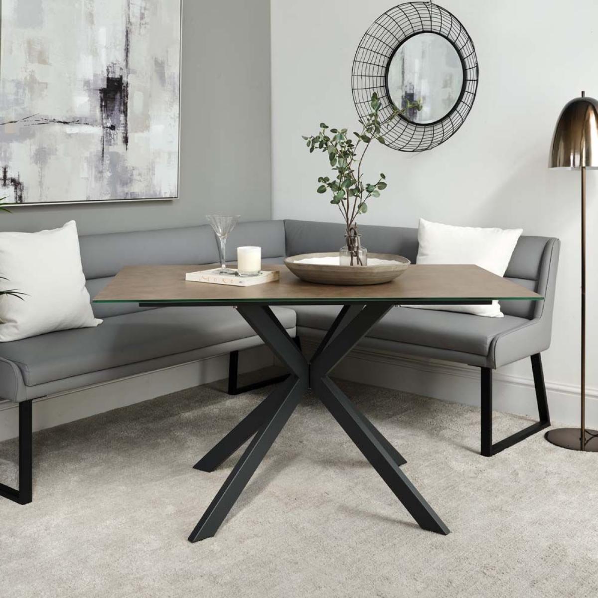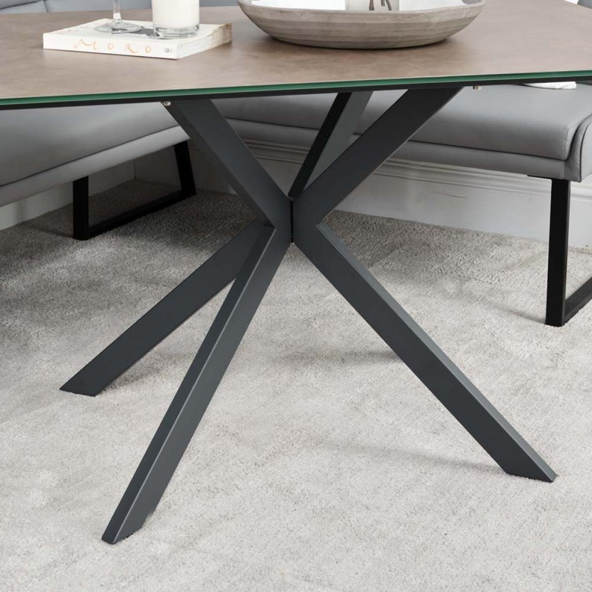 The Paulo Dining Table is a sleek coated glass dining table, with a concrete effect finish on it's surface. Supported by a star formation set of heavy industrial style black metal legs, this dining table is a great choice for the modern kitchen/diner.