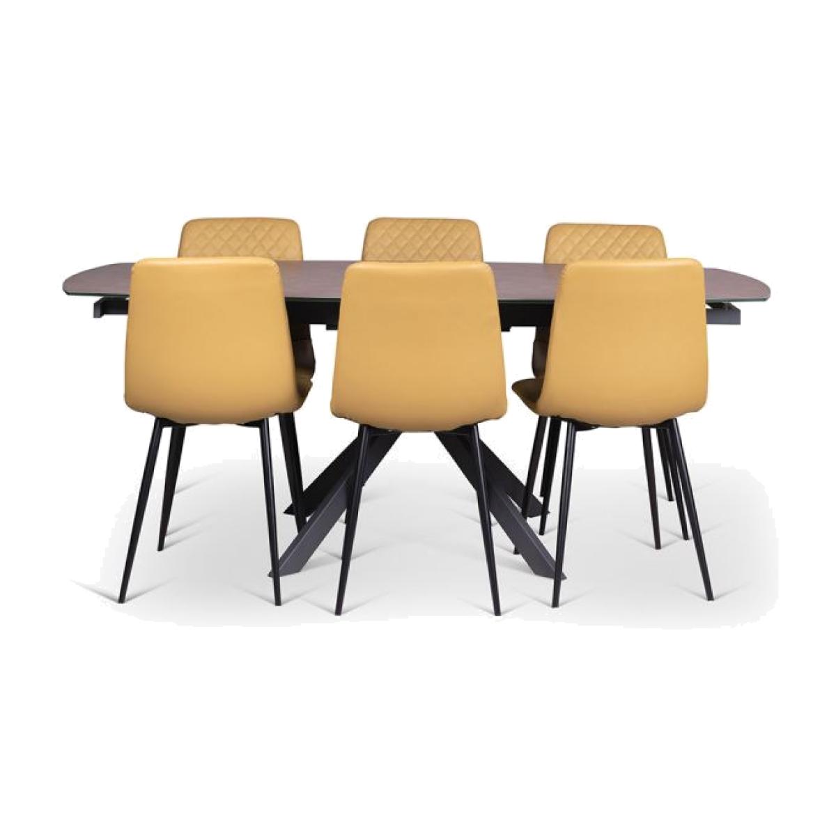 Sleek modern lines combined with perfect flexibility is offered with this dining bundle of our Paulo Motion Dining Table and six Ripley Dining Chairs in Mustard. The table extends with a smooth motion of turning the centre platter and features a durable coated glass top with a concrete effect finish. The table is topped off with a stunning star formation black metal leg creating a cool industrial feel. The popular Ripley chairs are upholstered in a faux leather fabric with diamond quilted back detail and sits on top of trendy black metal legs. The set together would be perfect for any modern kitchen/diner.