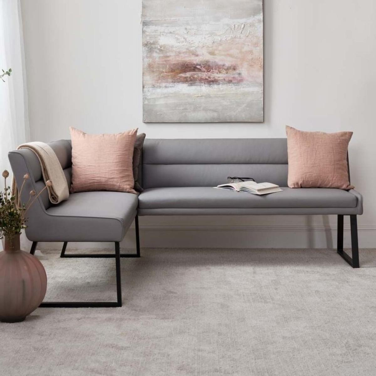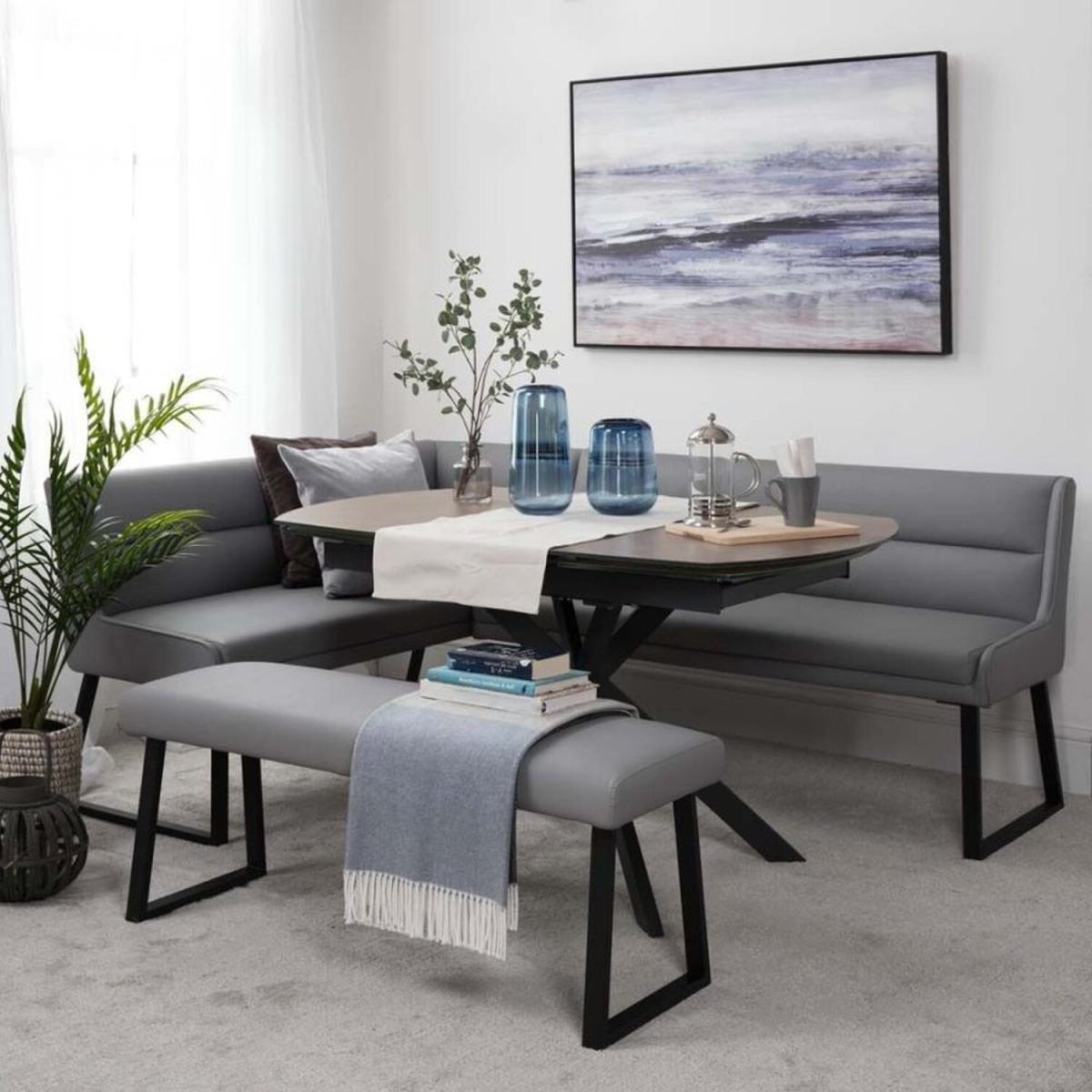 Included in this amazing bundle offer is the Paulo Extending Dining, Paulo Right Hand Facing Bench plus the Paulo Low Bench all by Baker Furniture. The perfect set for any modern kitchendiner, the large and sleek coated glass table extends from 140cm to 200cm by rotating the centre platter in a smooth motion. Supported on star formation industrial dark grey metal legs and combined flawlessly with the Paulo corner bench and low bench, great for socialising and communal dining. The benches both have soft grey faux leather upholstery and thick dark grey metal supports, ready to accommodate you and your guests at mealtimes.