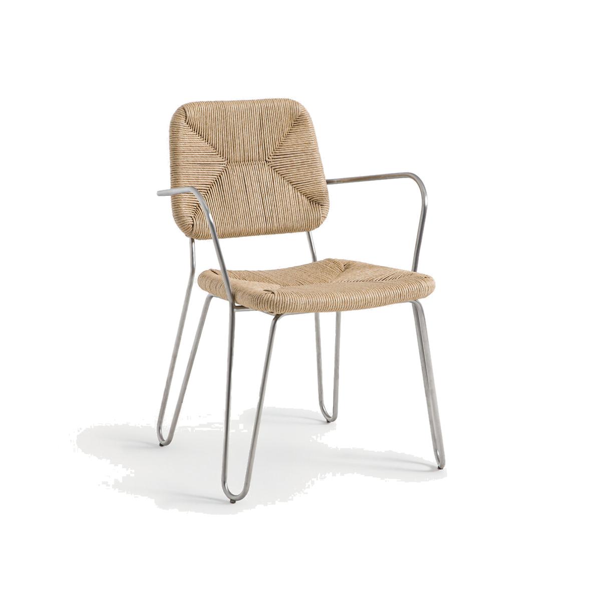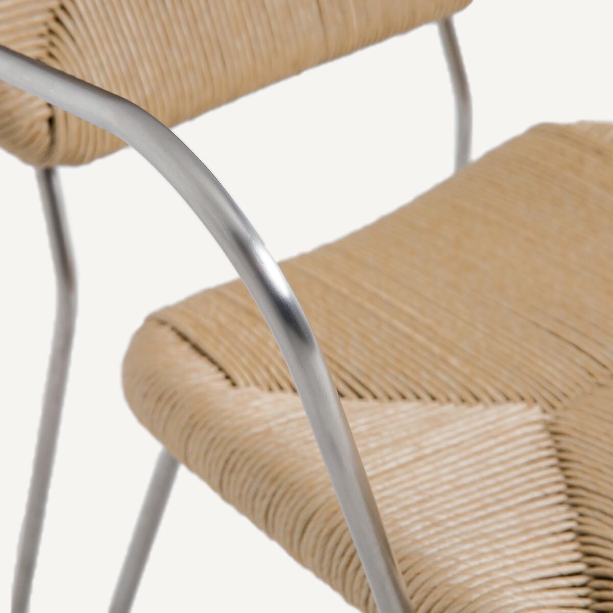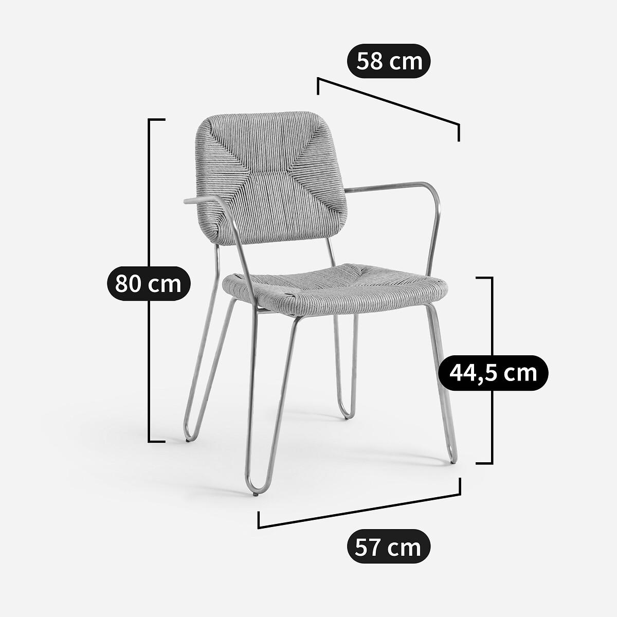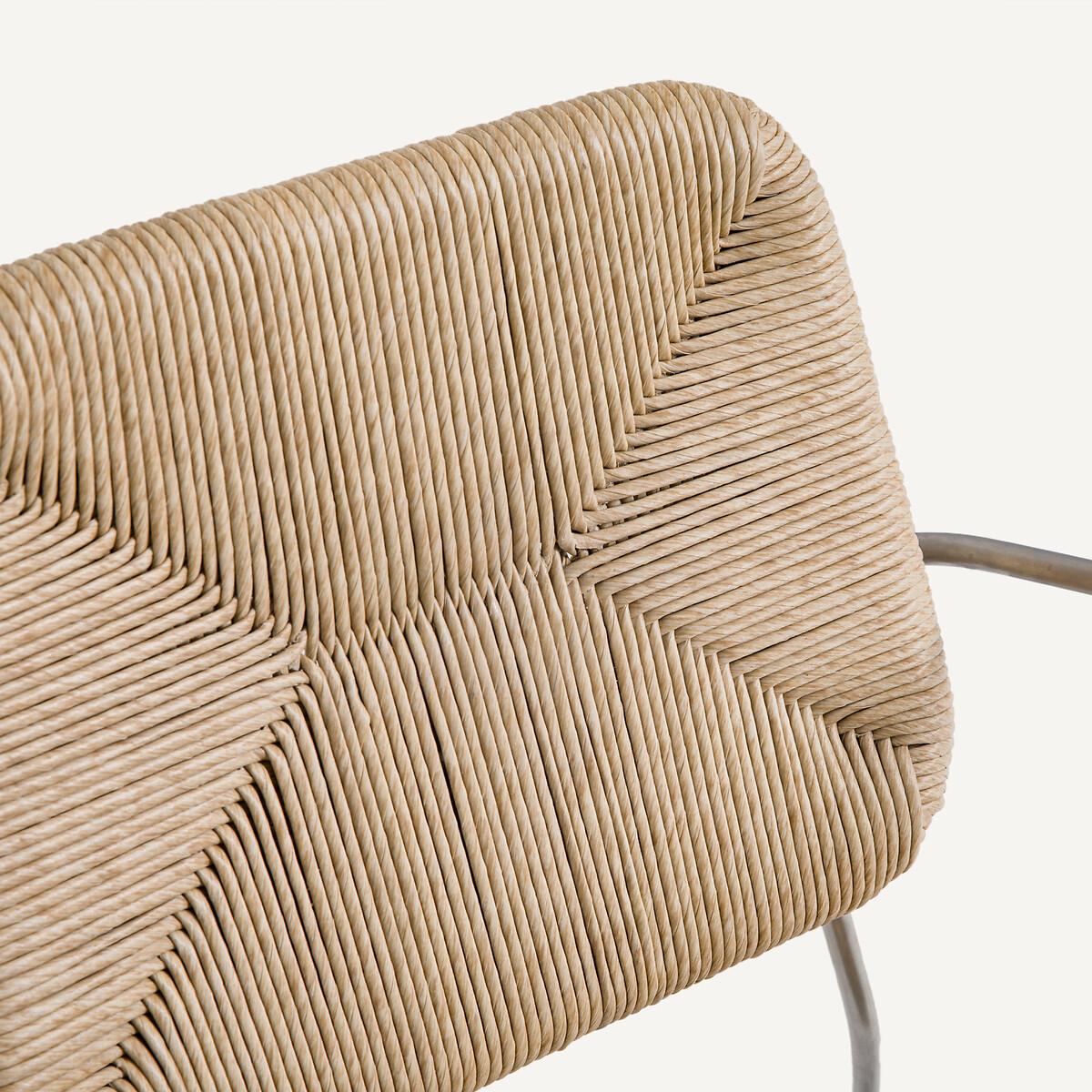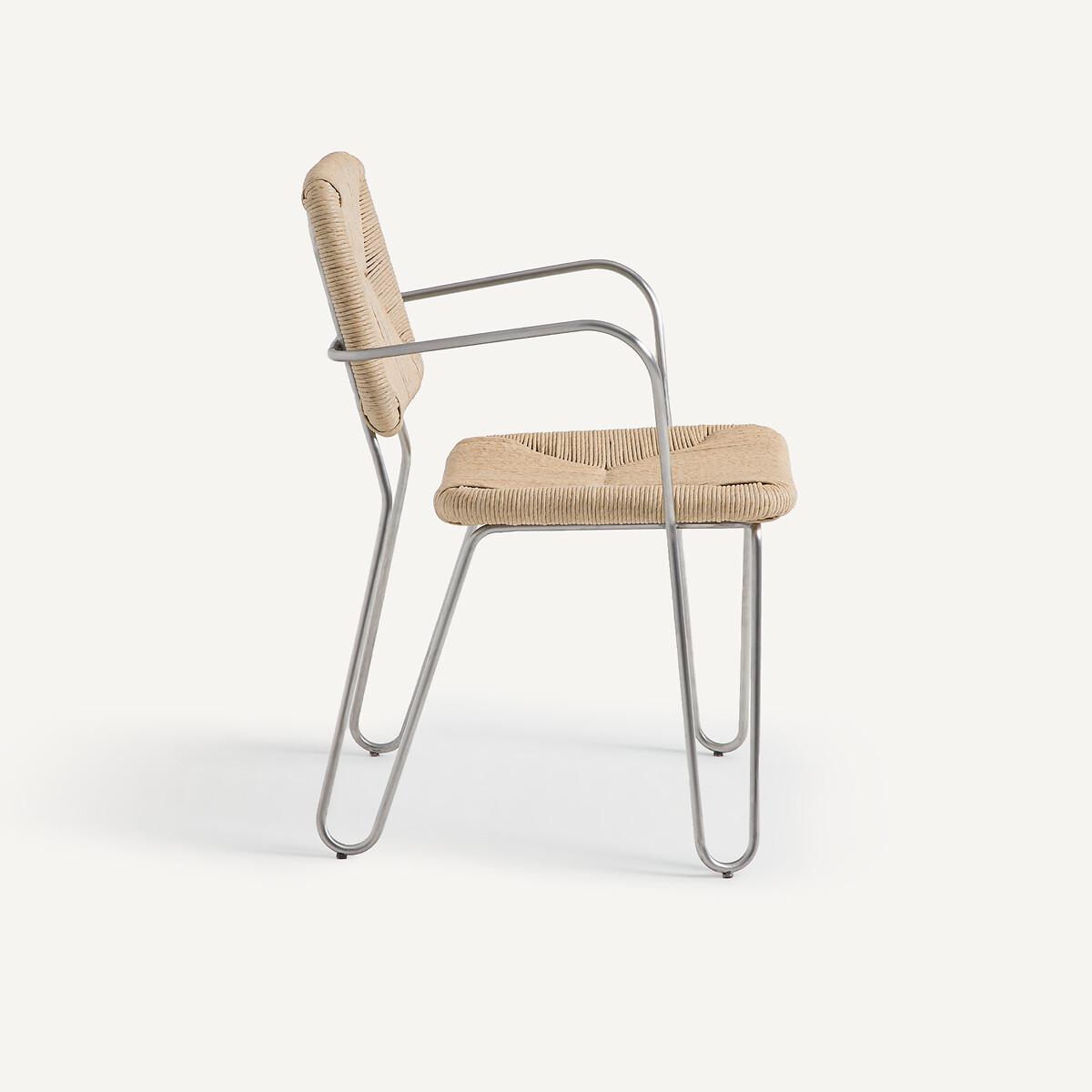 A comfortable and elegant dining chair that reinvents traditional straw seats with a contemporary twist. Its synthetic weave, available in natural or dark grey, gives it a warm, refined texture. With its lightweight yet sturdy metal frame, this chair is equally at home indoors or outdoors, for practical, timeless use. The Pause dining chair is part of the "Nomad Escape" collection designed by Otto, an agency founded by architect and designer Paola Navone. Led by Cristina Pettenuzzo and Domenico Diego, this collection has a bold and unique identity, transforming the home into an bright and positive oasis of well-being for all seasons. Product Details • Seat and backrest in ecolene fibre, 100% polyethylene • Handcrafted braiding: Each piece is unique • Back and seat frame in epoxy-finish aluminium • Stainless steel legs and armrests. Dimensions • Width: 57cm • Height: 80cm • Depth: 58cm • Seat: L45 x H44.5 x D43cm • Weight: 5.5kg • Sold pre-assembled. Parcel Dimensions • 1 parcel • L62 x H83 x D60cm. 9.5kg