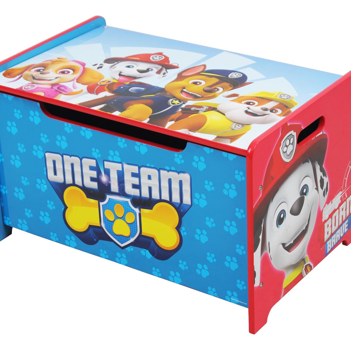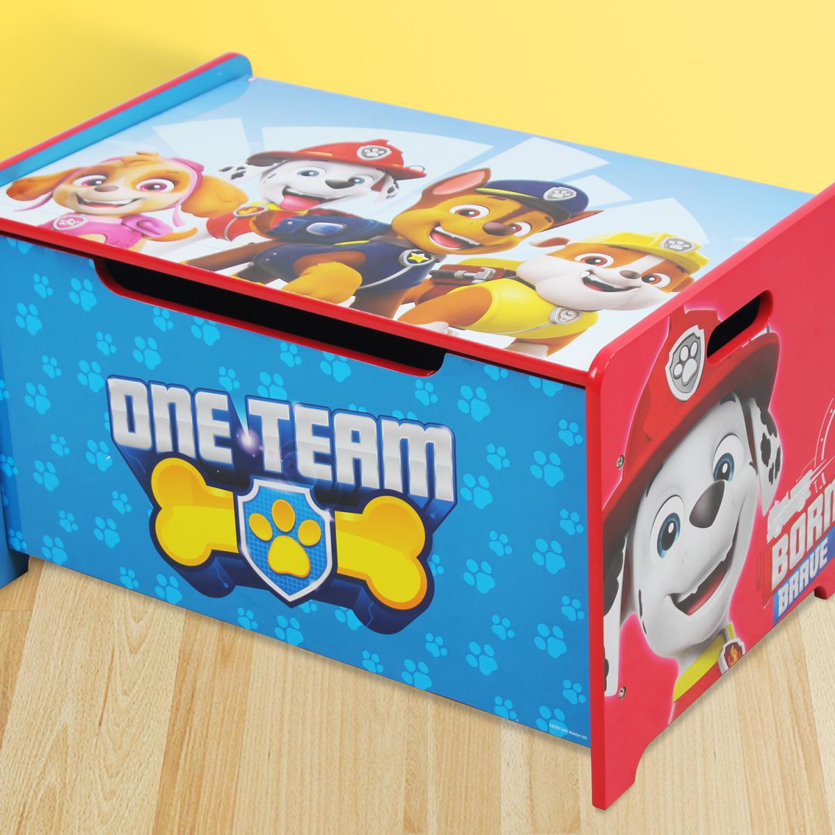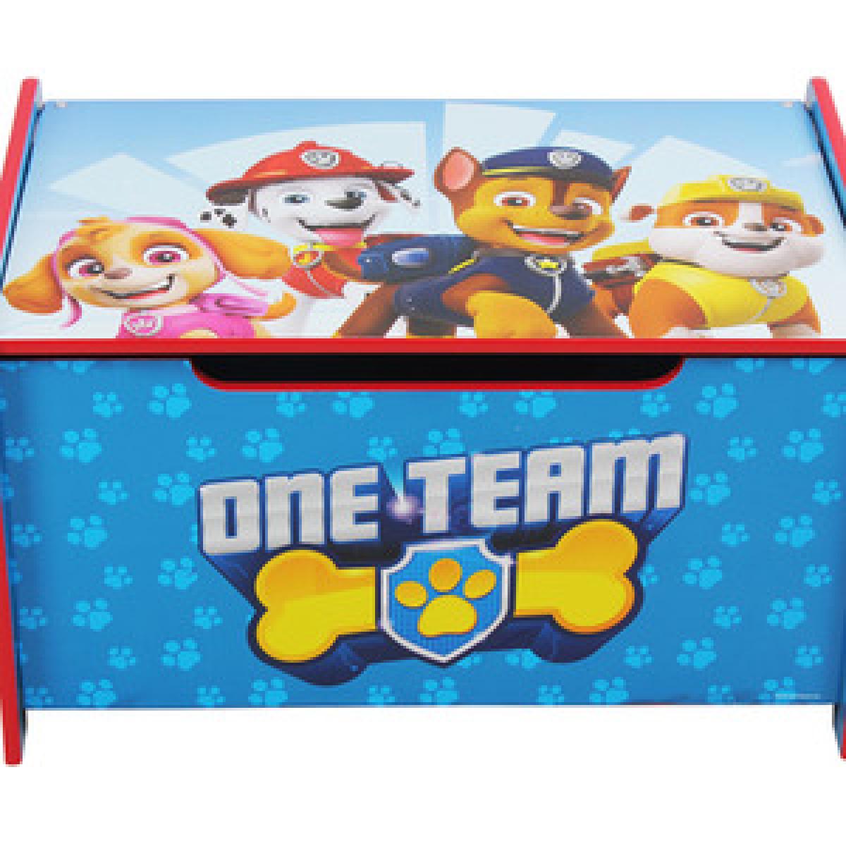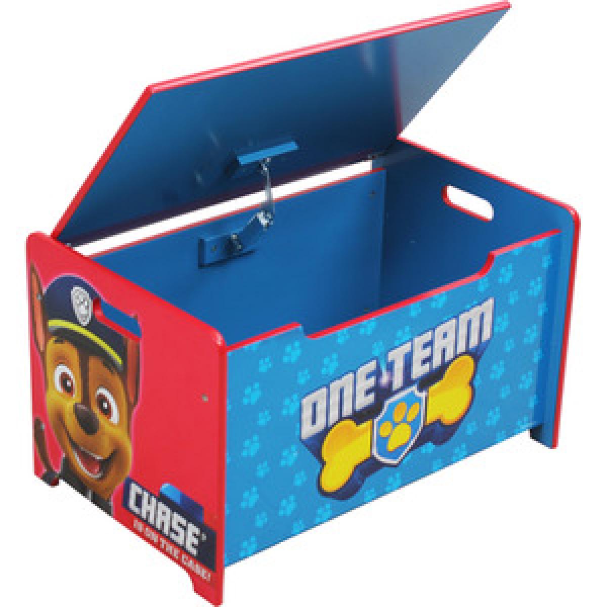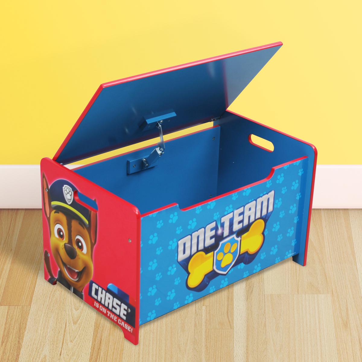 Keep their room clean with this Deluxe Paw Patrol Wooden Toy box. Featuring colourful graphics of Marshall Chase plus durable wood construction, it's designed with rounded corners, smooth edges and a slow-closing lid for child safety. The deluxe toy box also doubles up as a bench to sit on. Perfect for display in any playroom or bedroom.