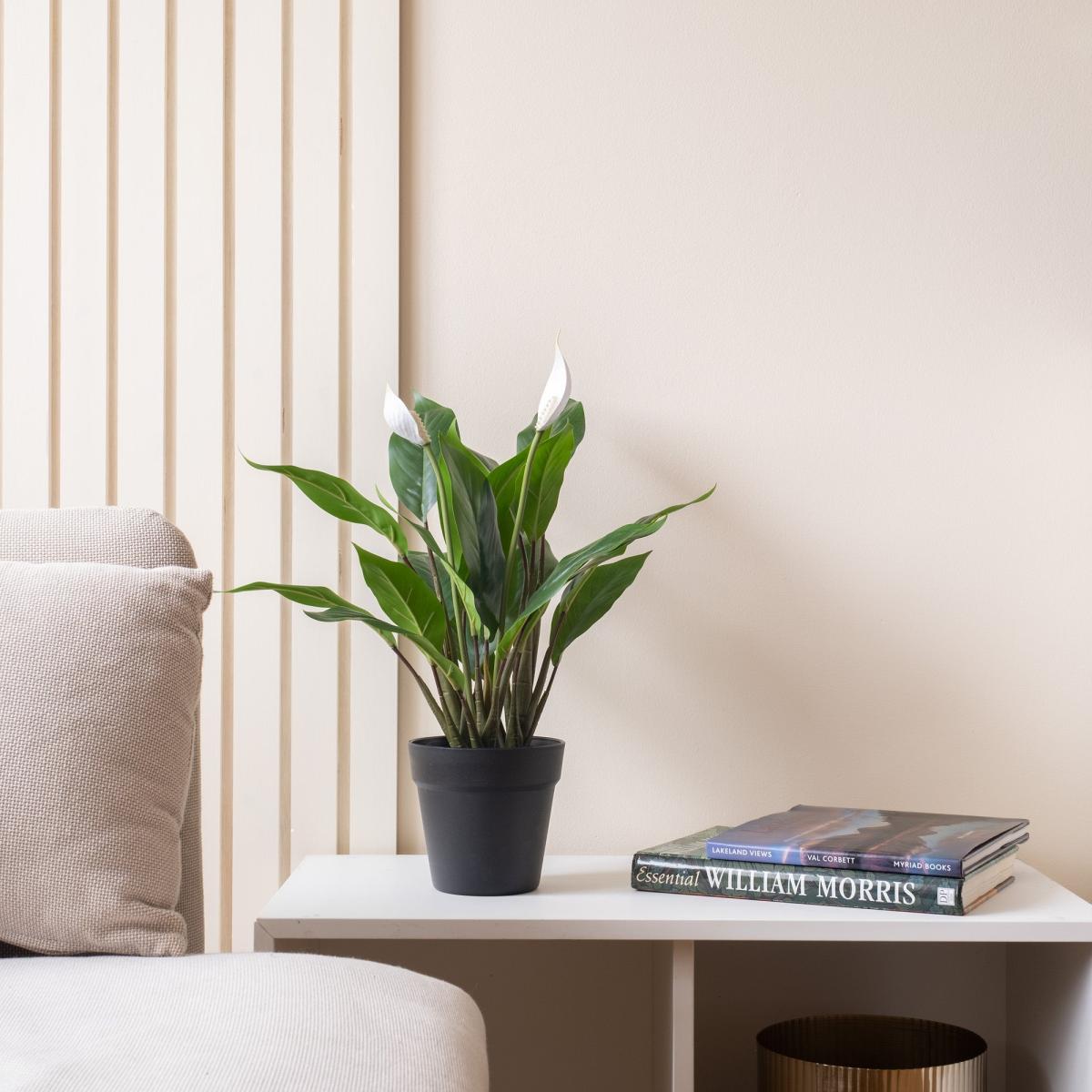 * Artificial lily plant* Includes a fitted plant pot* No maintenance needed* For indoor use only This beautiful artificial peace lily plant has been designed to require no maintenance, so you don't have to worry about watering the plant. It comes complete with a sleek black plastic plant pot, however this would look fabulous in a plant pot of your own choice! Please note: This plant is for indoor use only.